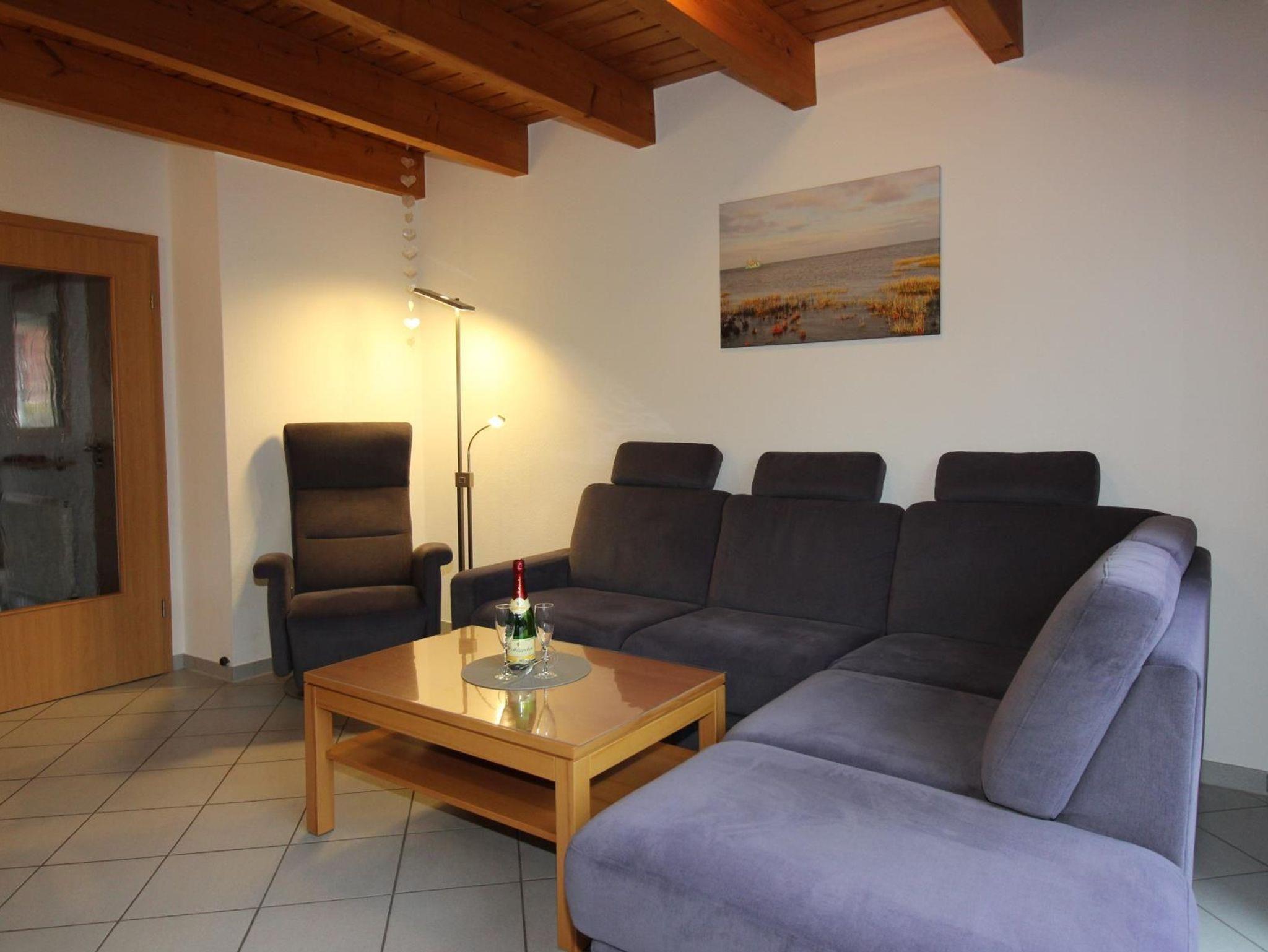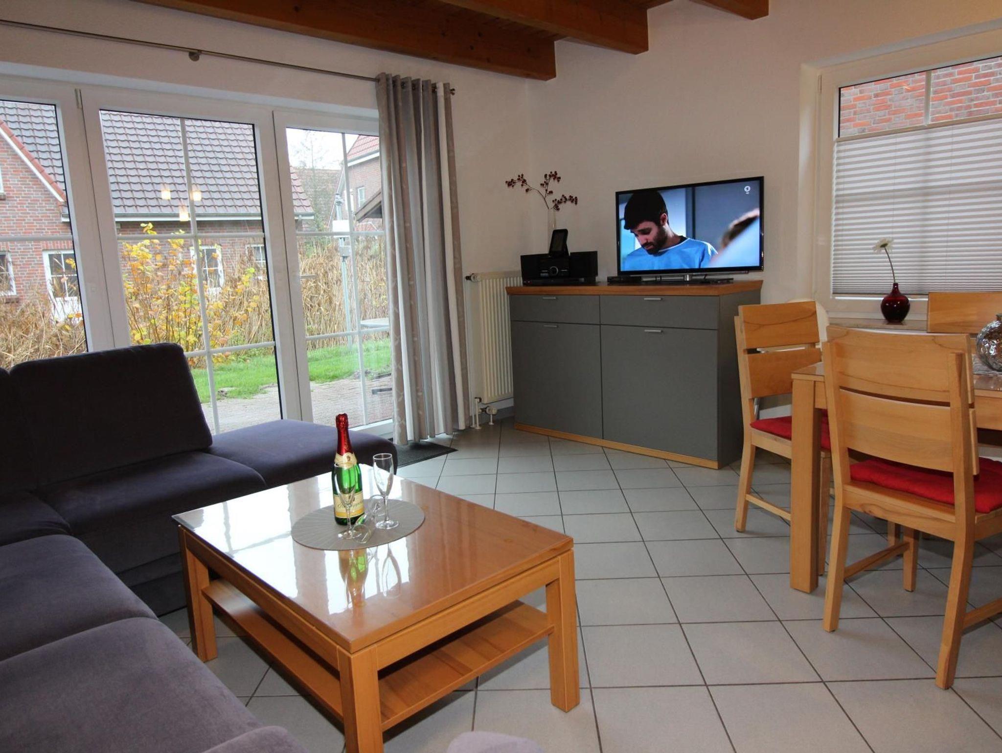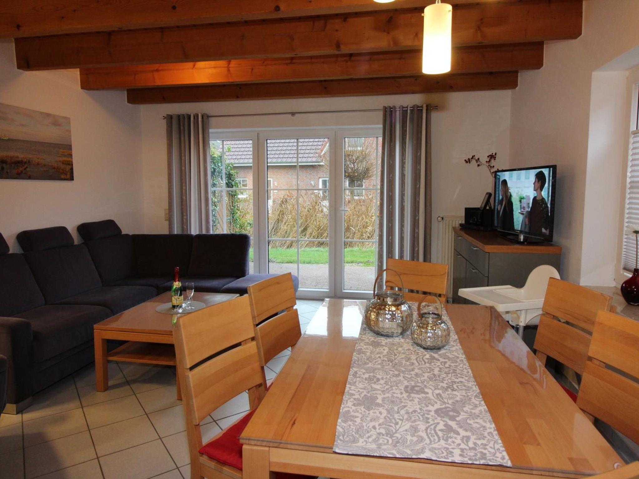 Ein Esstisch mit sechs Stühlen und zwei Kinderhochstühlen verbindet die Küche mit dem offenen Wohnbereich. Dieser ist mit großem Ecksofa, Tisch und mit einem Fernsehsessel ausgestattet. Zur Unterhaltung gehören ein großes Flachbild-TV-Gerät, DVD-Player und HiFi-Stereoanlage, sowie Bücher für Groß und Klein, Gesellschaftspiele und Kinderspielzeug.