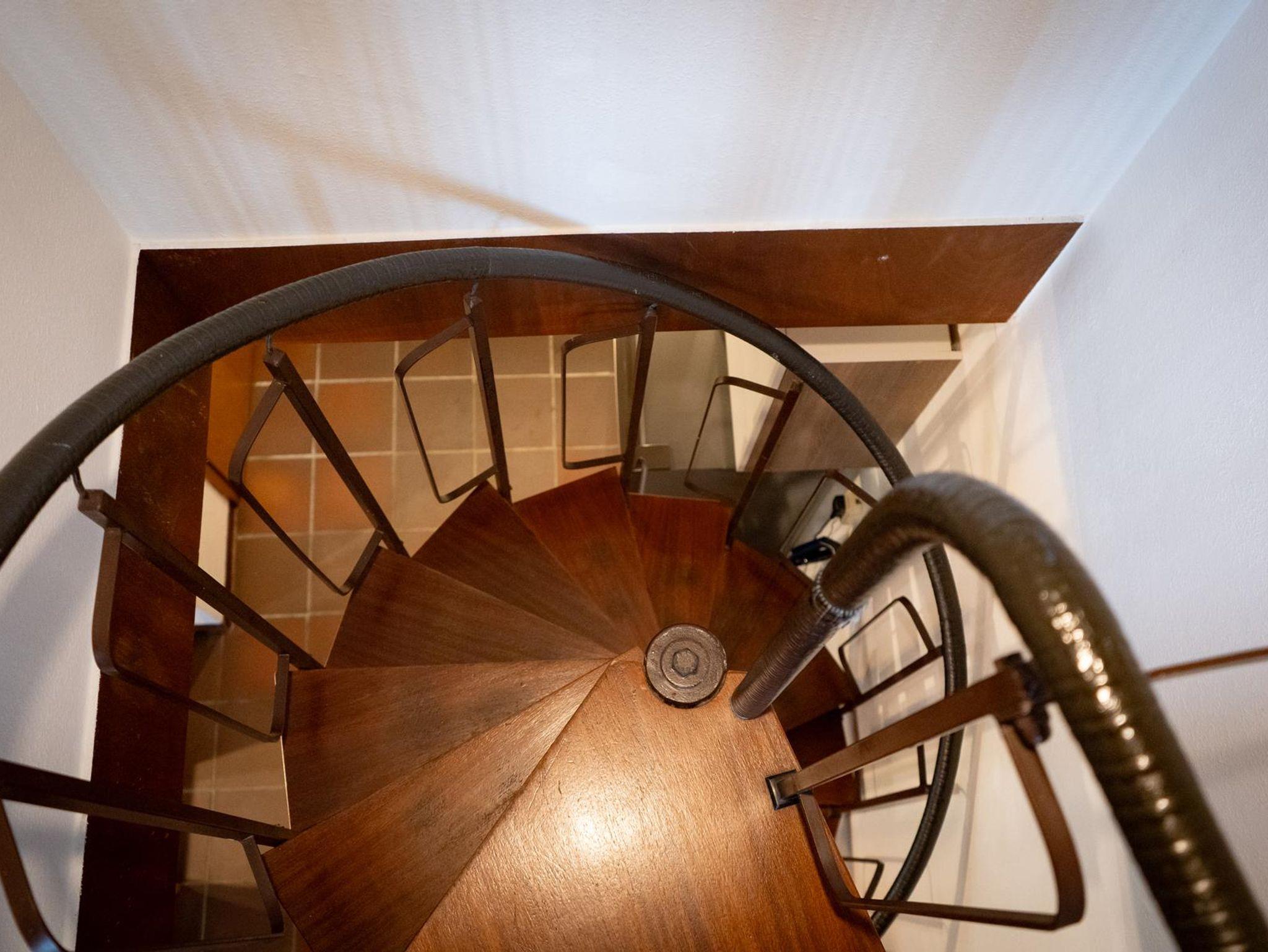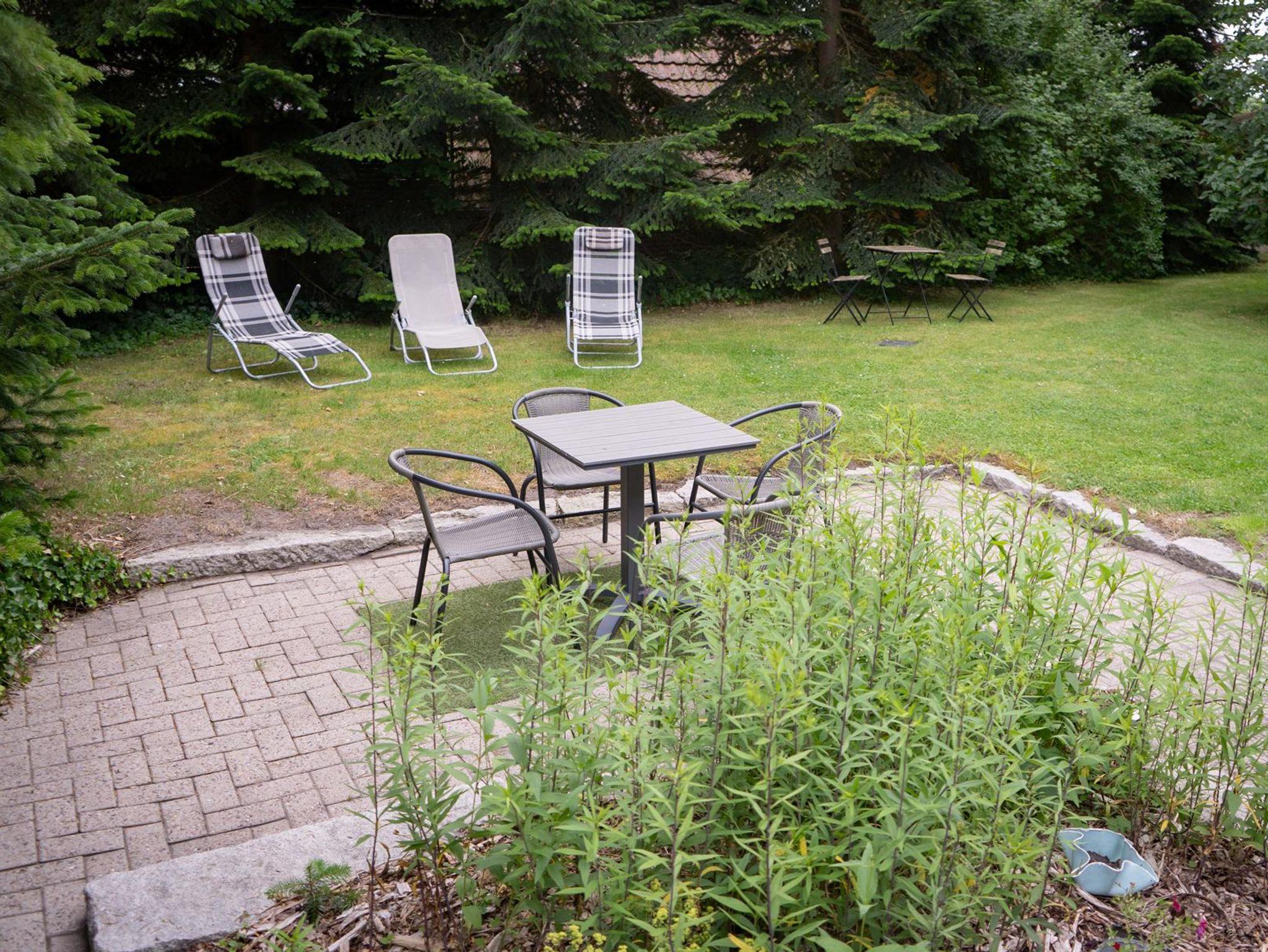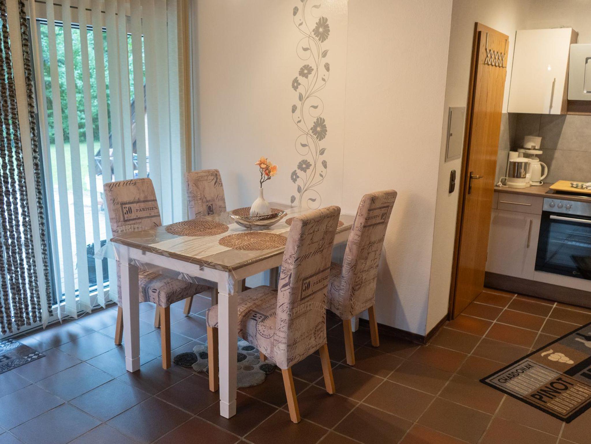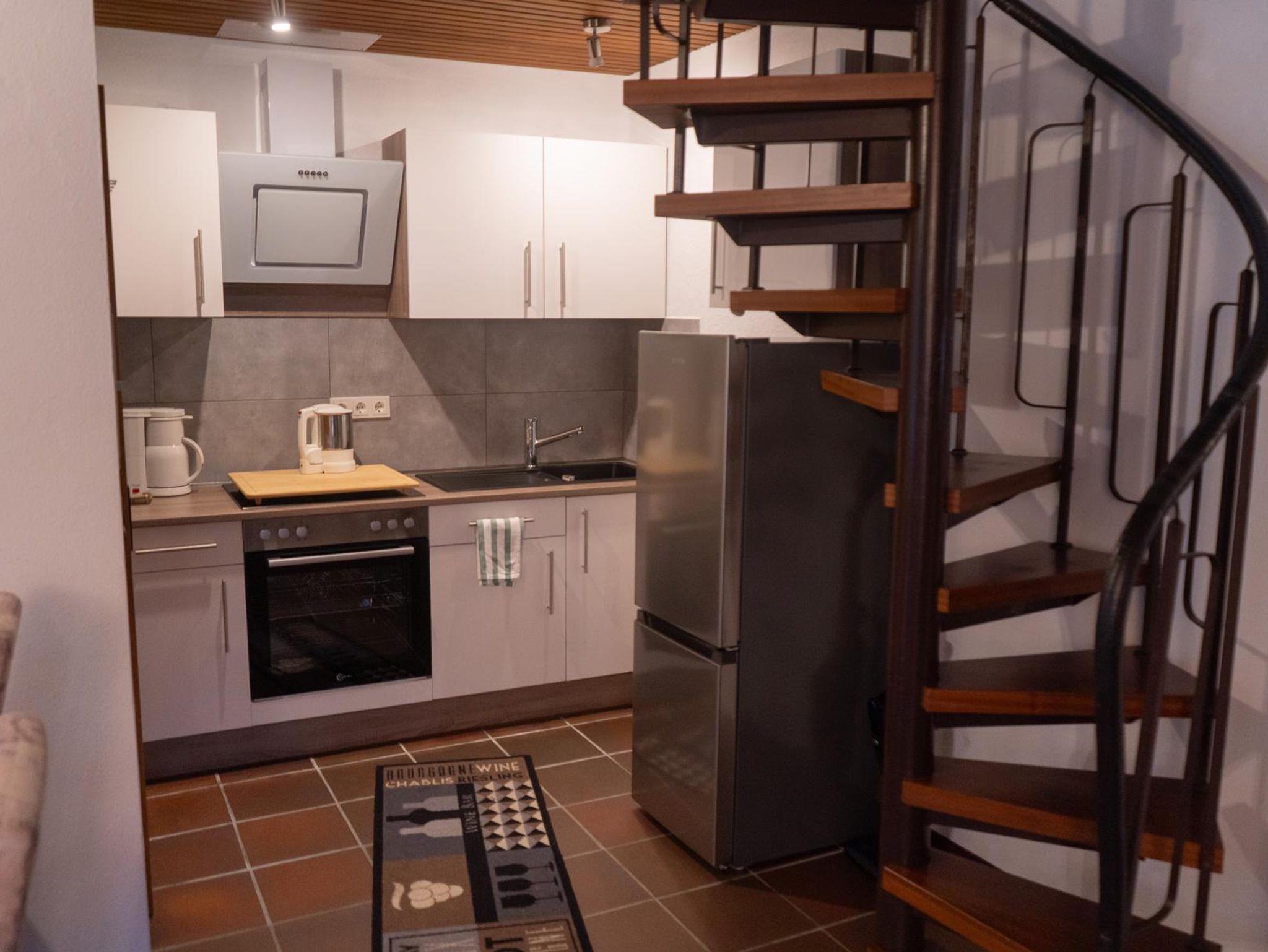 Die Ferienwohnung W2 (Ostlage) hat im Erdgeschoss ein Wohnzimmer (Sat-TV, Radio) mit Sitzecke, Kamin, Essecke und Küchenzeile (4-Plattenherd, Kaffeemaschine, Wasserkocher, Mikrowelle, Toaster) und ein Badezimmer mit Dusche und WC. Eine Wendeltreppe führt ins Obergeschoss mit zwei Schlafzimmern mit jeweils 2 zusammengestellten Couchbetten.