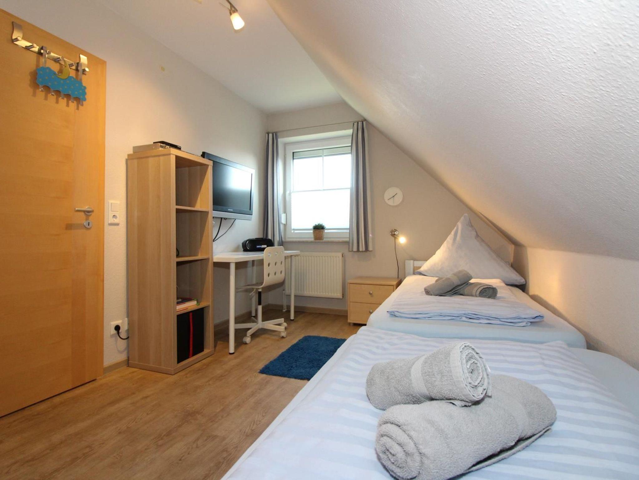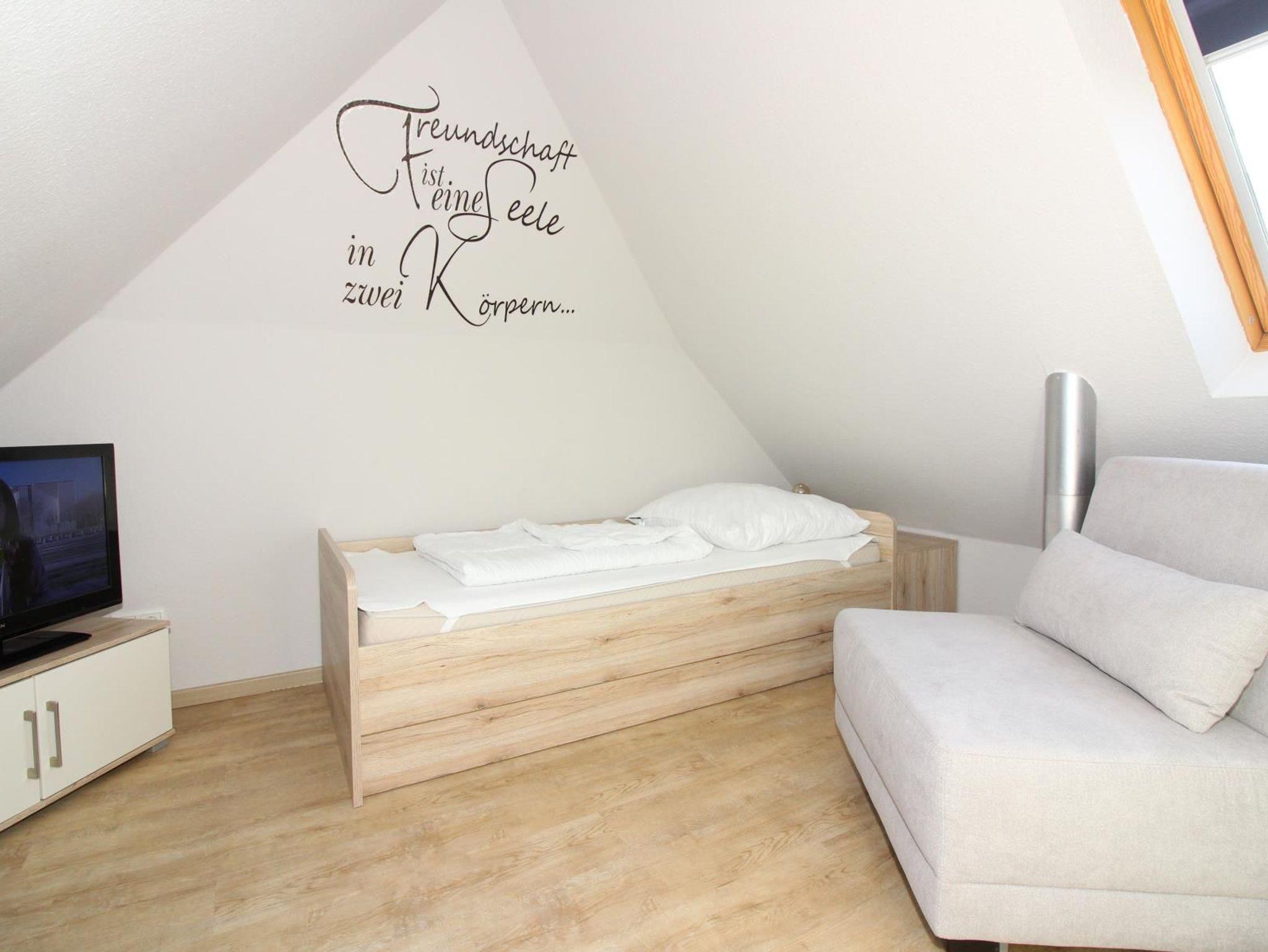 Das Haus hat einen Spitzboden, der zu einem Jugendzimmer mit TV ausgebaut wurde. Neben einem Einzelbett finden Sie hier einen Schlafsessel, der zu einem vollwertigen Bett mit Lattenrost ausgezogen werden kann.