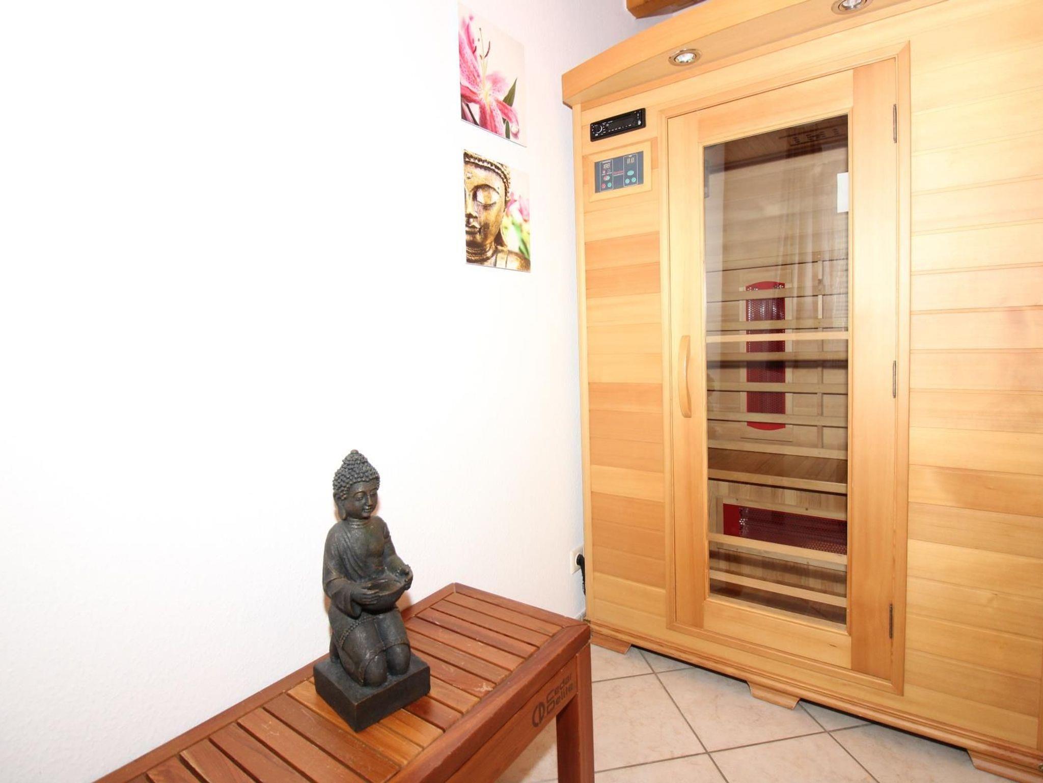 Im separaten Raum im EG ist eine Infrarotkabine eingebaut. Dieses Modell aus Hemlockholz bietet Platz für zwei Personen. Infrarot-Tiefenwärme genießen Sie über fünf integrierte Keramikstrahler. Integriert ist ein LED Farblicht sowie ein Radio-CD-System.