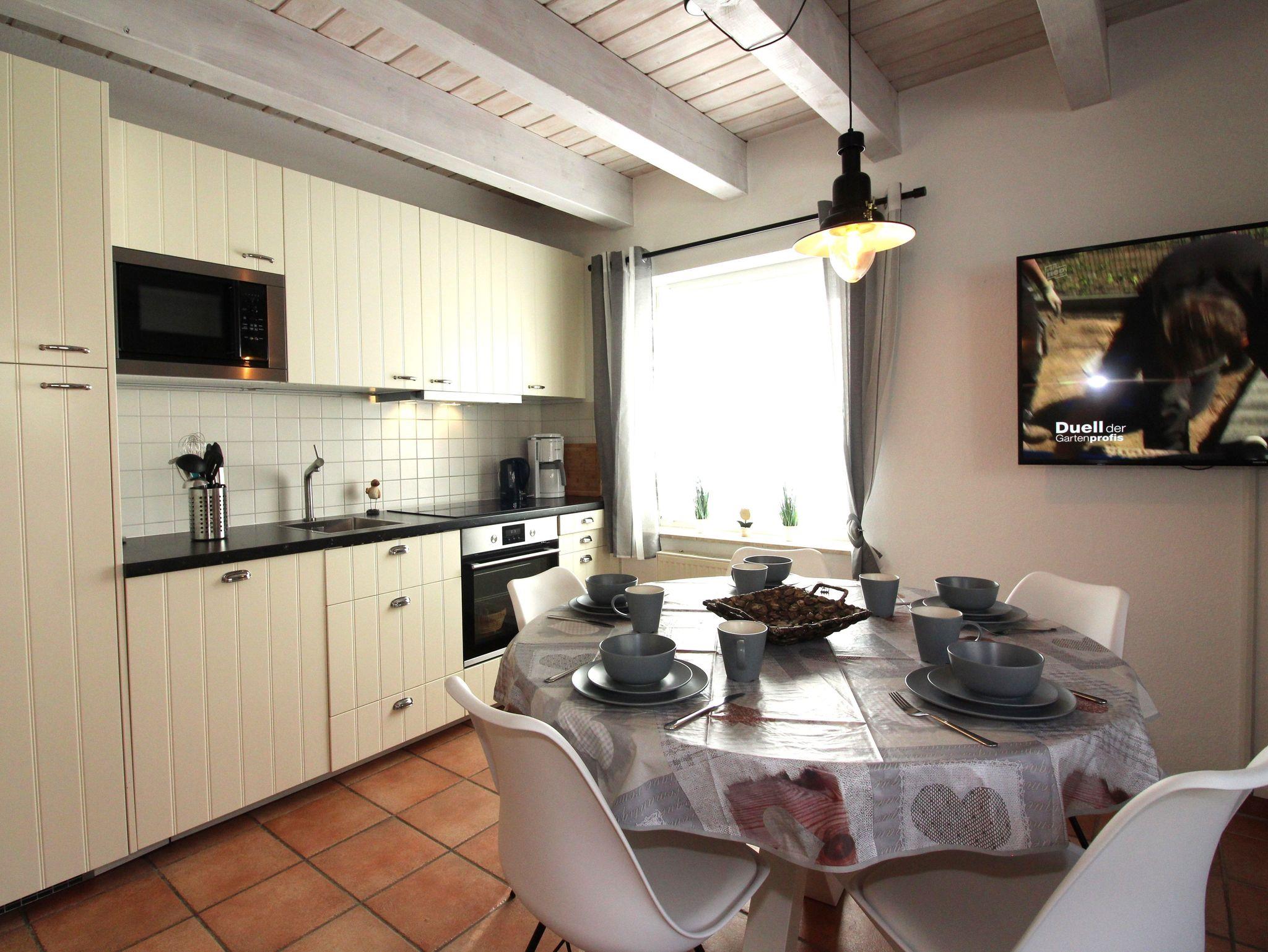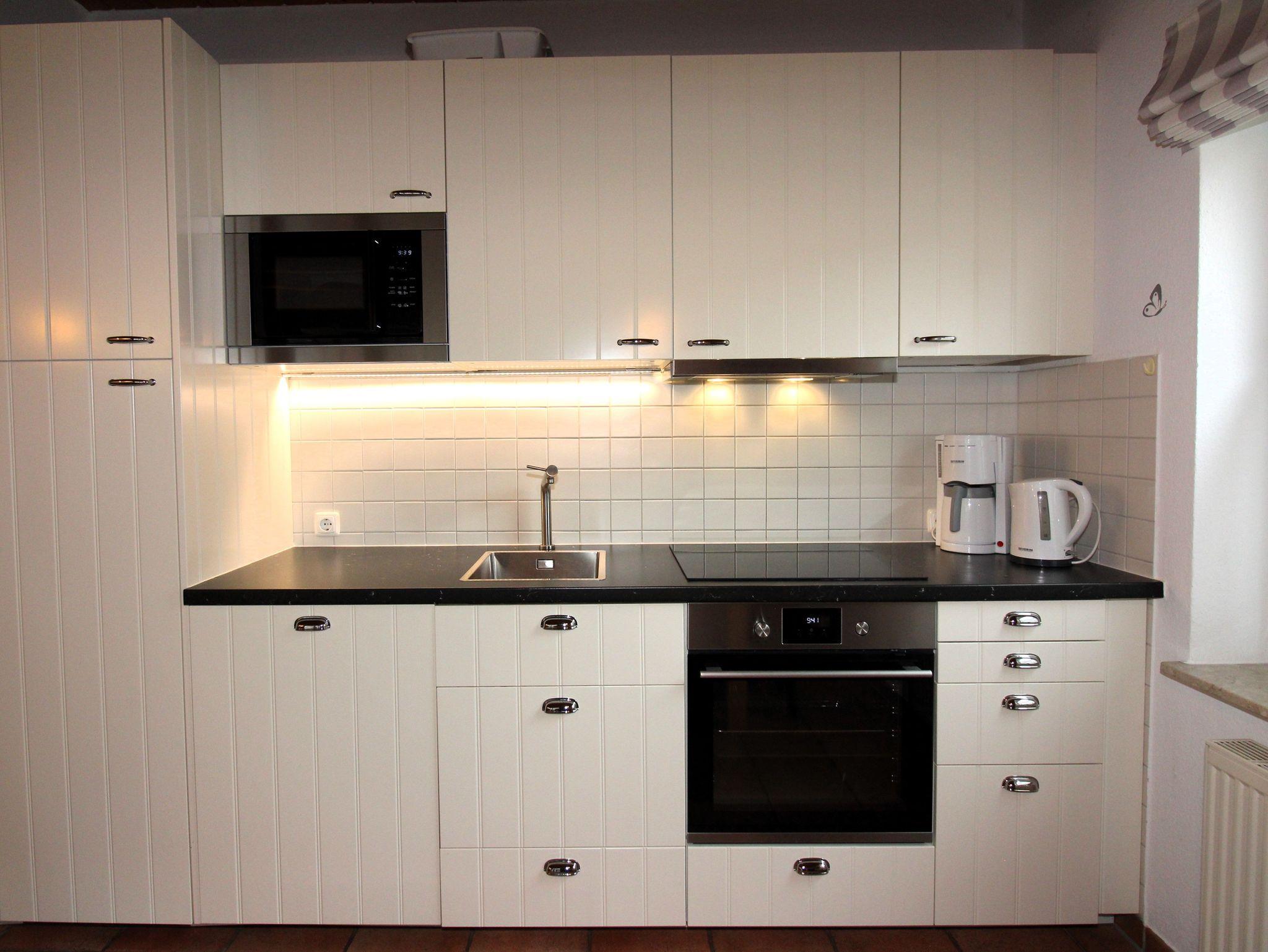 Die Küche ist voll ausgestattet. In die Küchenzeile sind ein Kühlschrank mit integriertem Gefrierfach, ein Geschirrspüler, ein Kochfeld mit vier Ceranfeldern / Backofen und ein Mikrowellengrill eingebaut. Geschirr und Besteck sind für je 12 Personen vorhanden. Desweiteren gibt es Kindergeschirr und -besteck für die Kleinen.