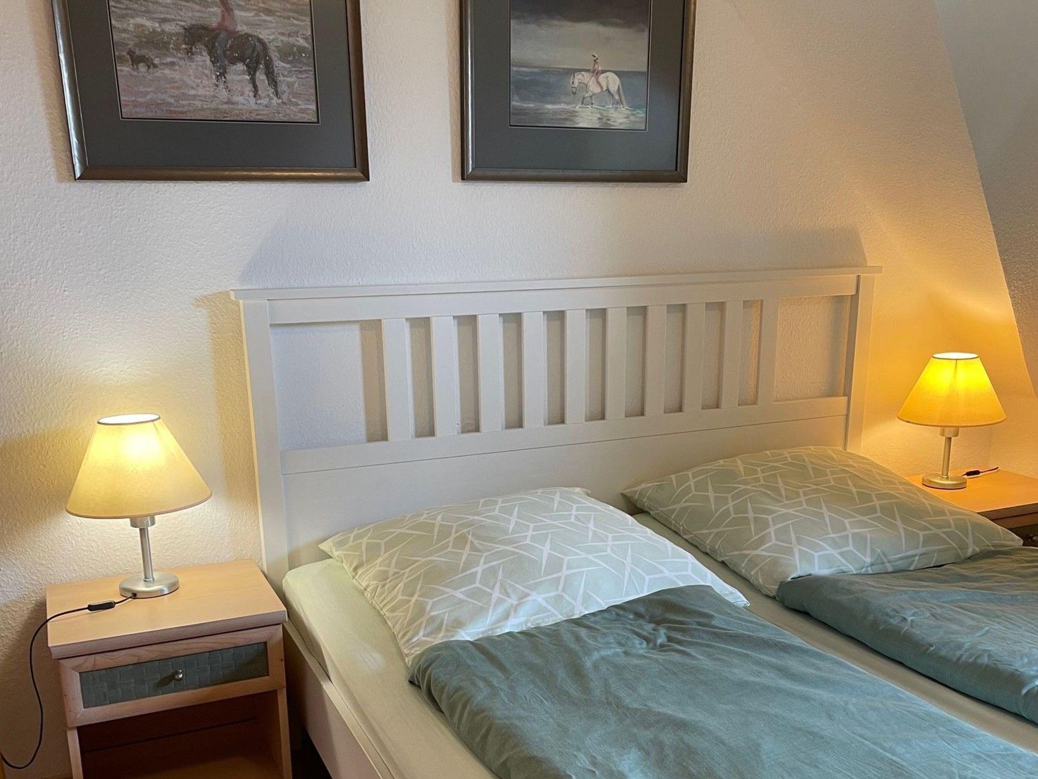 Das 1. Schlafzimmer ist mit einem Doppelbett (180 cm x 200 cm) und einem festen Kindergitterbett (60 cm x 120 cm) ausgestattet.
