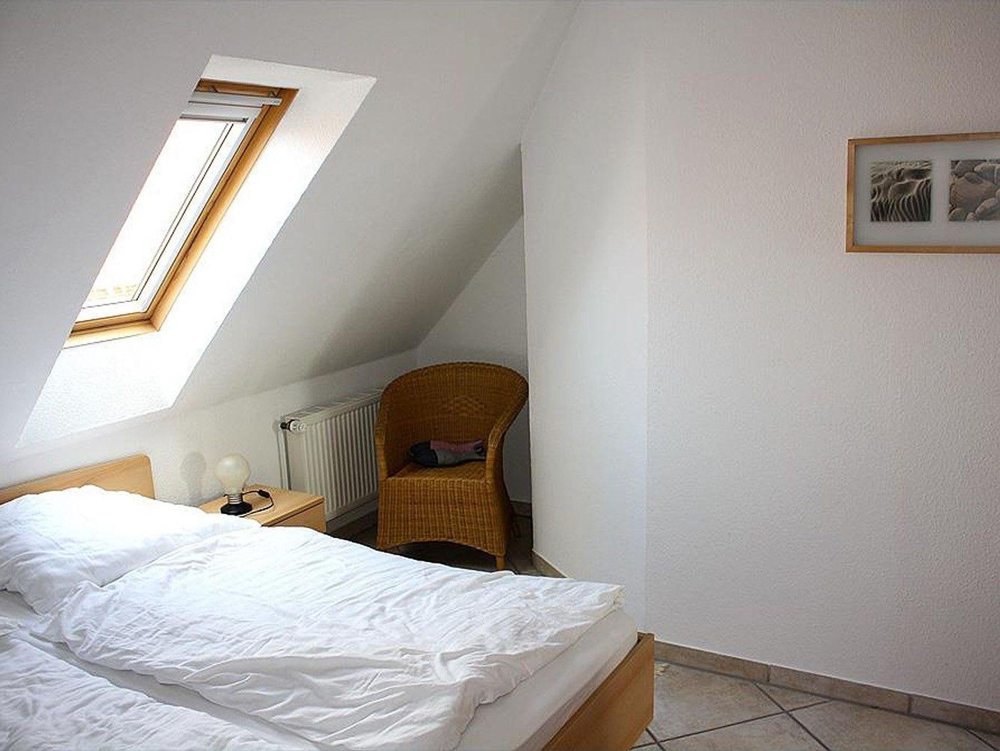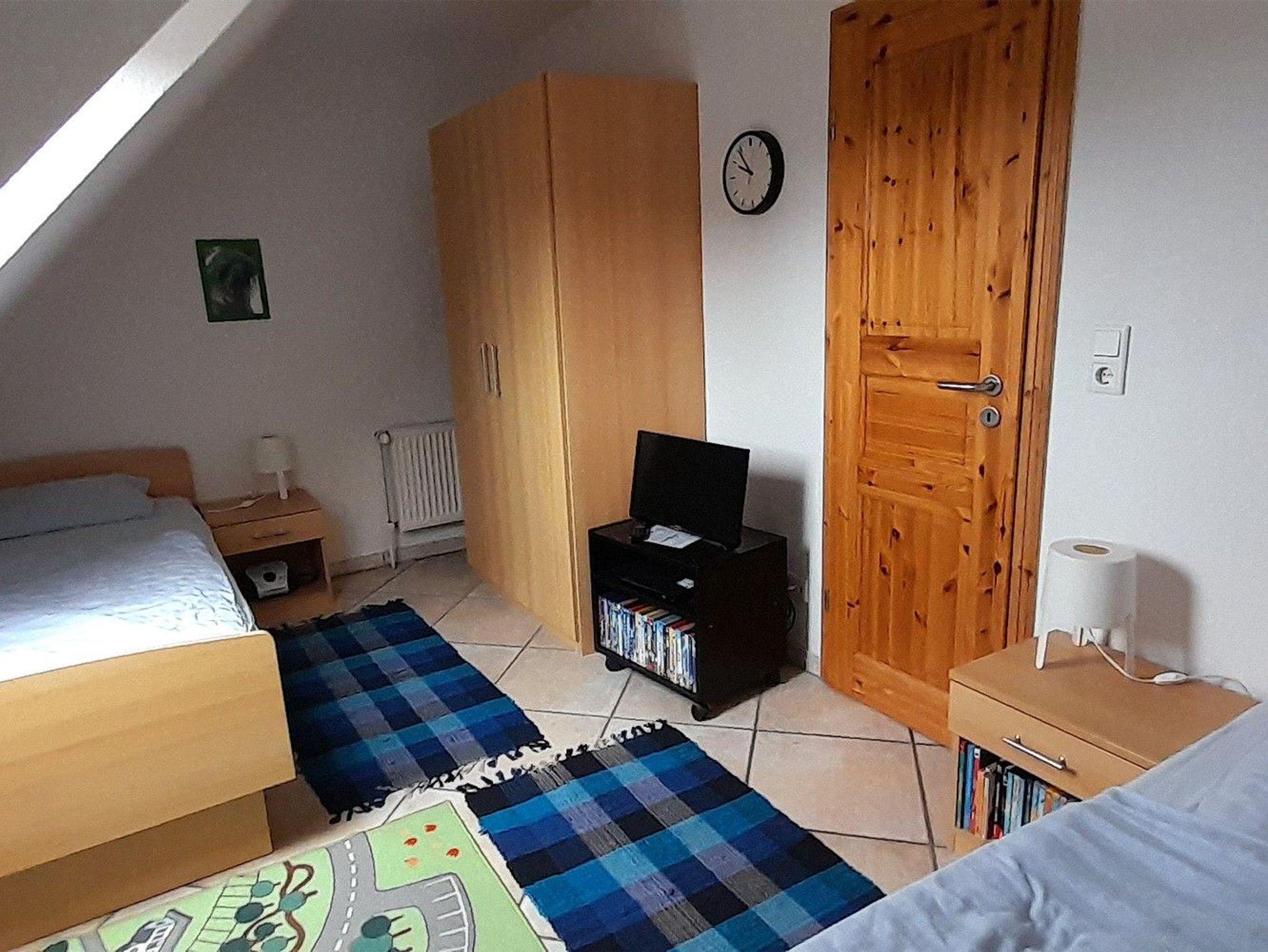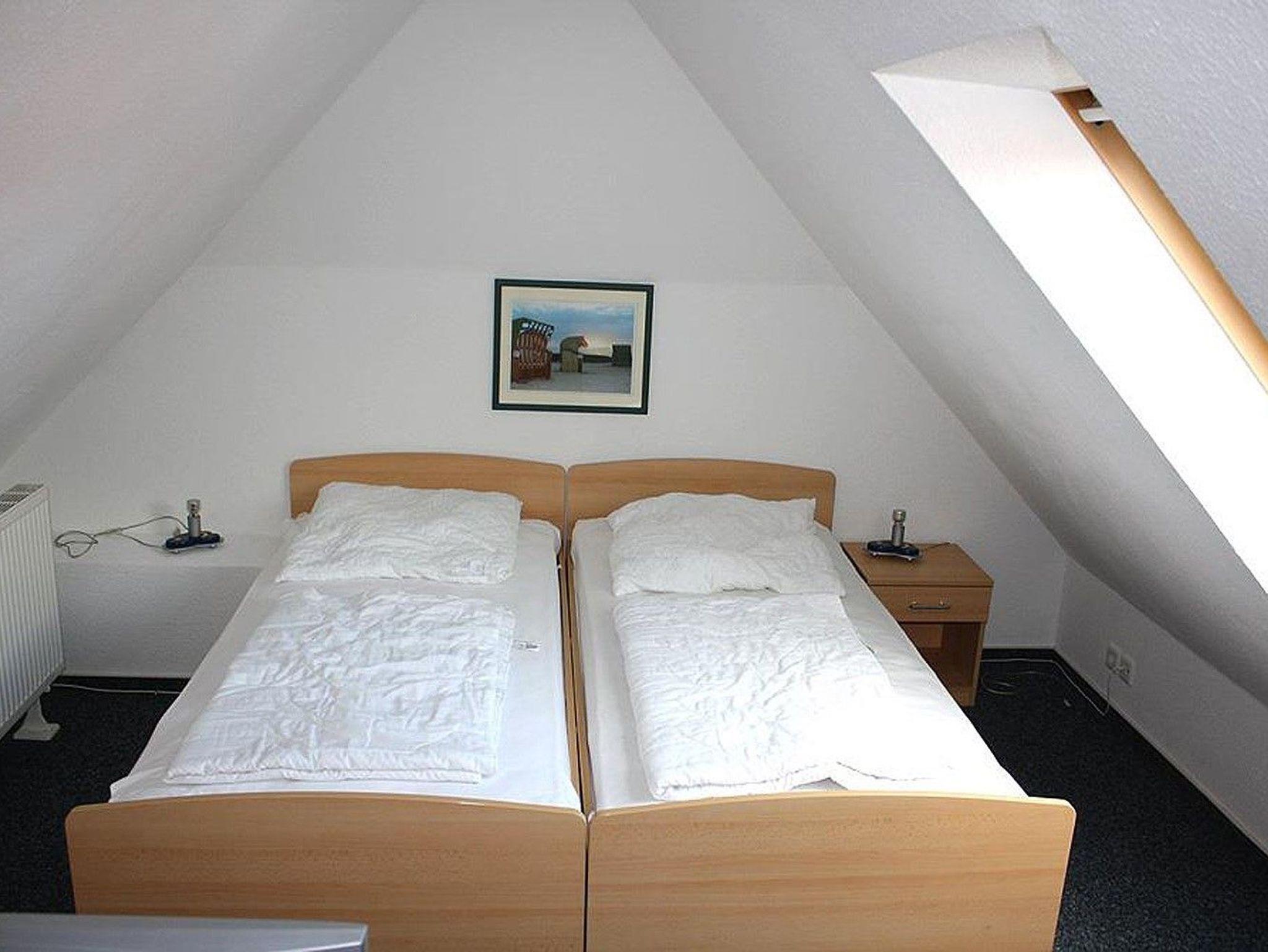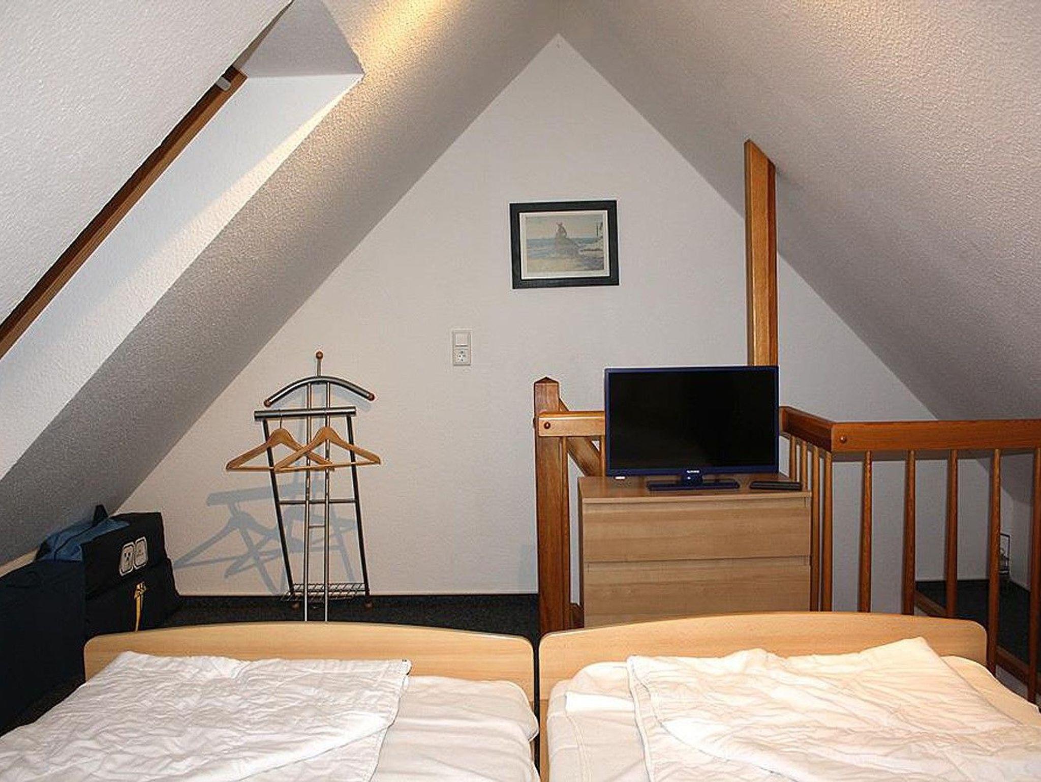 ein Schlafraum mit zwei nebeneinanderstehenden Einzelbetten im ausgebauten Dachgeschoss / Studio, LED-HD-Fernseher mit Digital-Kabel-TV sowie Radio
