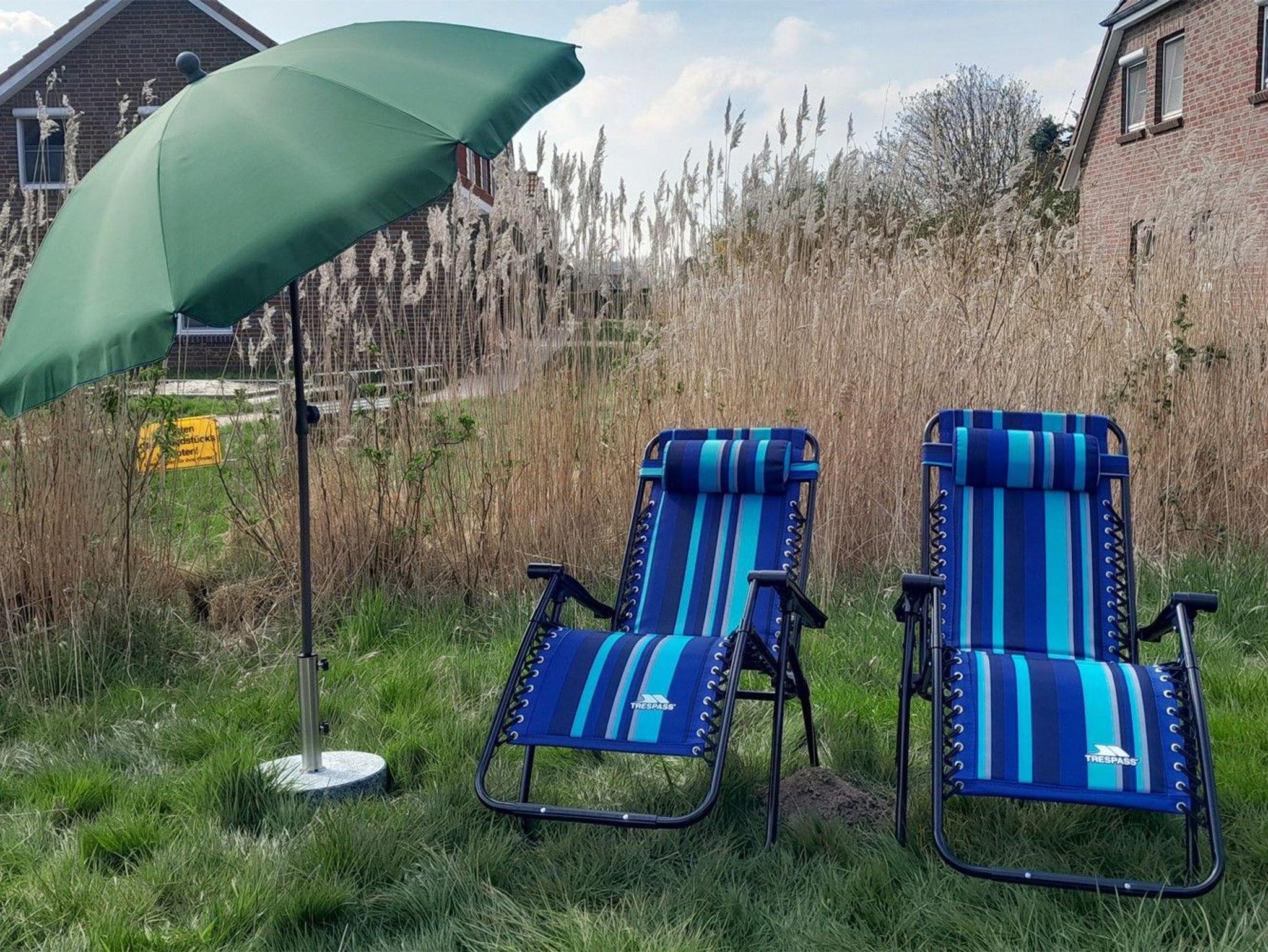Sonnenterrasse: Tisch & Sonnenschirm, sechs Gartenstühle & Auflagen, Grill, Wäscheständer & Klammern, Spielzeug, zwei Sonnenliegen
