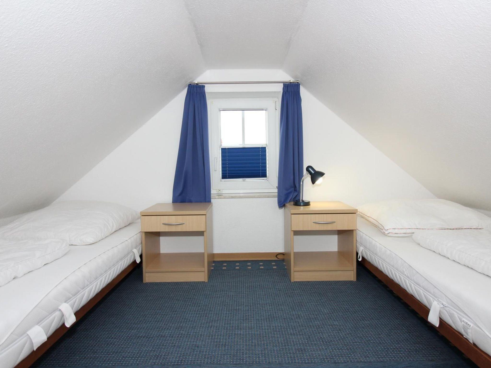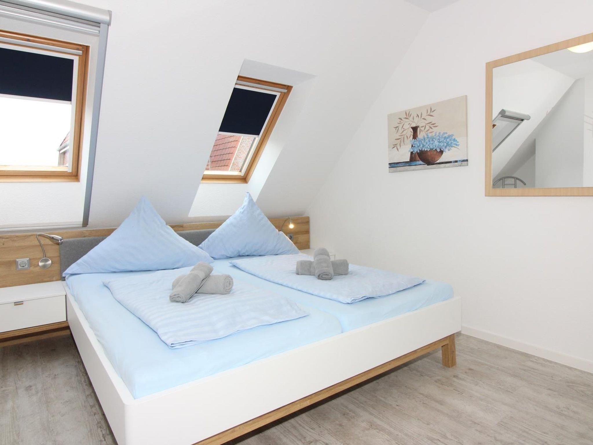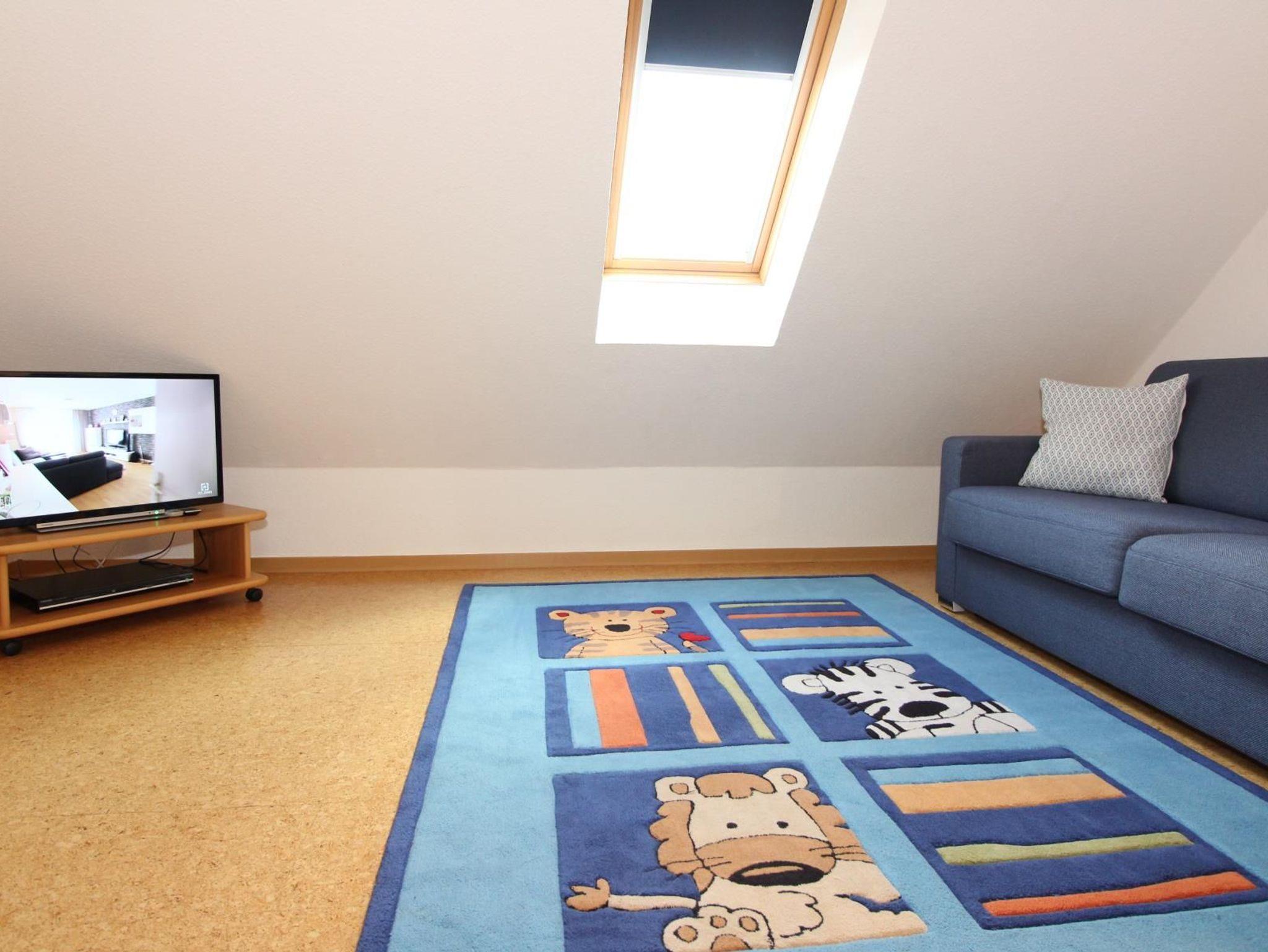 Das Dachgeschoss mit dem ausgebauten Erker erreichen Sie über eine normal begehbare Treppe. Sie führt Sie in einen Spielbereich für die Kleinen mit einem ausklappbaren Schlafsofa. Hier kann sich auch ein Großer weit weg vom Treiben im Erdgeschoß ausruhen. Man findet hier oben diverse Spiele, Bücher, ein Radio mit CD-Player, USB - und Bluetooth - Anschluß und einen zusätzlichen Flachbild-TV mit DVD-Player. Im Erker daneben schließt sich ein Schlafraum mit zwei Betten für den Nachwuchs an.