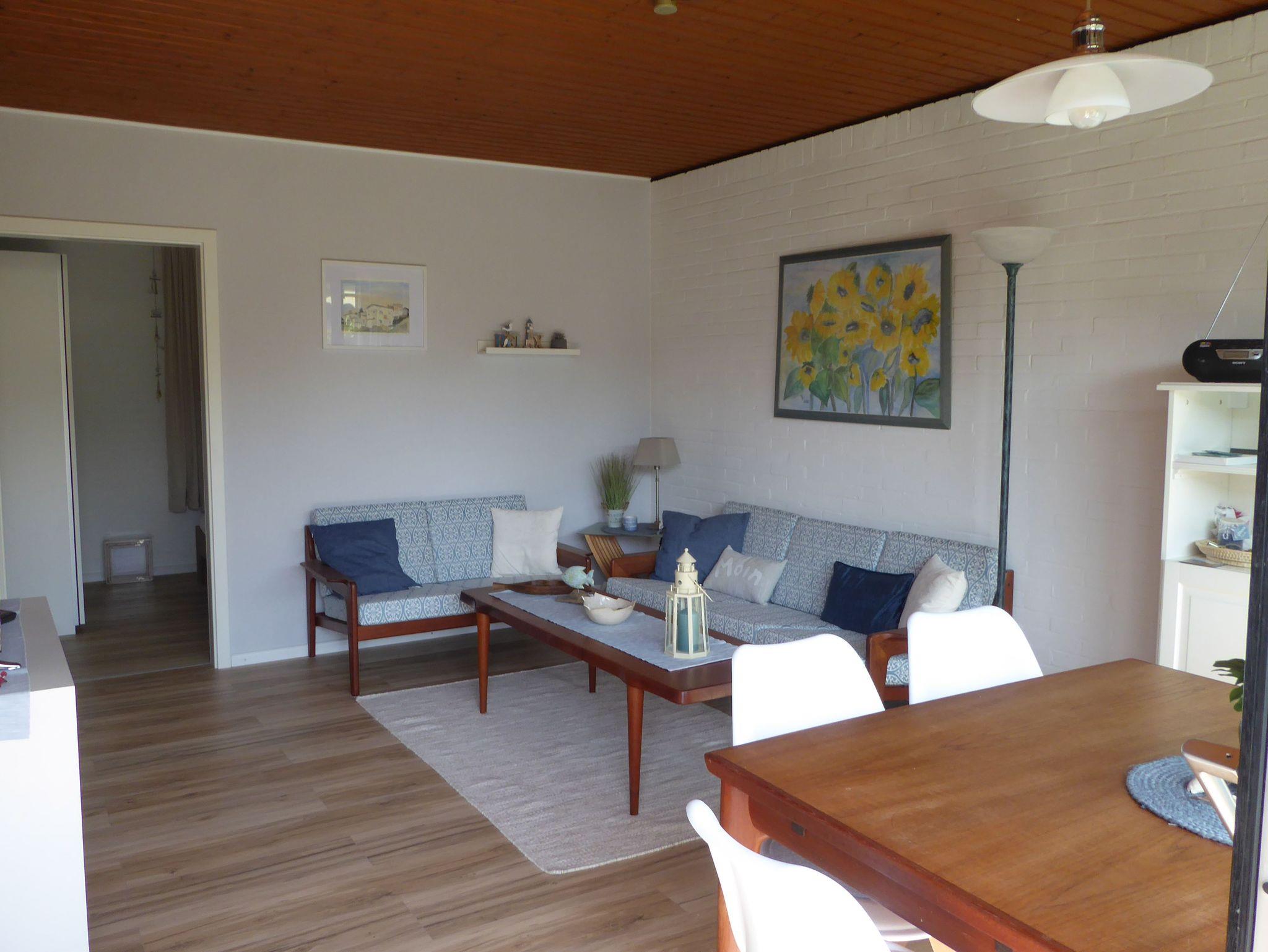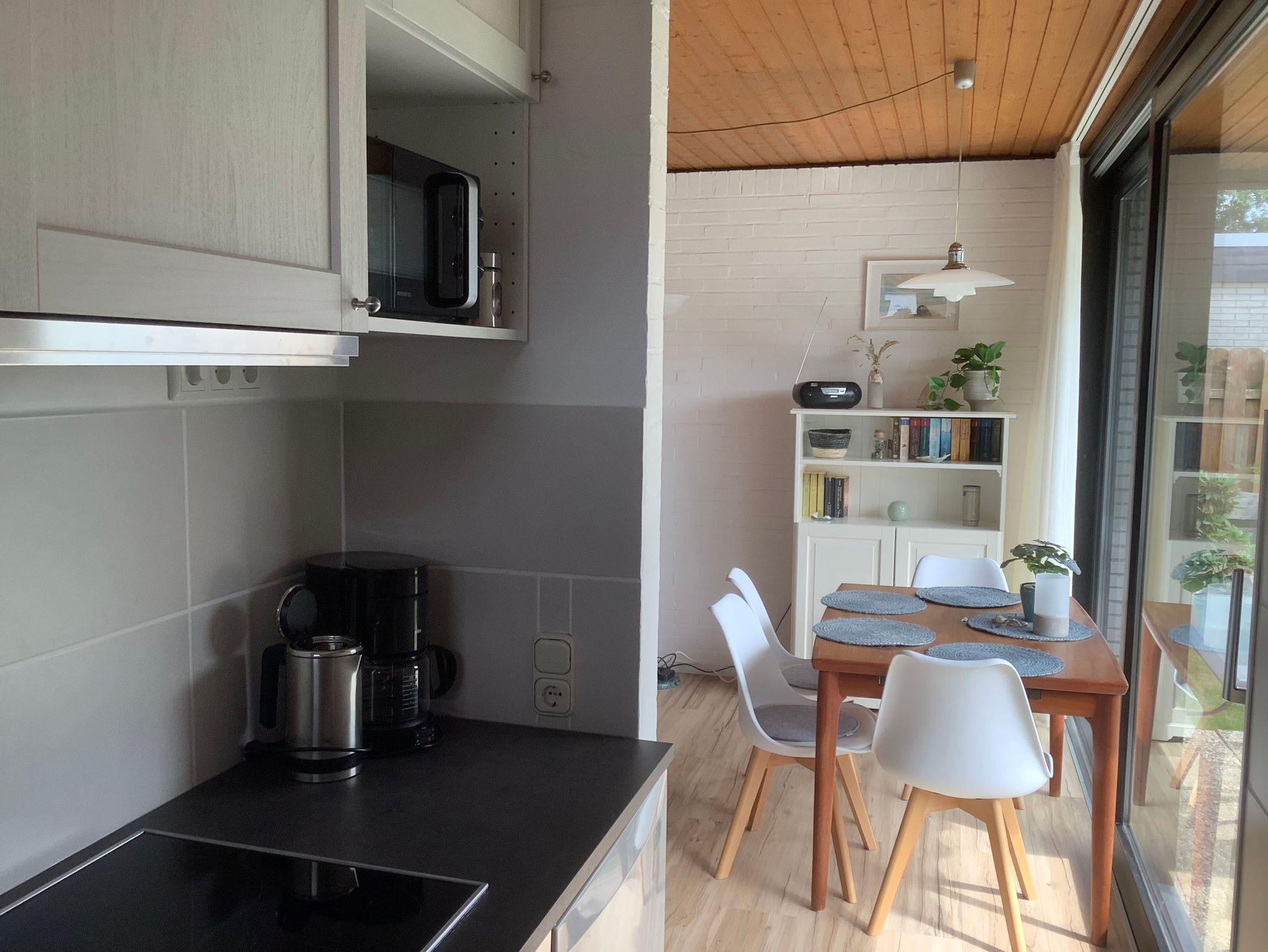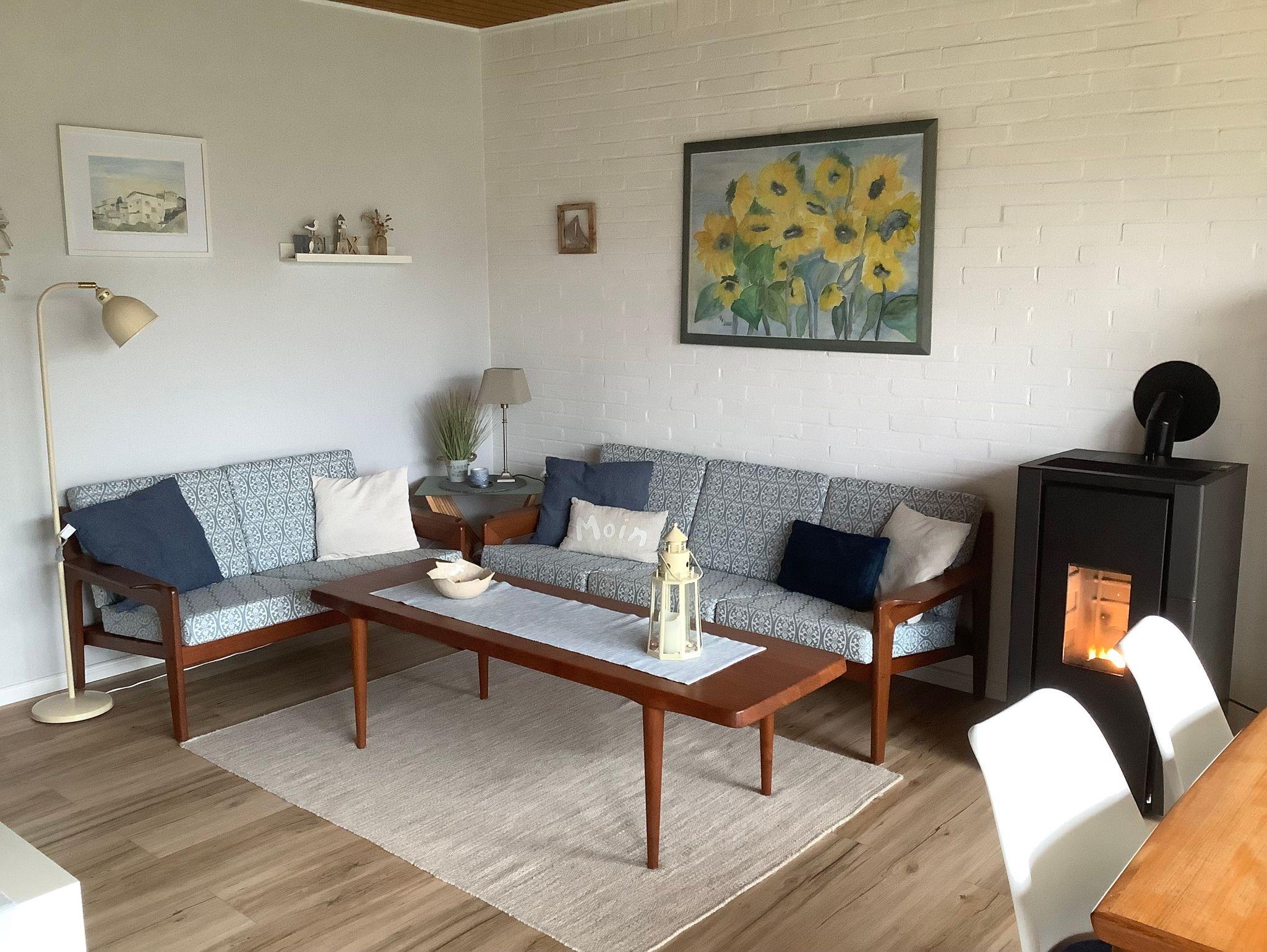 Neben einer gut eingerichteten Küche mit Geschirrspüler, E-Herd, Mikrowelle Kaffeemaschine, Wasserkocher und Toaster, erwartet Sie zusätzlich ein Flachbildfernseher im Wohnbereich, Radio mit MP3-Spieler, zwei Sofas und eine Waschmaschine. Im Wohnzimmer ist 2025 ein Pelletofen angeschlossen worden. Damit kann wie mit einem Kaminofen eine gemütliche Wärme erzeugt werden.