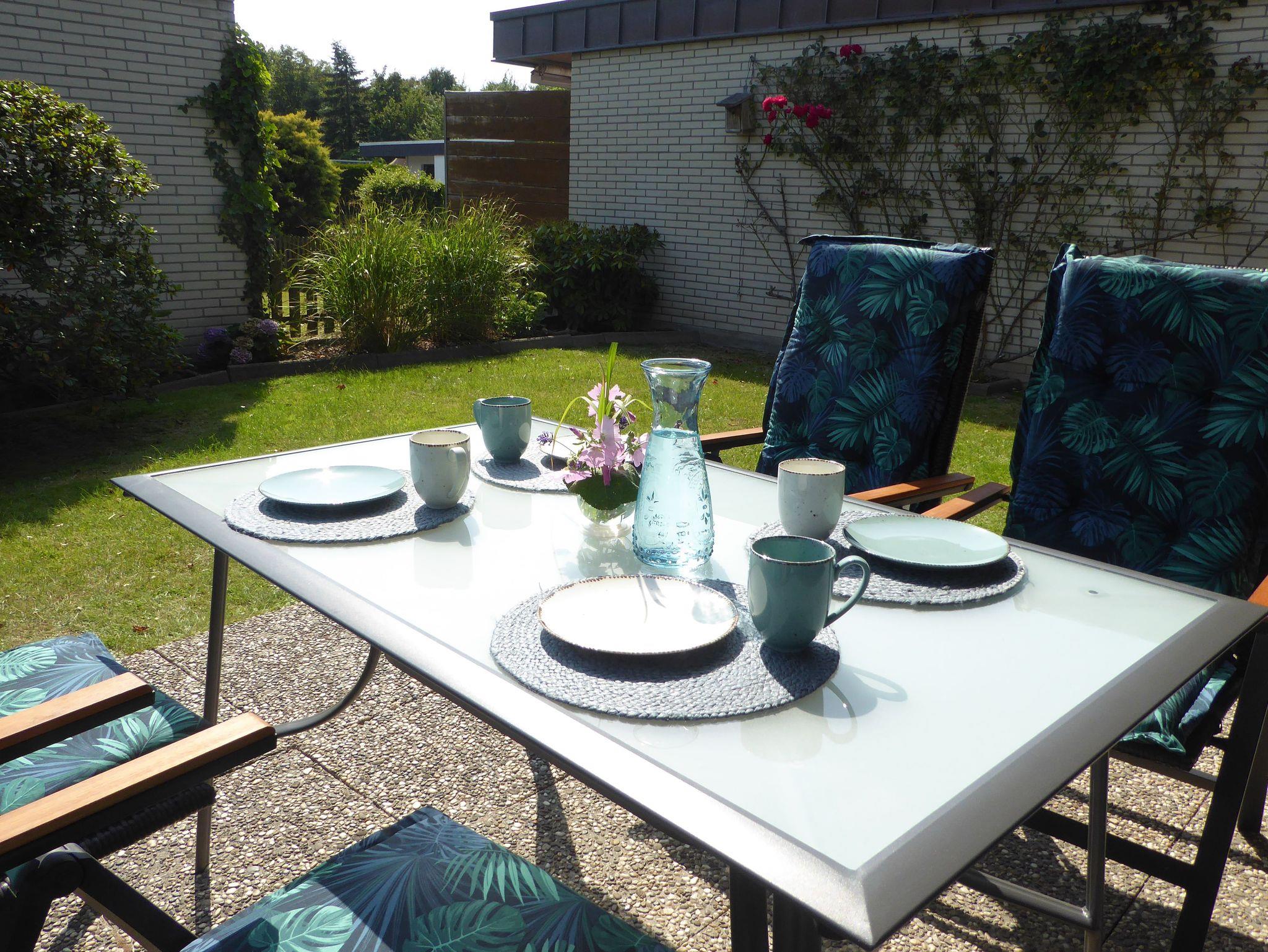 Zum Garten hin gelegen ist eine ca. 20 qm² große Terrasse vom Wohnzimmer aus begehbar. Dort stehen neben Sitz- und Liegemöbeln auch ein Grill im windgeschützten Außenbereich. Außerdem gibt es eine ausfahrbare Markise. Das gesamte Ferienhaus ist neu, modern eingerichtet und wenn doch einmal etwas fehlen sollte, wird Abhilfe geleistet.