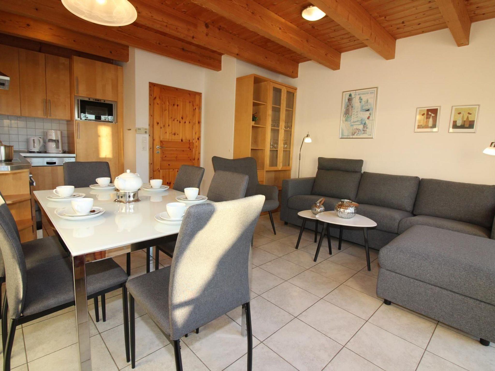Das gemütliche Wohnzimmer ist mit ausziehbarem Esstisch für bis zu 8 Personen, 3-sitziger Couch, Kabel-TV, Videorecorder, DVD-Player und Stereoanlage mit CD-Player ausgestattet.
