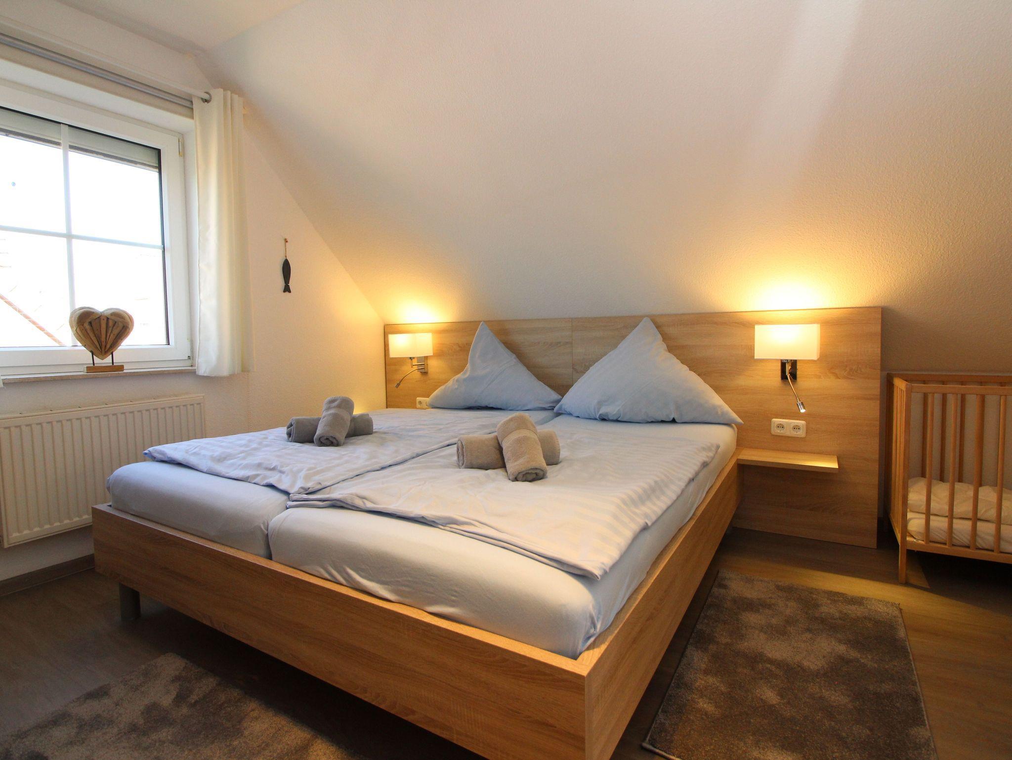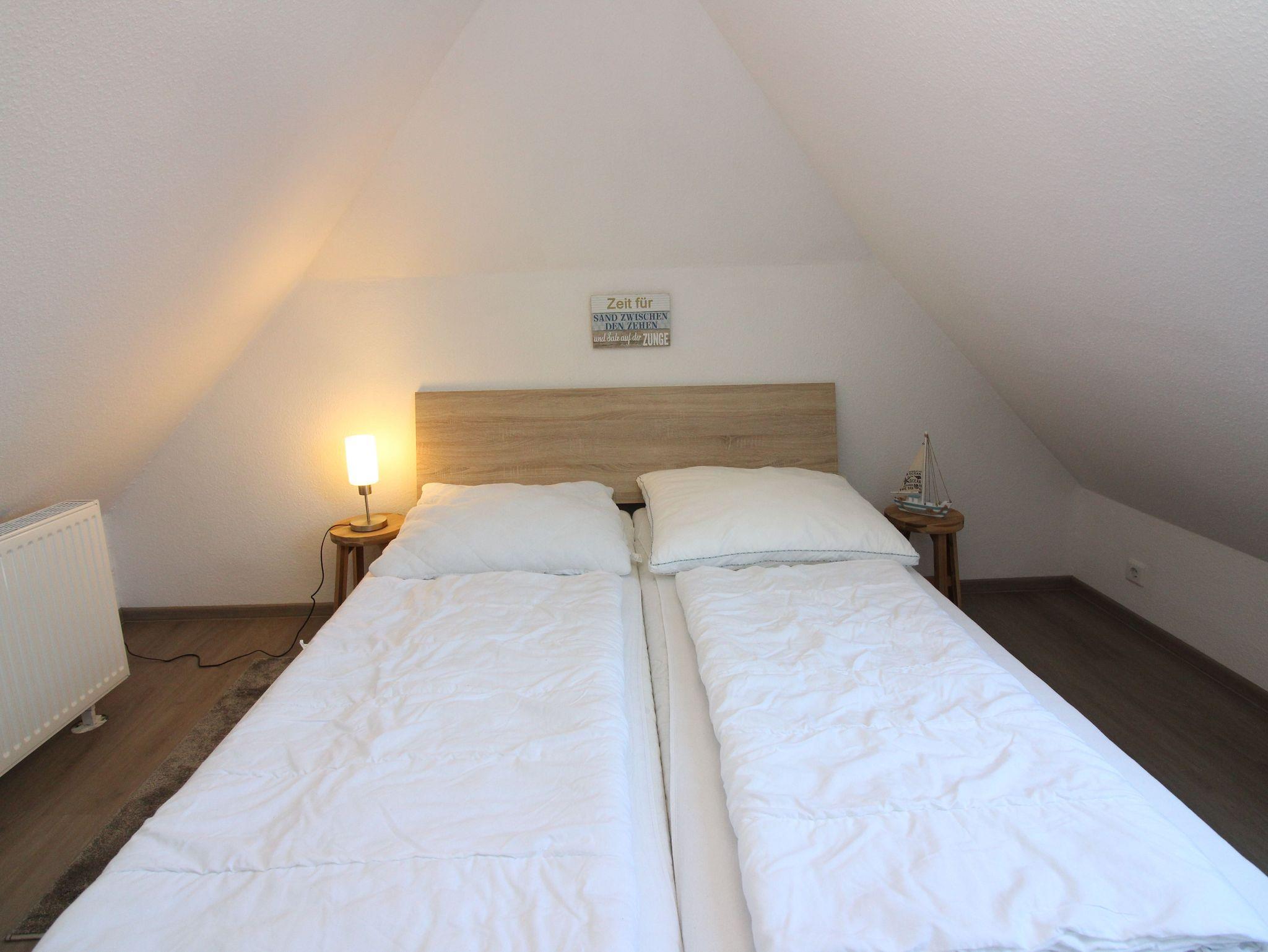 Der ausgebaute Spitzboden ist mit einem Doppelbett, Kommode und TV-Gerät eingerichtet. Ideal für Teenies, mitreisenden Großeltern oder Paaren. Von dort haben Sie einen weiten Blick über Deich und Nordsee.