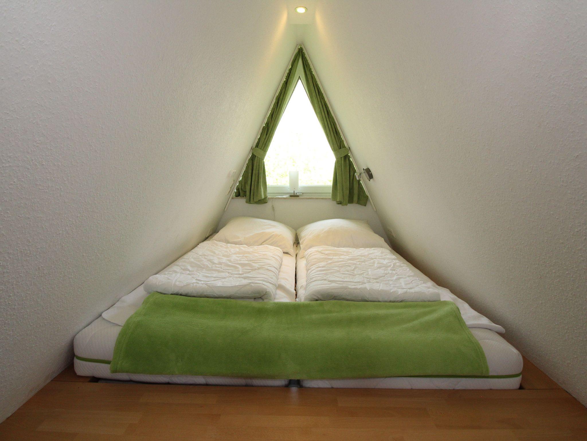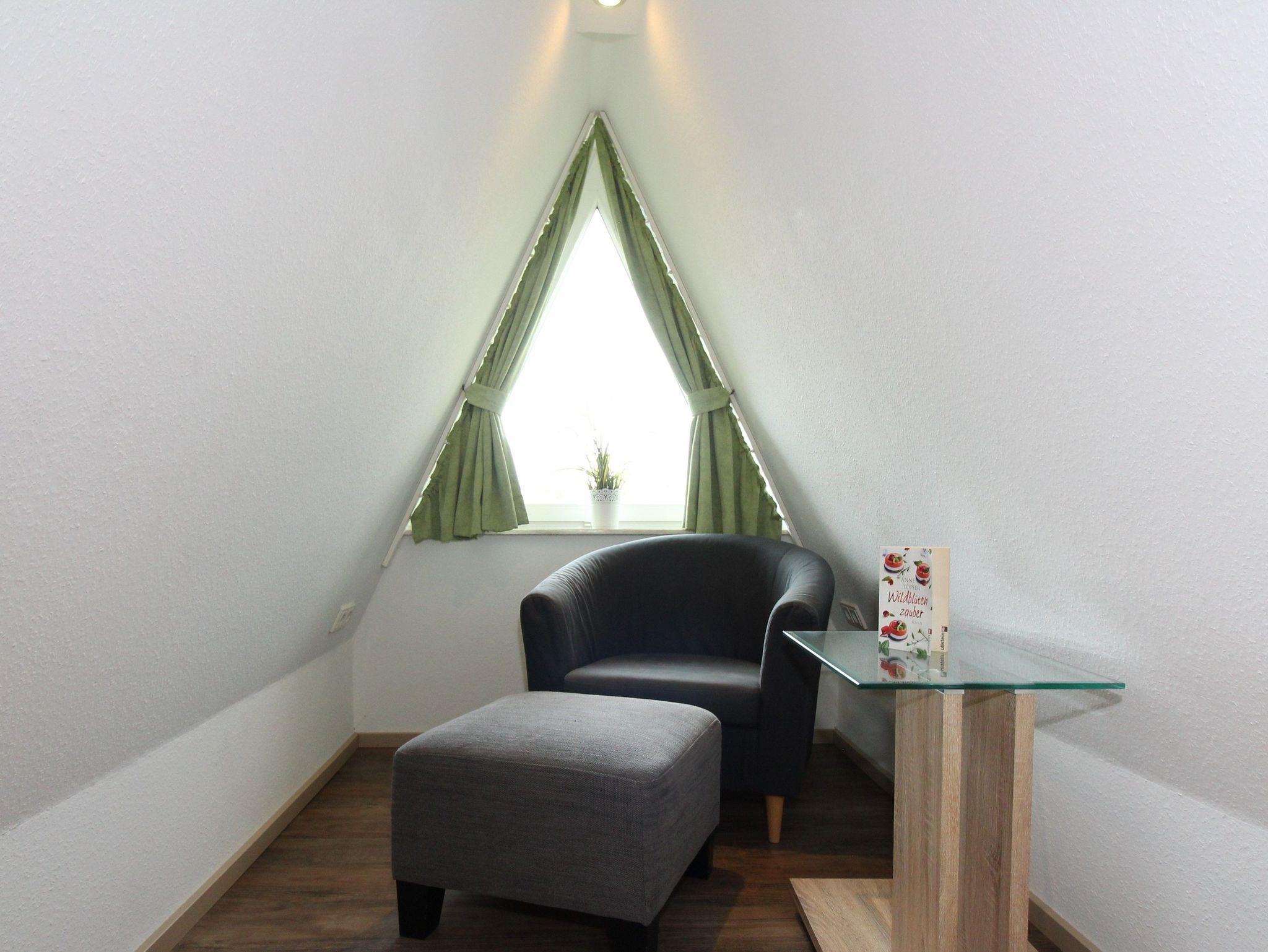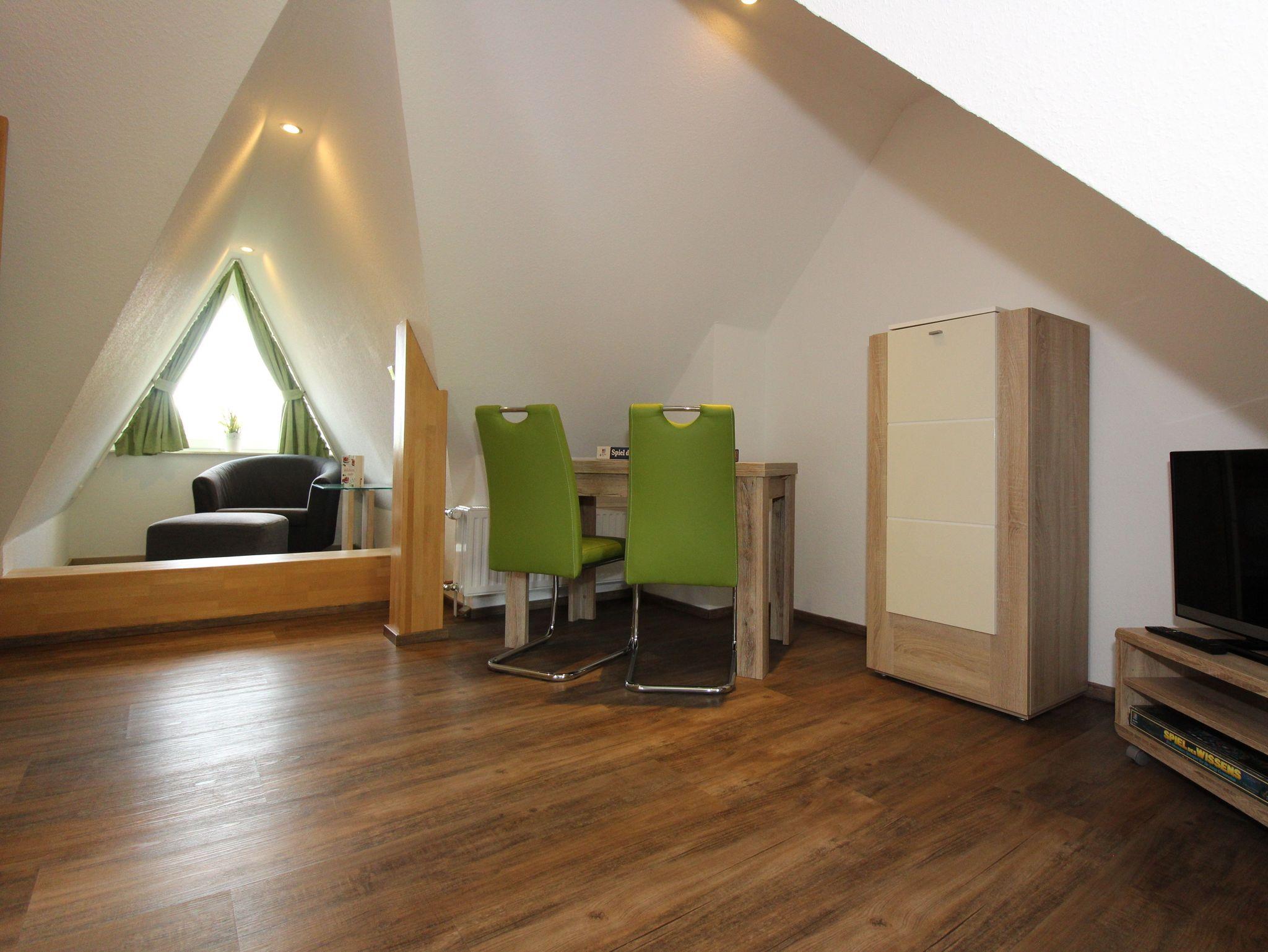 großerWohn-/Schlafraum, gemütliche Sitzecke in Dachgaube, eingebautes Doppelbett in gegenüberliegender, zweiter Gaube, Tisch, zwei Schwingstühle,Einbauschrank & Flachbild-TV