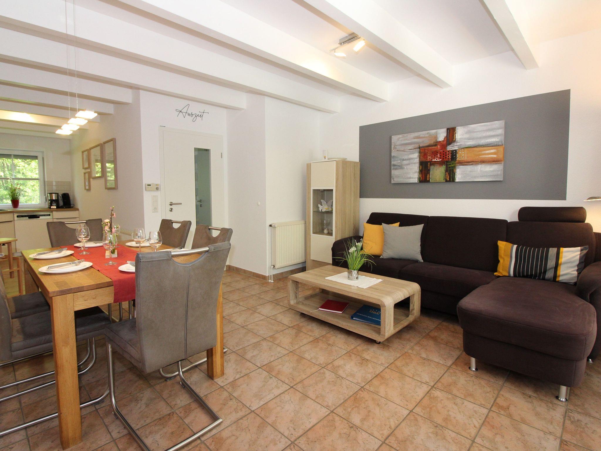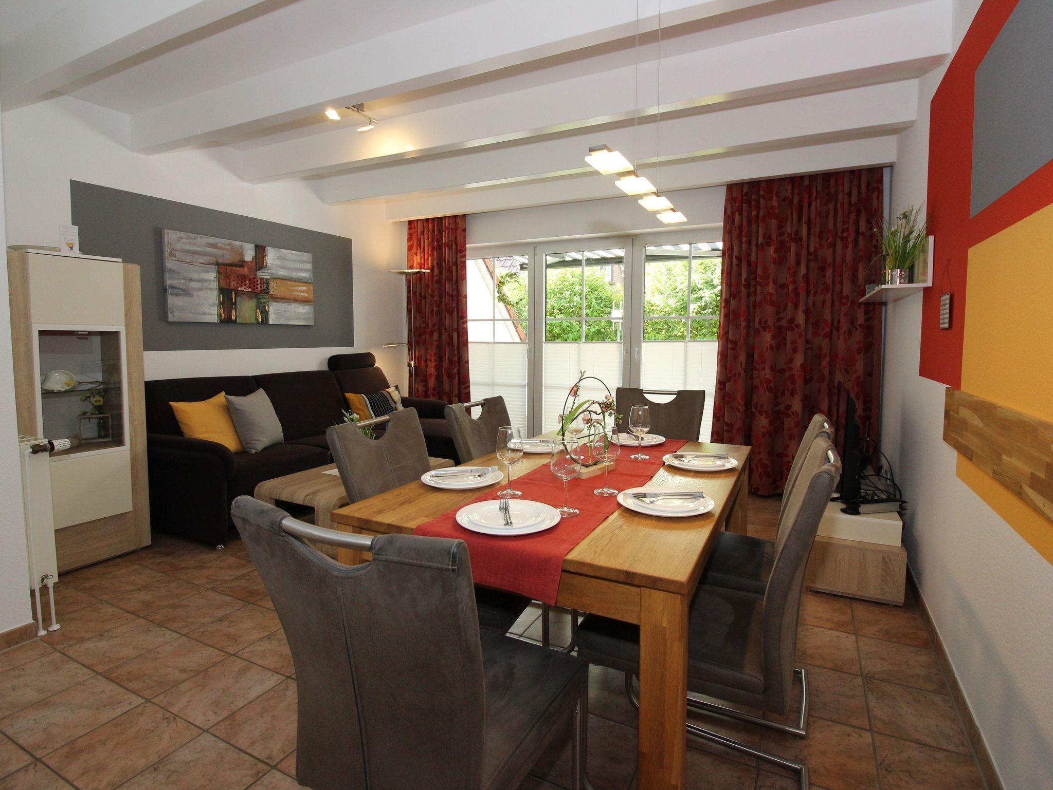 - Wohn-/Esszimmer: Ausziehtisch, sechs Schwingstühlen, gemütliche Couch, Flachbild-TV, CD-Player/Radio