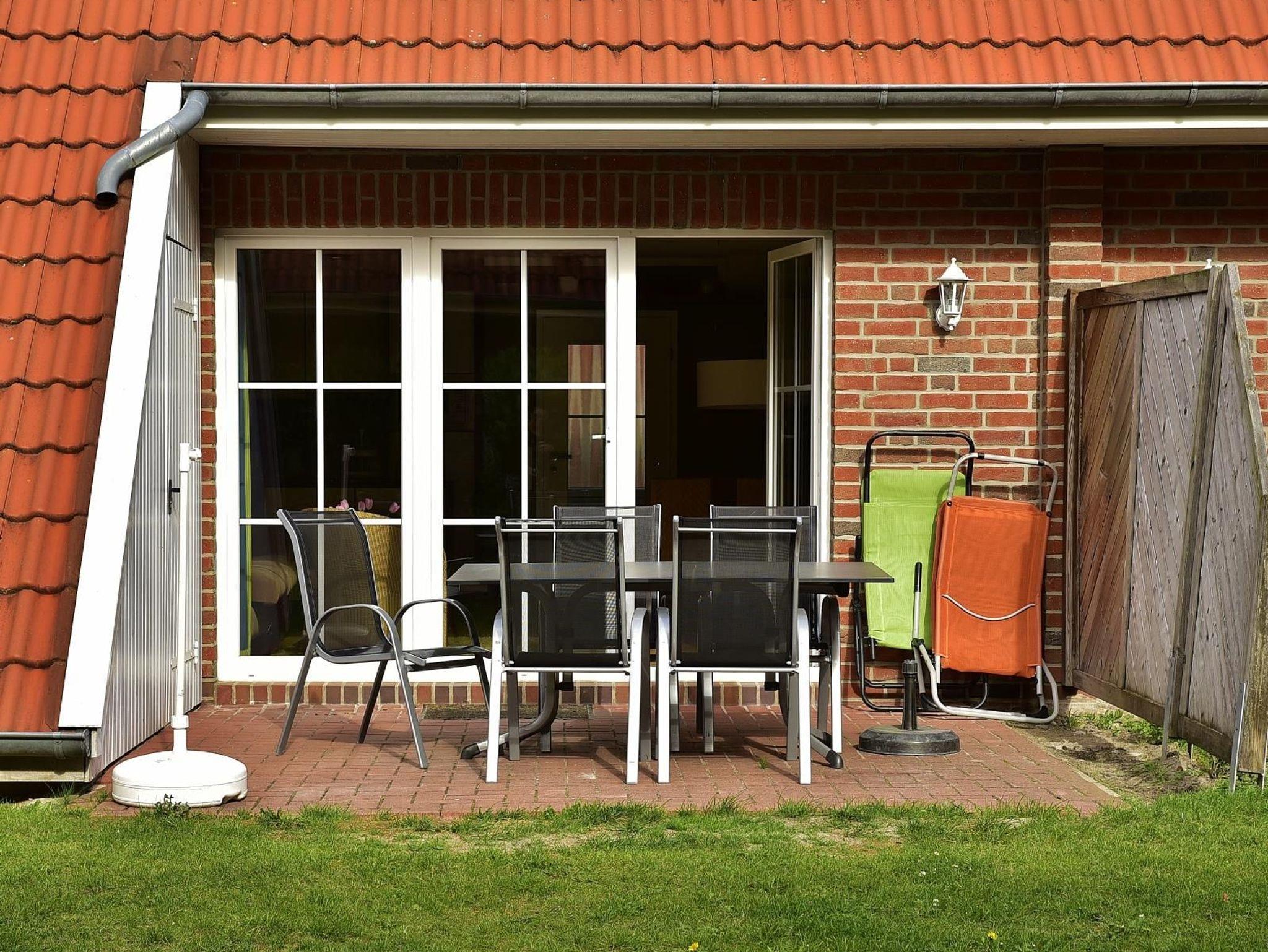 Relaxen Sie auf der Terrasse, Sonnenschirm, Terrassenmöbel, Liegestühle und ein stabiler Weber Holzkohlegrill stehen Ihnen für gemütliche Stunden bereit.