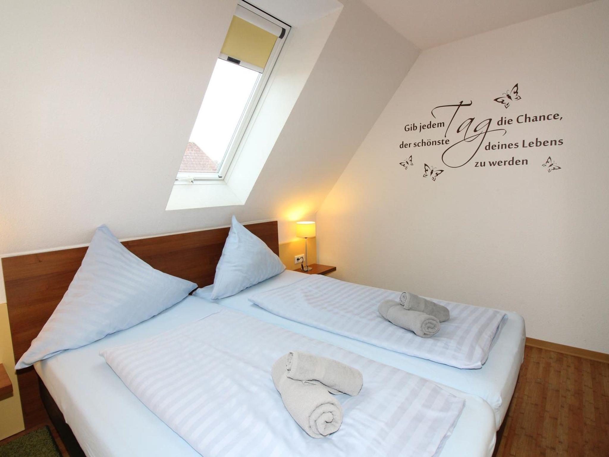 Es bietet Platz für bis zu 6 Personen mit drei Schlafzimmern auf ca. 80 m², zwei Schlafzimmer mit Doppelbett und ein Schlafzimmer mit zwei getrennten Betten. Die Schlafräume sind mit Verdunklungsrollos ausgestattet.