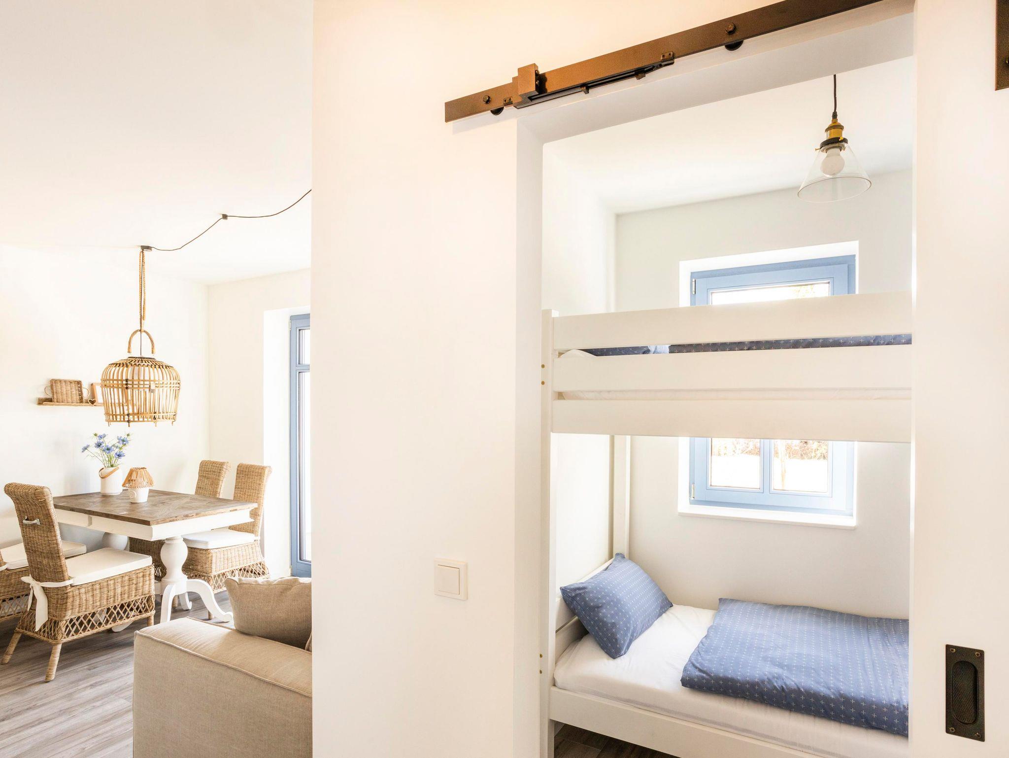 Das Appartement liegt im Erdgeschoss und ist ausgestattet mit einem Wohnraum, sehr gut ausgestatteter Küchenzeile, 1 Schlafzimmer mit Doppelbett und 1 Schlafzimmer mit Etagenbett sowie einem Badezimmer mit Dusche/WC. Es gibt 2 Terrassen eine zum frühstücken im Strandkorb und eine um abends die untergehende Sonne bei einem Glas Wein zu genießen.Von da aus geht es in den Outdoor-Bereich mit Outdoorküche, Teehäuschen, Bouleplatz, Sitzmöglichkeiten . Bezogene Betten sowie Handtücher sind in allen Wohnungen bei Anreise liebevoll vorbereitet und laden zu einem erholsamen Urlaub ein. Wlan steht im ganzen Haus zur Verfügung.