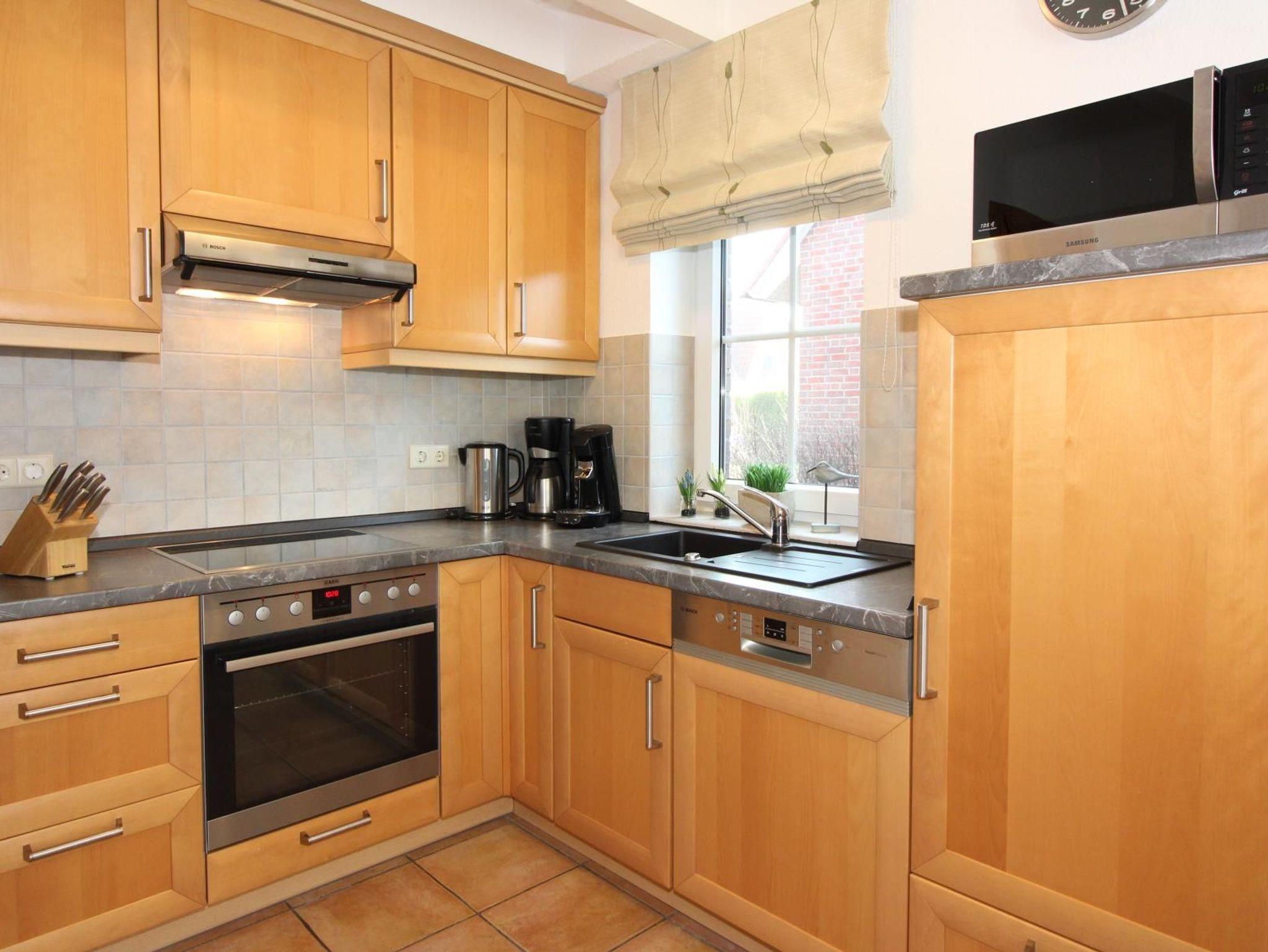 Küche mit Ceranfeld, Backofen, Kühlschrank(kleines Gefrierfach), Mikrowelle, Geschirrspülmaschine, Kaffeemaschine, Wasserkocher, Eierkocher, Toaster.