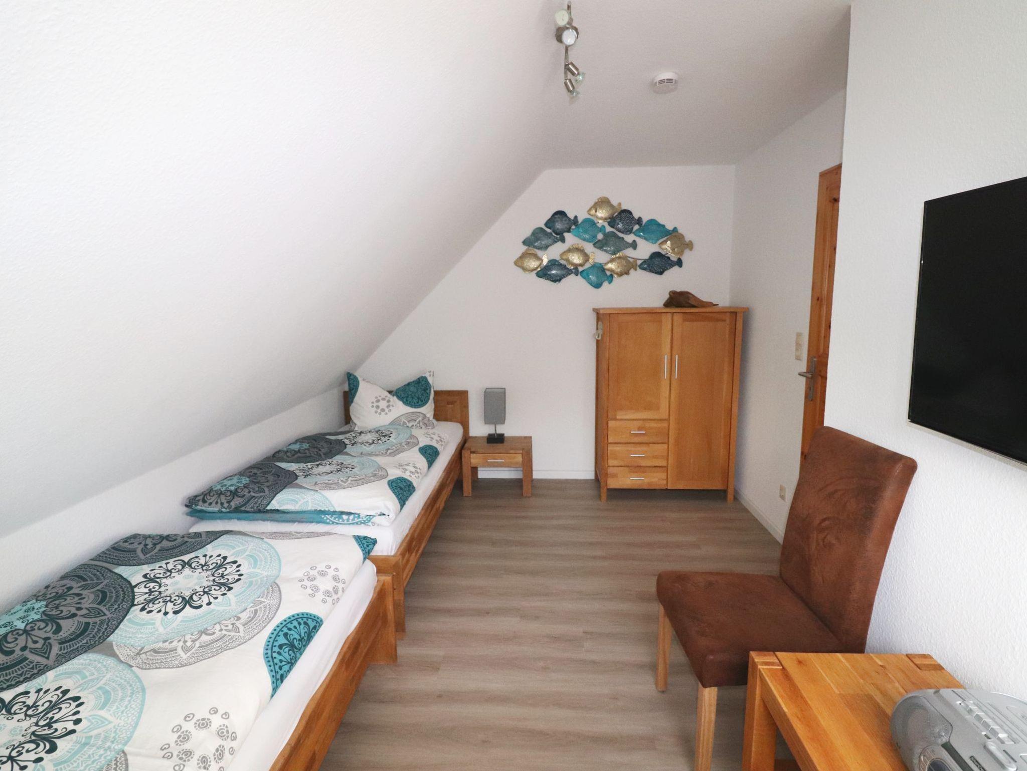 Im Obergeschoss kommen Sie vom Flur - mit kleinem Bücherregal und großem Spiegel - in die beiden Schlafzimmer oder das Duschbad. Das Doppelbett-Schlafzimmer bietet einen geräumigen Kleiderschrank mit Tresor. An beiden Seiten des Doppelbettes befinden sich jeweils Ablagemöglichkeiten, eine Steckdose, sowie separat schaltbare Leuchten. Schlafzimmer 2 hält zwei Einzelbetten, einen Wäscheschrank sowie einen 42 Flachbildfernseher bereit. Auf den Ablagemöglichkeiten an den Betten befinden sich Nachttischlampen mit integrierter USB-Ladefunktion für mobile Endgeräte sowie eine Steckdose. Zusätzlich finden Sie hier noch einen Musikspieler, der Radio/CD/MP3/MC und USB abspielen kann, außerdem Gesellschaftsspiele und Bücher. Zwischen den Schlafräumen liegt das Tageslicht-Duschbad. Die Schlafzimmer sind mit Insektenschutzgittern und Rollläden ausgestattet.