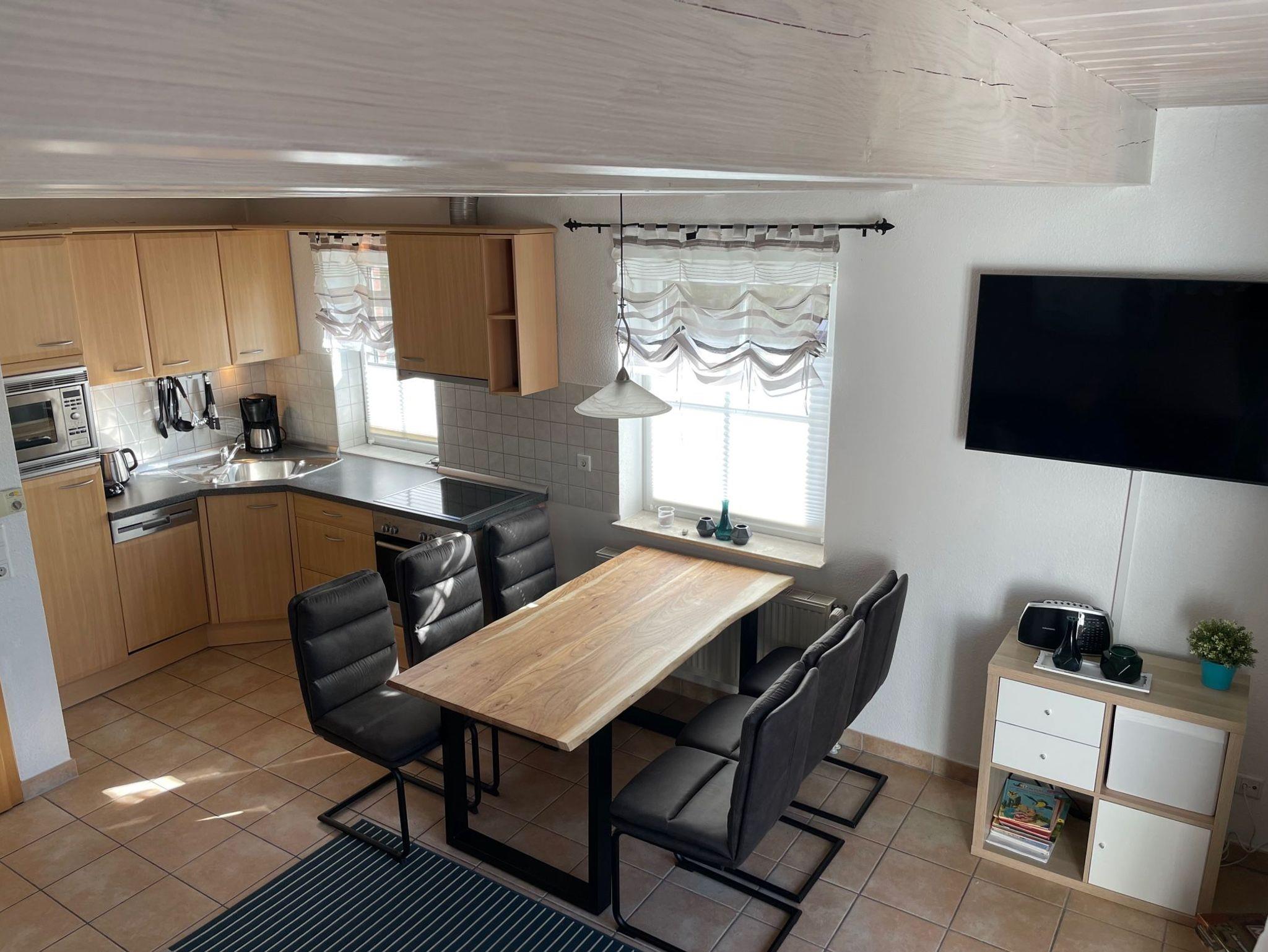 Die Küche ist mit einem Cerankochfeld mit Backofen und Dunstabzugshaube und einer Mikrowelle eingerichtet. Zudem sind ein großer Kühlschrank mit TK-Fach, ein Geschirrspüler, ein Wasserkocher, eine Kaffeemaschine, eine Senseo Maschine und ein Toaster vorhanden. Im Haus gibt es zudem Kindergeschirr und Besteck, Kinderreisebett, Hochstuhl, Flaschenwärmer, WC-Aufsatz, Tritthocker, Treppenschutzgitter und Steckdosensicherungen.