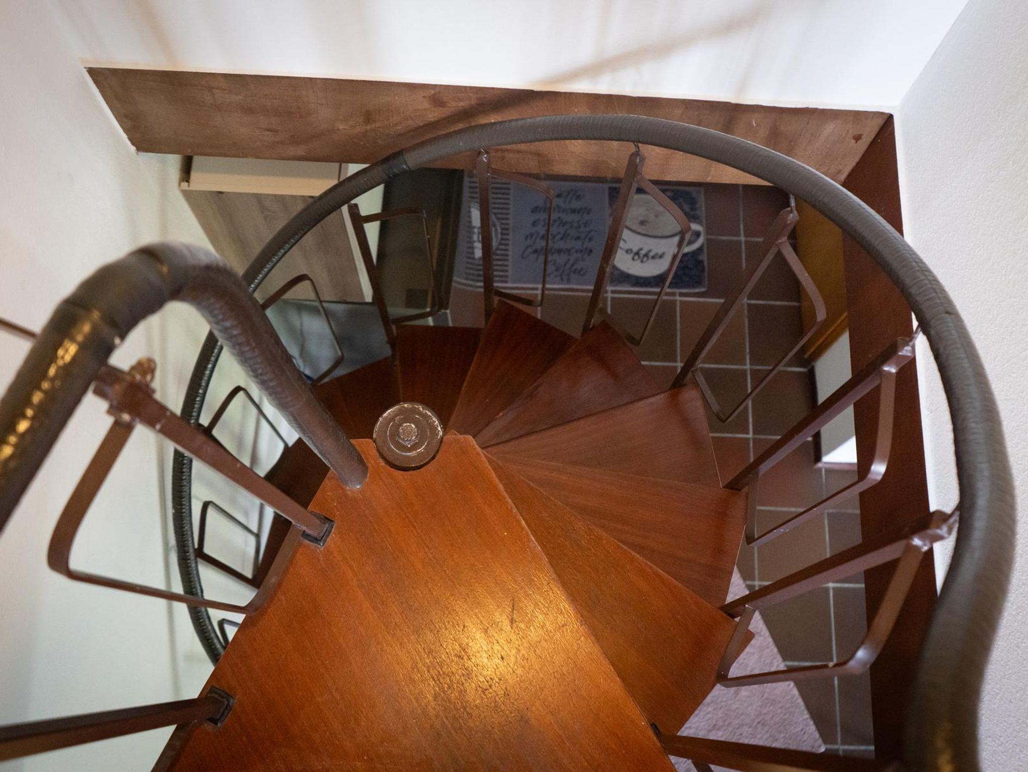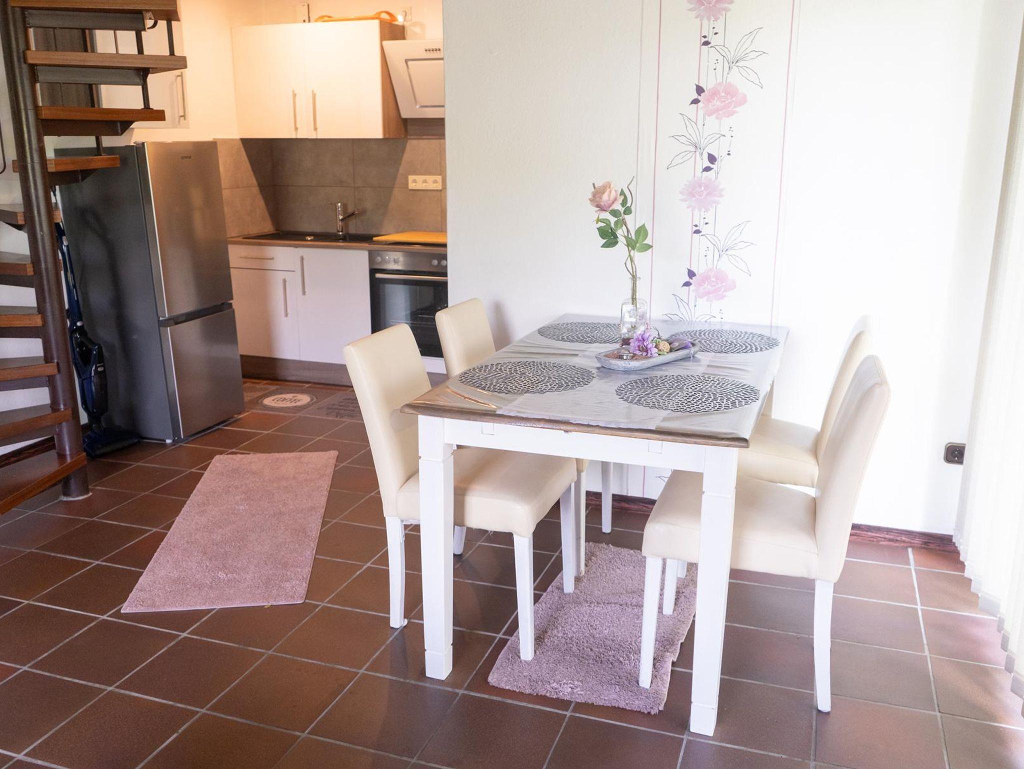 Die Ferienwohnung West W1 hat im Ergeschoss ein Wohnzimmer (Sat TV, Radio) mit Sitzecke, Kamin, Essecke und Küchenzeile (4-Plattenherd, Kaffeemaschine, Wasserkocher, Mikrowelle, Toaster) und ein Badezimmer mit Dusche und WC. Eine Wendeltreppe führt ins Obergeschoss mit zwei Schlafzimmern mit jeweils zwei zusammengestellten Couchbetten.