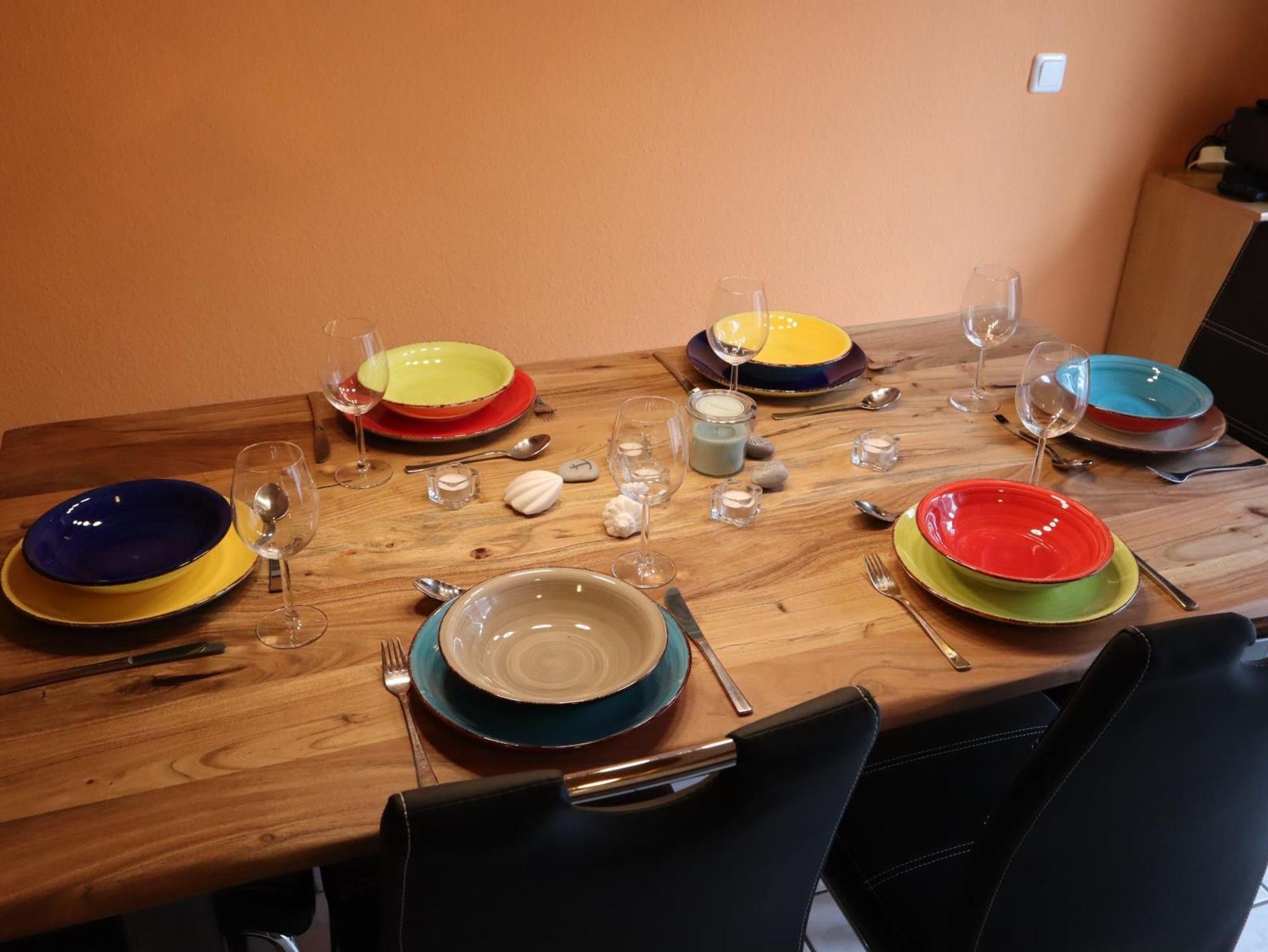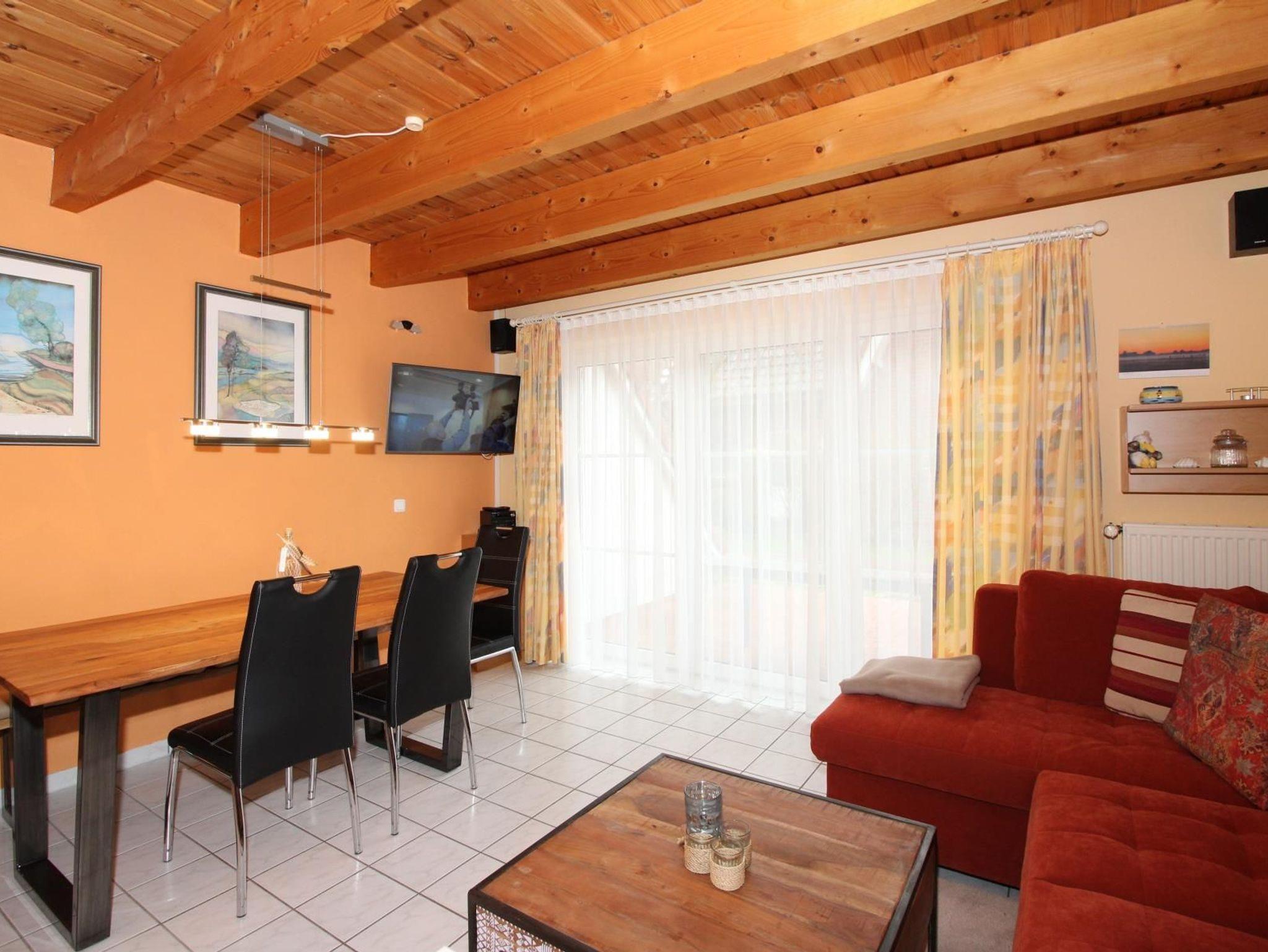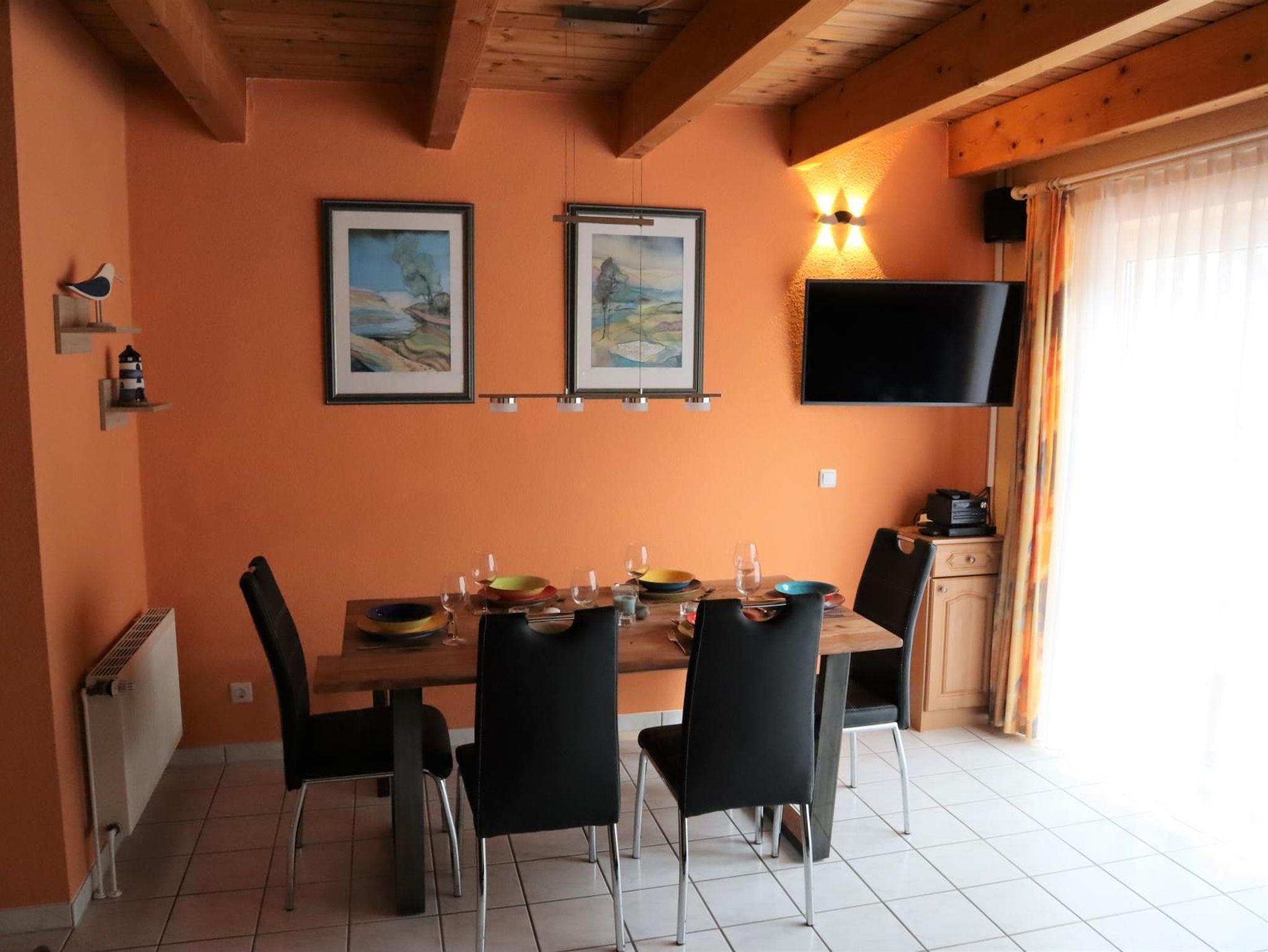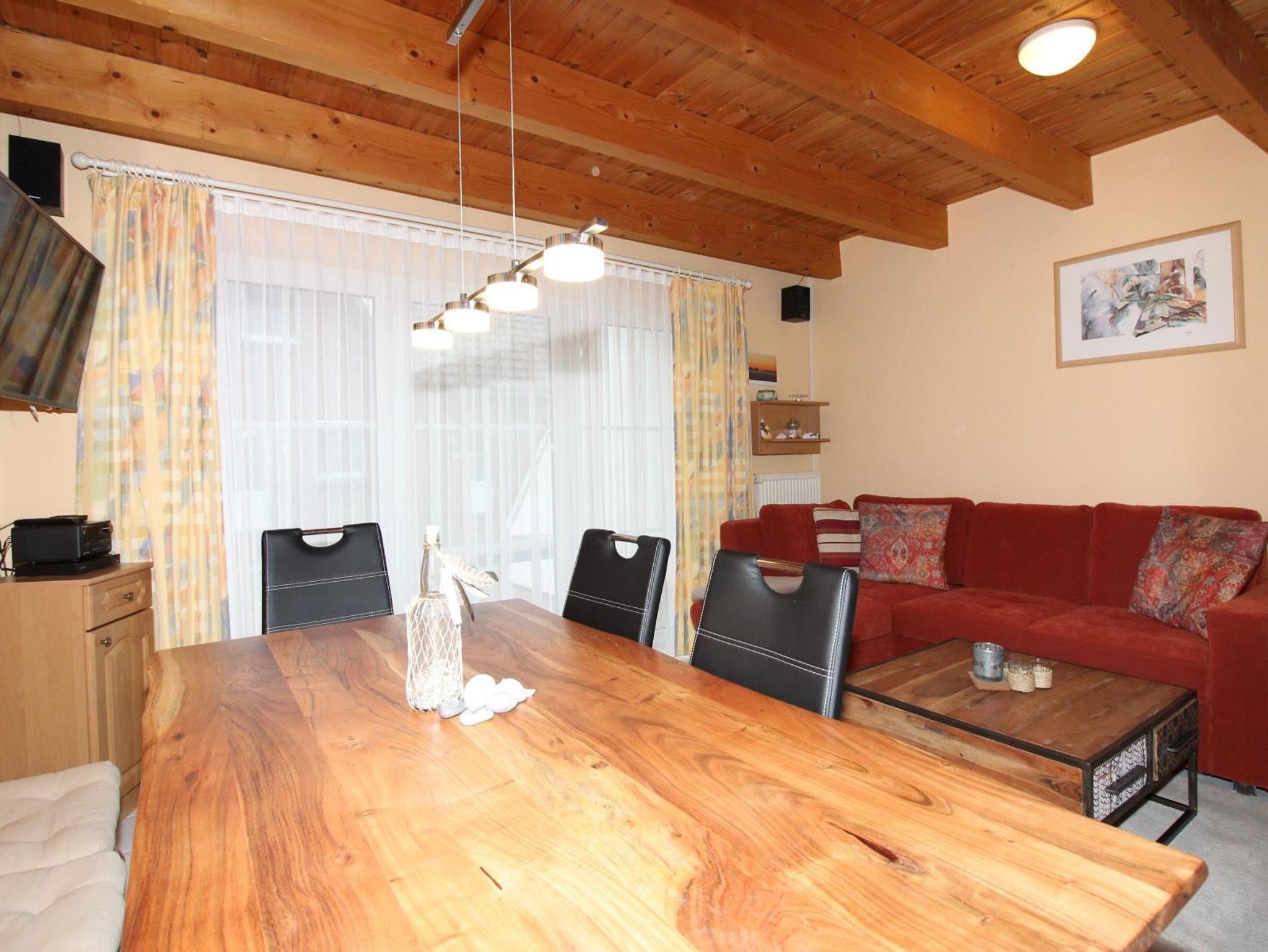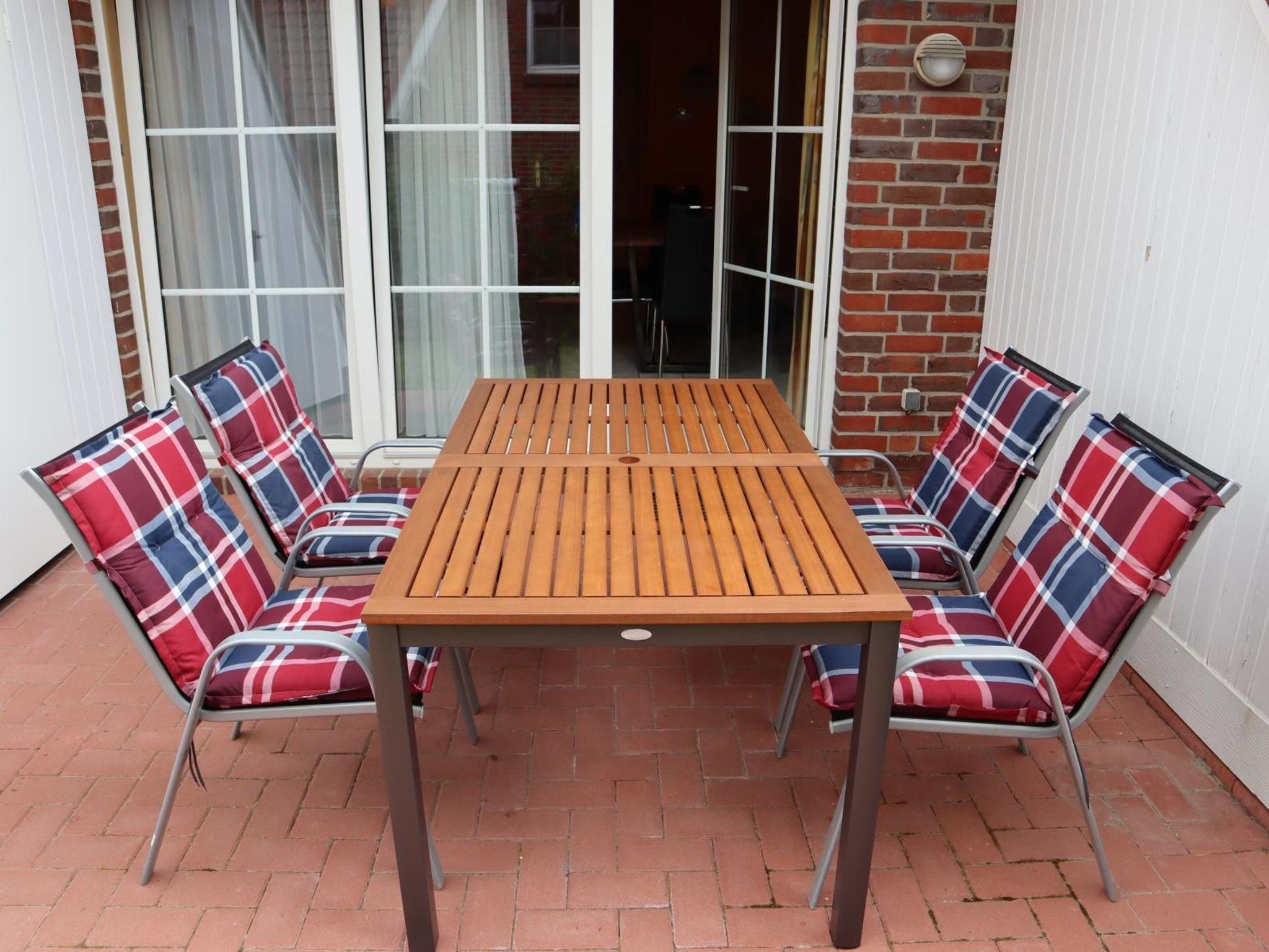 Sie wohnen in einem behaglich und familiengerecht ausgestatteten Ferienhaus mit mehr als 70 m² Wohnfläche auf zwei Etagen. Im Erdgeschoss liegt der Wohn-/ Essbereich mit einer voll ausgestatteten Einbauküche mit Geschirrspüler, einem großzügigen Esstisch sowie einer Couchgarnitur. Ein großer Fernseher, eine Stereoanlage mit CD-Player undBluetooth-Verbindung sowie ein Blu-Ray-Player stehen zur Verfügung. Die große Fensterfront besteht aus drei Türen mit direktem Zugang zur Terrasse. Von dort ist auch der Abstellraum erreichbar, sechs Stühle, zwei Liegestühle, ein großer Sonnenschirm sowie ein Grill sind dort gelagert. Ein großer Tisch steht auch bereit.