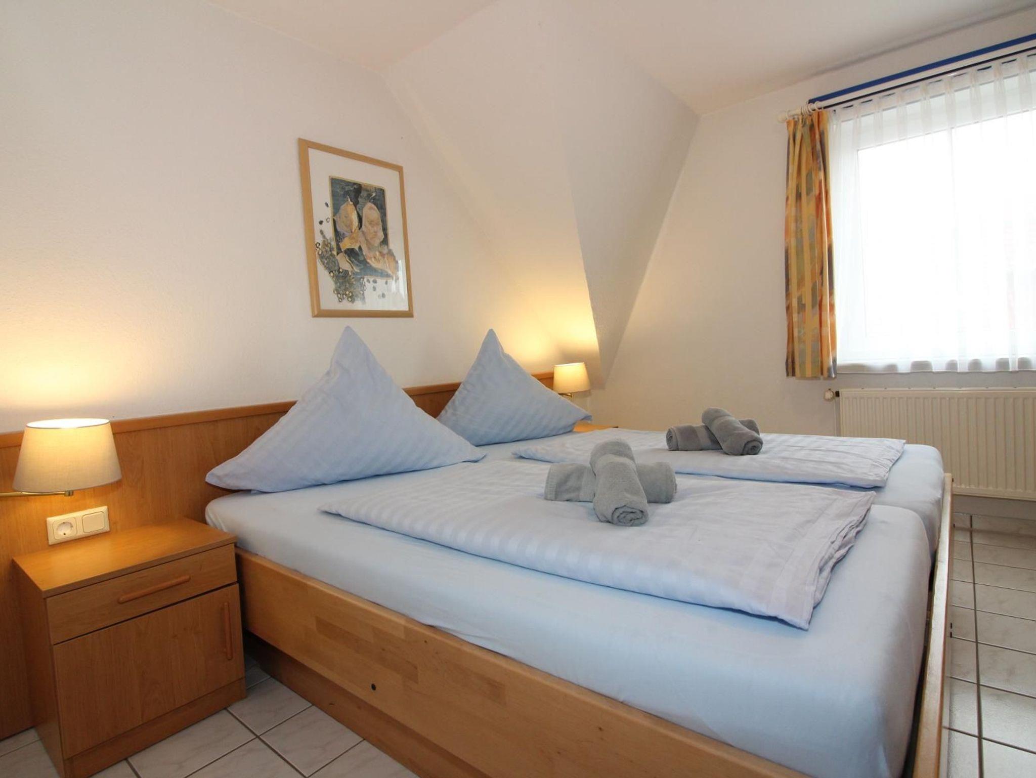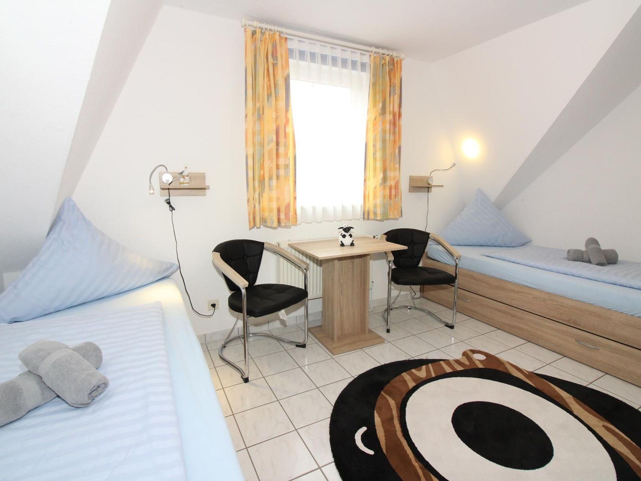 Im Erdgeschoss befindet sich außerdem ein Schlafraum mit einem Bett und die Gästetoilette. Zwei weitere Schlafräume befinden sich im Obergeschoss. In einem Schlafraum steht ein großes Doppelbett, hier befindet sich auch ein zweites Fernsehgerät. Der andere Schlafraum hat zwei Einzelbetten, die bei Bedarf auch seitlich ausgezogen werden können, um zusätzliche Schlafmöglichkeiten zu schaffen. Das Bad mit Dusche liegt ebenfalls im Obergeschoss.