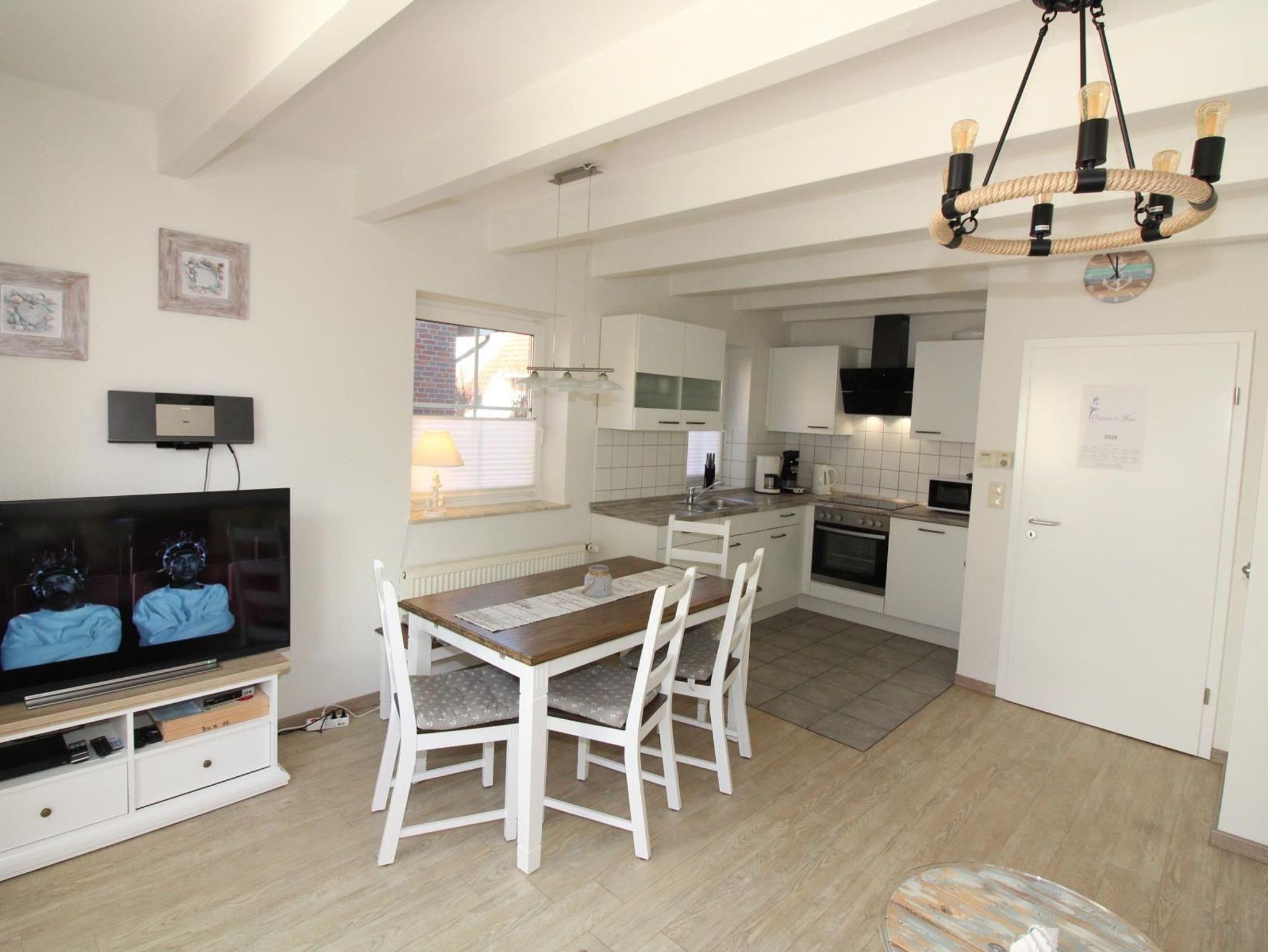Einkleiner Flur führt zum behaglichen Wohnraum mit Zugang zur Terrasse. Die voll ausgestattete Wohnküche mit Geschirrspüler und Mikrowelle schließt sich an den Wohnraum an. Ein gemütlicher Essplatz, eine moderneSitzecke, TV, Blu-Ray-Player sowie eine separate Toilette stehen im Erdgeschoss zur Verfügung. Ein Kinderhochstuhl steht im Haus für unsere kleinsten Gäste bereit. Auf der Terrasse lädt eine moderne Sitzgarnitur mit gemütlichen Sitzauflagen, Sonnenschirm und Grill zum Entspannen ein.