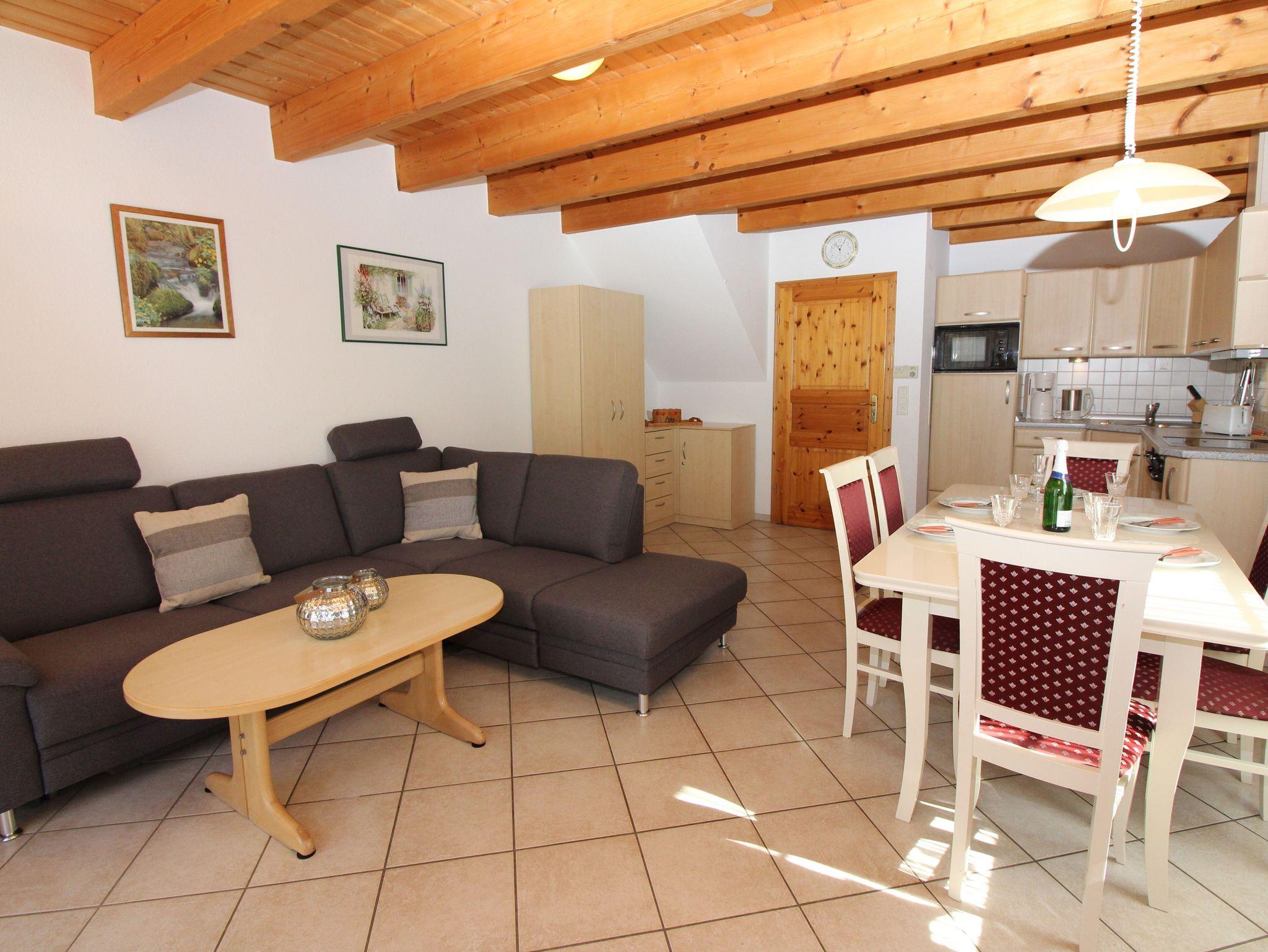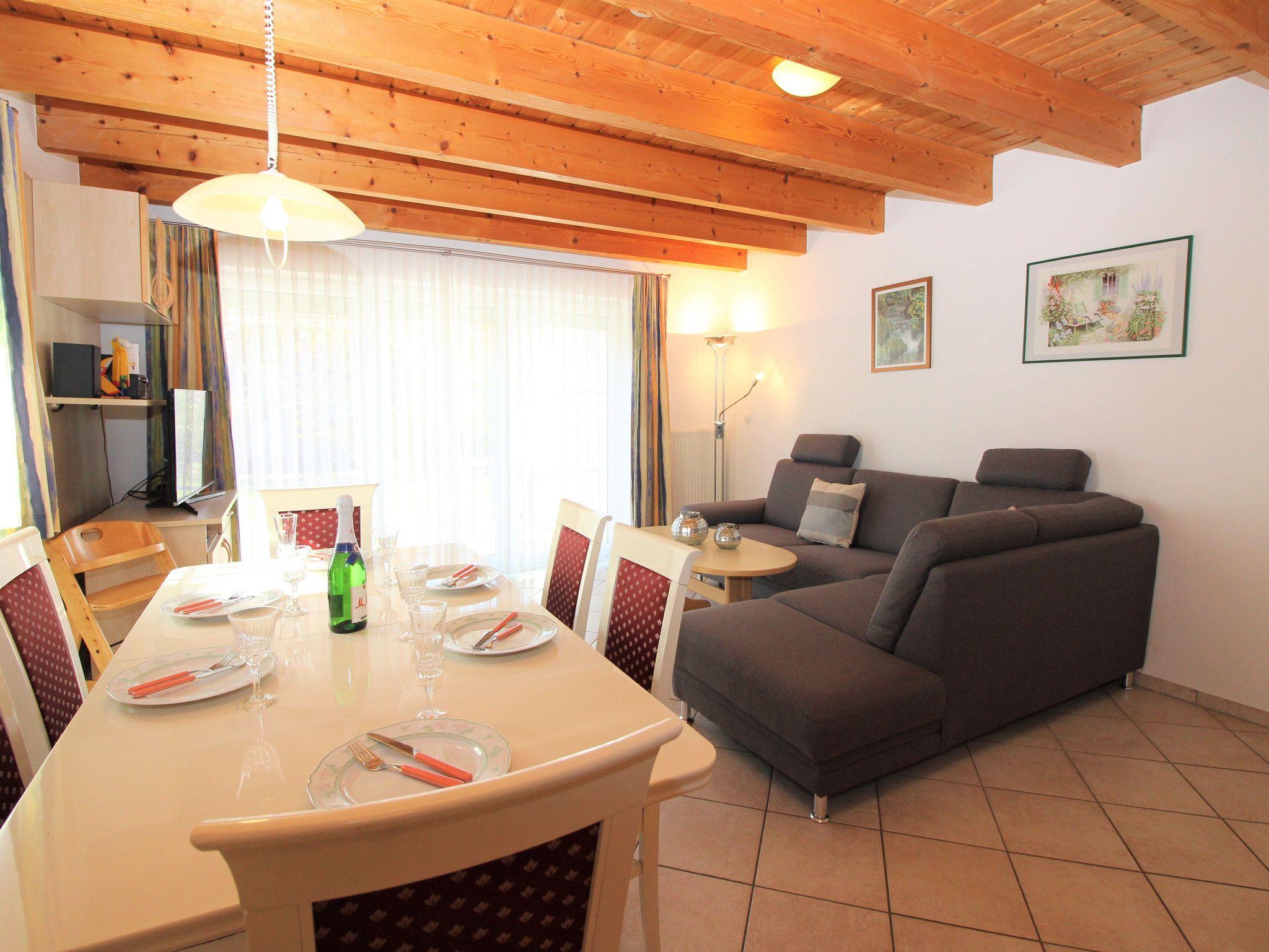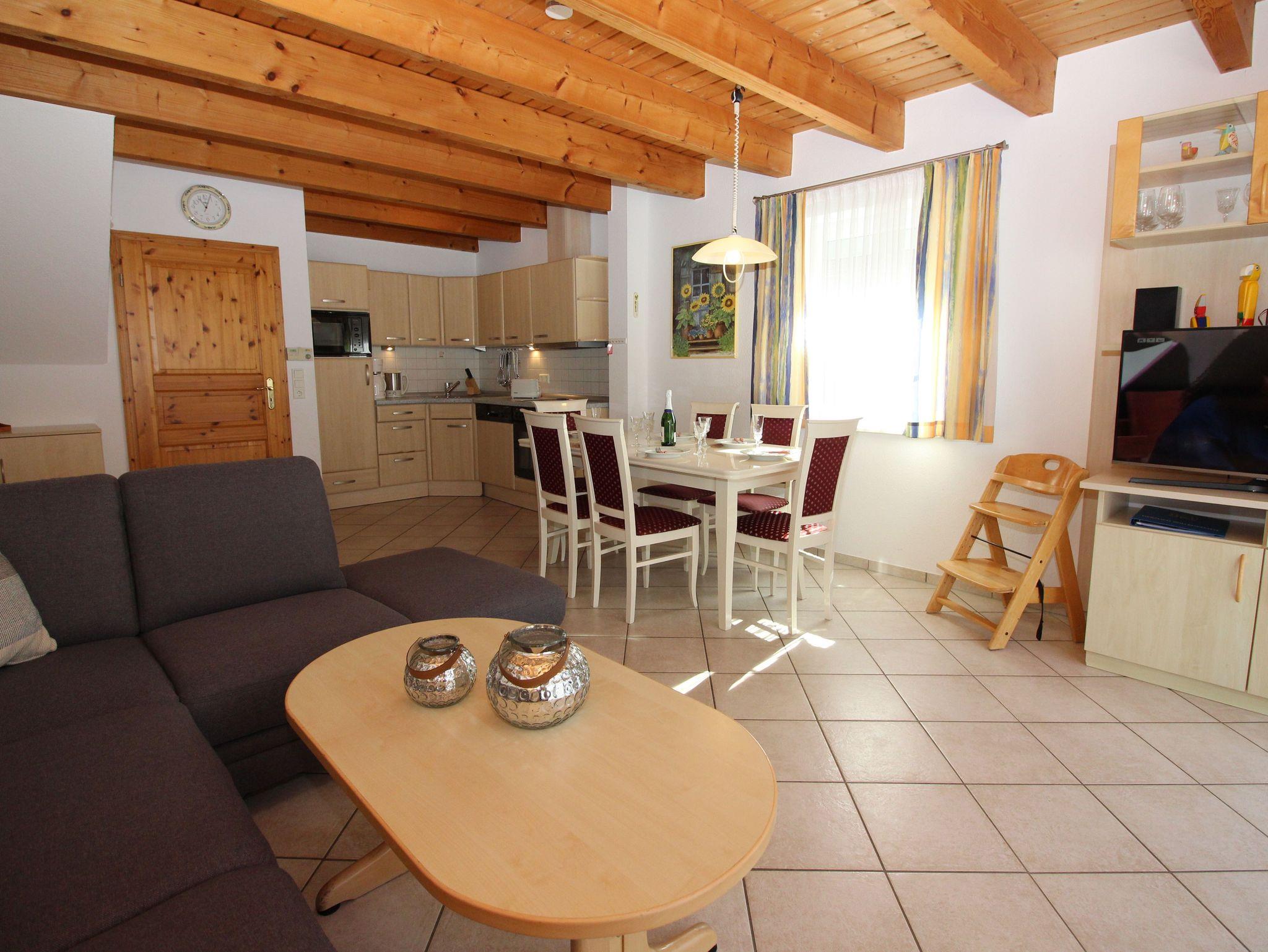 Erdgeschoss liegt der großzügige Wohnraum mit bequemer Doppelbettcouch, separater Essbereich, Kabel-