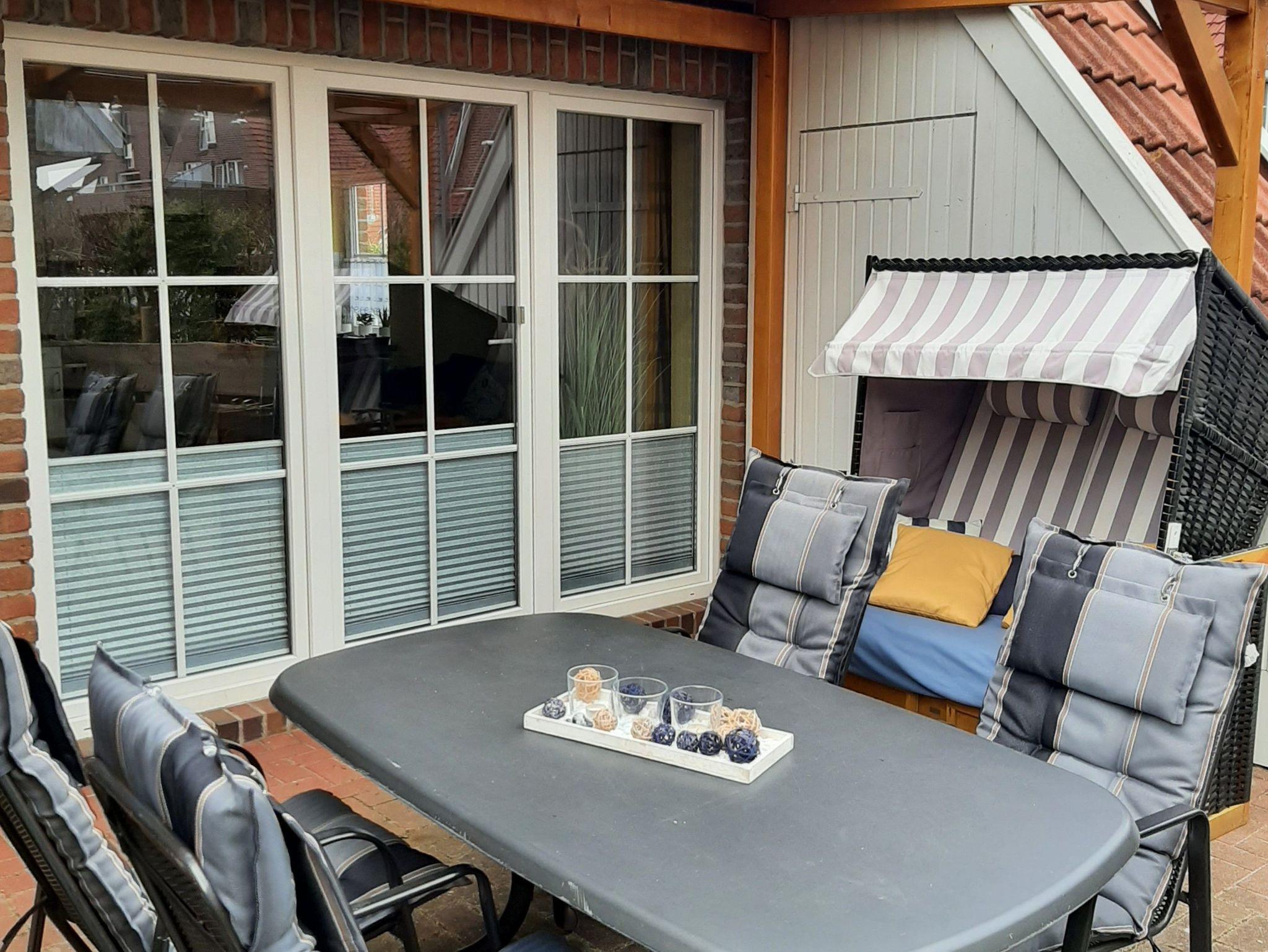 Teilweise überdachte Terrasse mit Tisch, 6 Stühlen inkl. Auflagen, Sonnenschirm und Strandkorb sowie einem Elektrogrill - aus Brandschutzgründen ist die Nutzung von Holzkohlegrills untersagt!