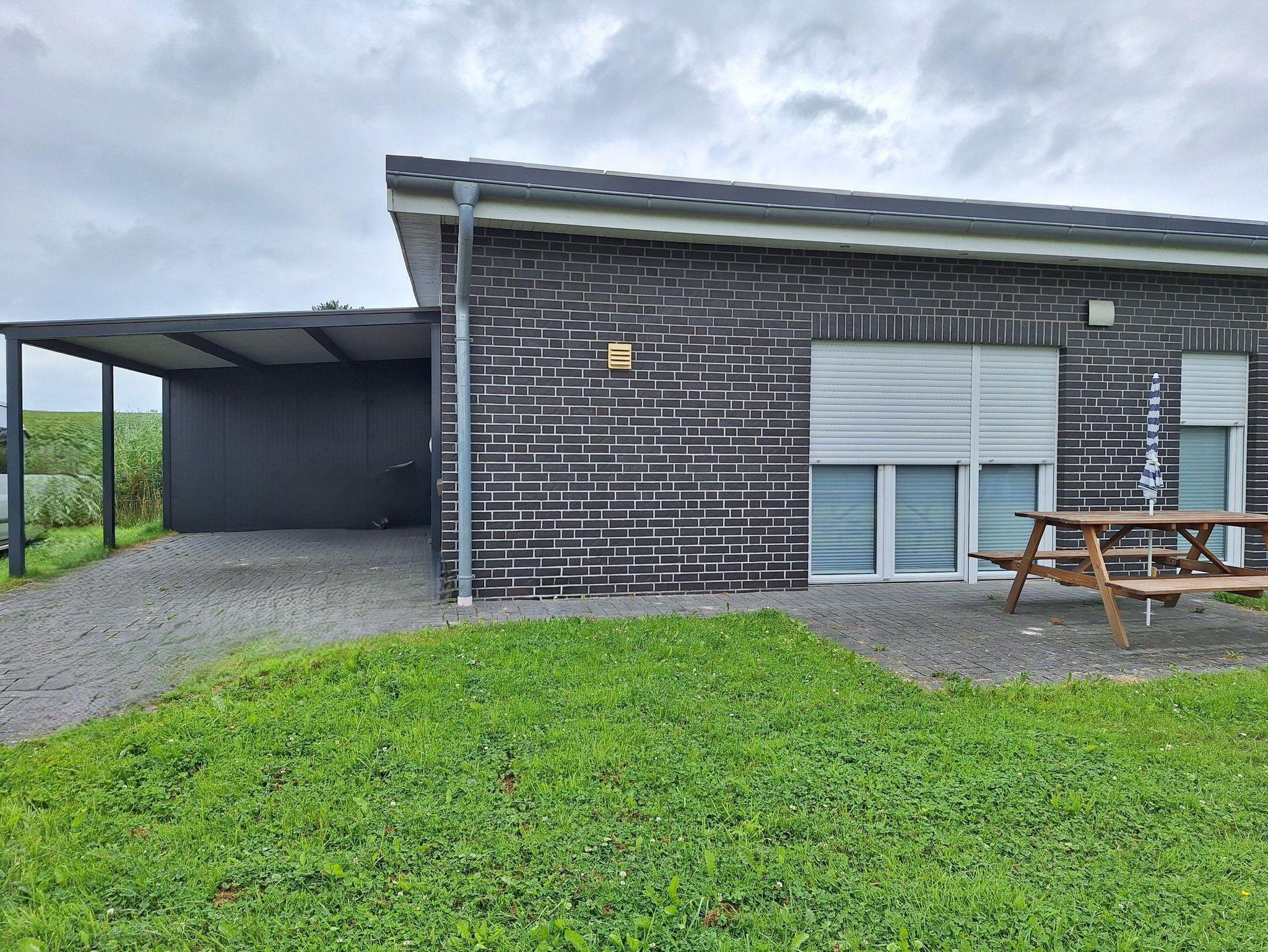 Zur Ferienwohnung gehört ein Carport und eine Holzhütte für Fahrräder.