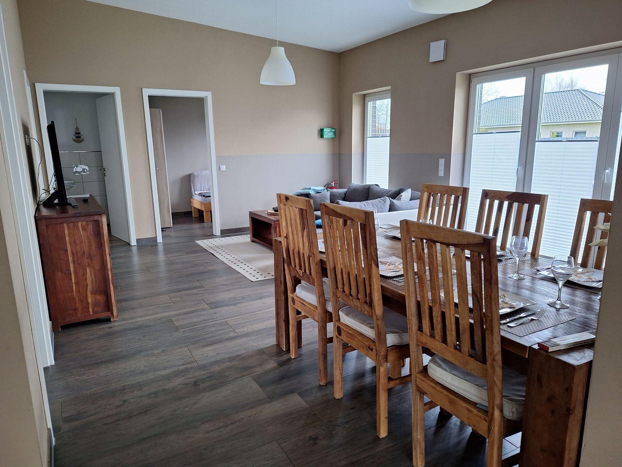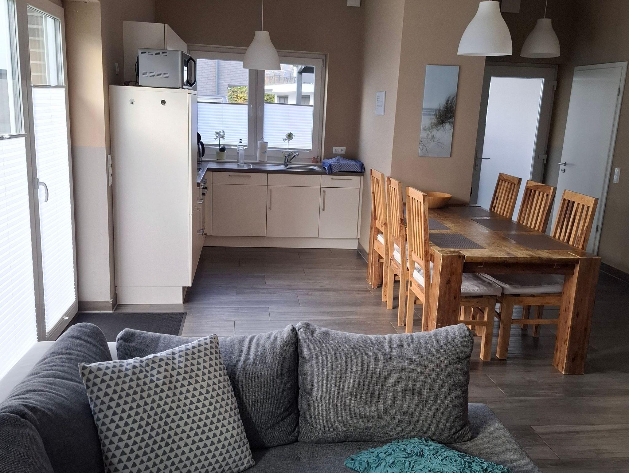 Der Essbereich ist mit einer Einbauküche und einem großen Esstisch ausgestattet und im Wohnbereich ist