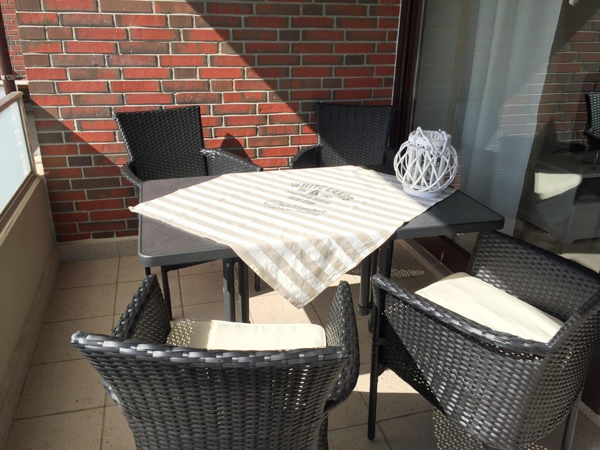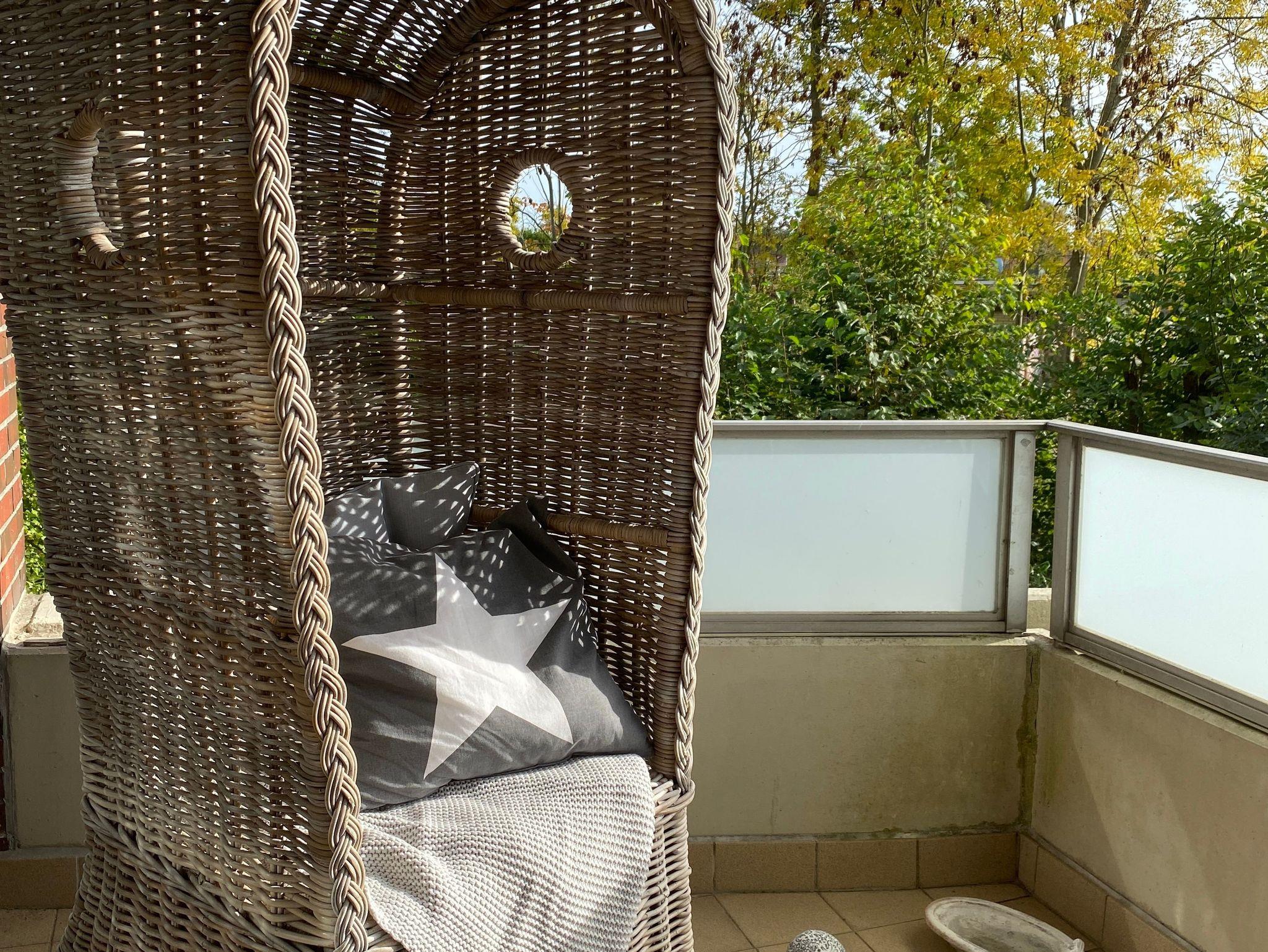 Auf dem Balkon finden Sie einen Tisch mit 4 Stühlen und einen schönen großen Korbsessel zum Entspannen.