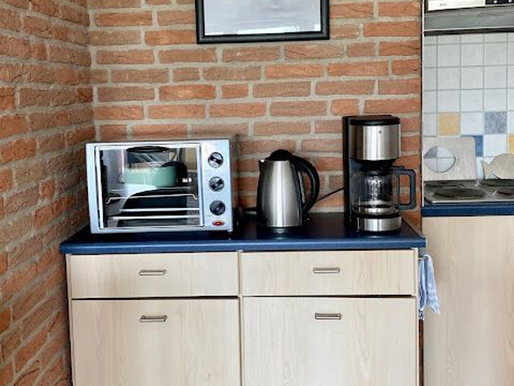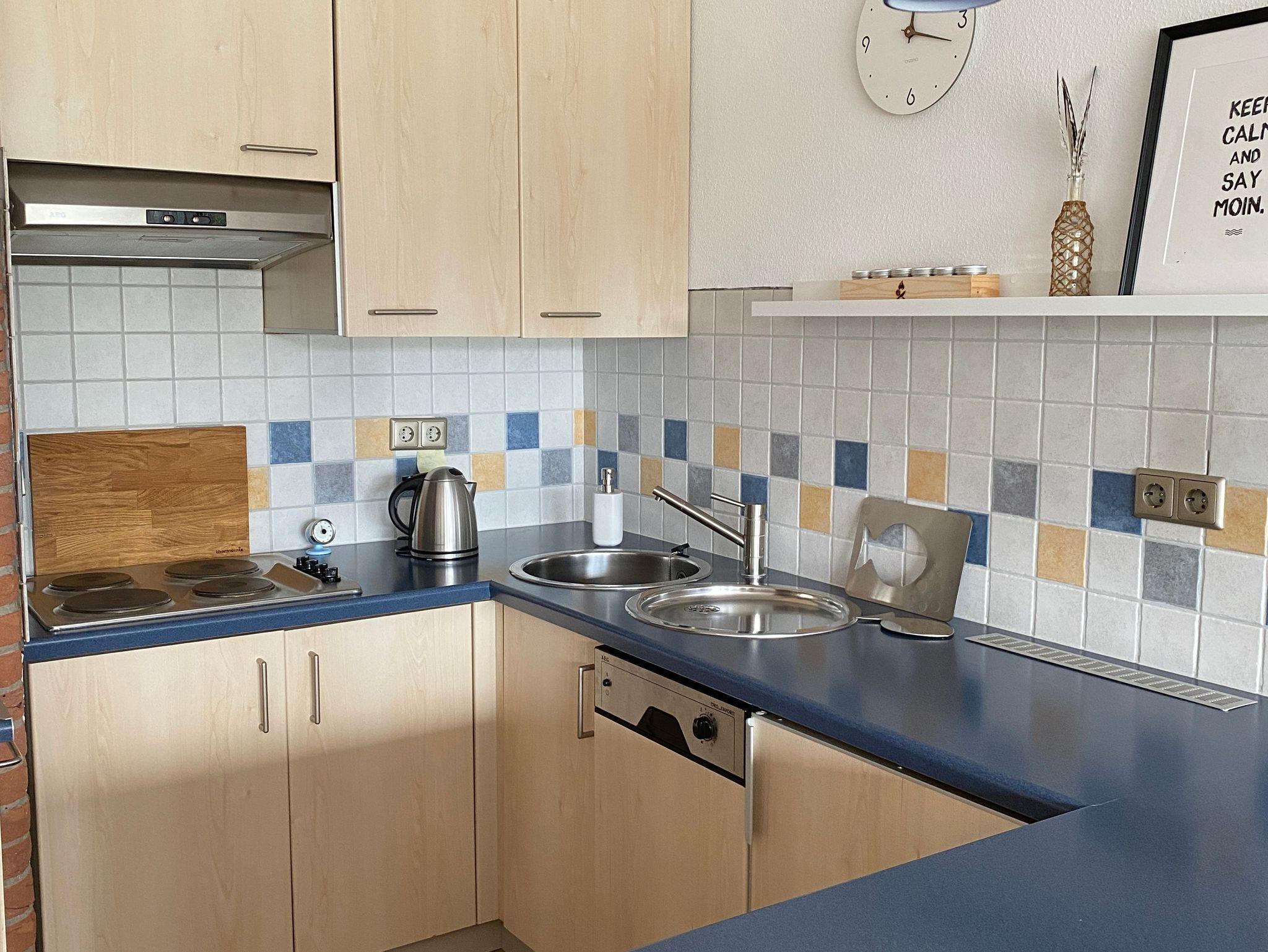 Die Küche verfügt über Kochplatten und einen Minibackofen, Wasserkocher, Kaffeemaschine, Toaster und ausreichend Ess- und Kochgeschirr, sowie über eine Spülmaschine.