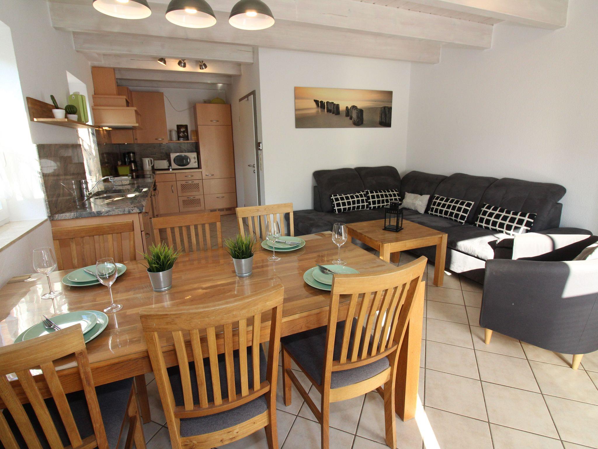 Sie wohnen in einem geräumigen Ferienhaus für bis zu 6 Personen auf ca. 90 m² Wohnfläche. Zwei Schlafzimmer mit Doppelbett und ein Schlafzimmer mitgetrennten Betten, davon eins mit 2. Kabel-TV und Stereoanlage - zusätzliche Verdunklungsrollos vorhanden. Das EG ist komplett gefließt und verfügt über eine Fußbodenheizung, 1. OG sowie das DG sind mit Laminatboden ausgelegt. Im Wohnraum befindet sich der voll ausgestatteteKüchenbereich mit: Geschirrspüler, Mikrowelle, Granitarbeitsplatte, gr. Kühlschrank, Herd mit Backofen und Glaskeramikkochfeld; separater Essplatz, und Sitzecke. LCD-TV und Radio mit CD-Player. Im EG sowie im 1. OG befindet sich jeweils ein Badezimmer mit Dusche undFenster. Die schöne Terrasse ist mit Gartenmöbeln bestückt. Aussenstellplatz für PKW.