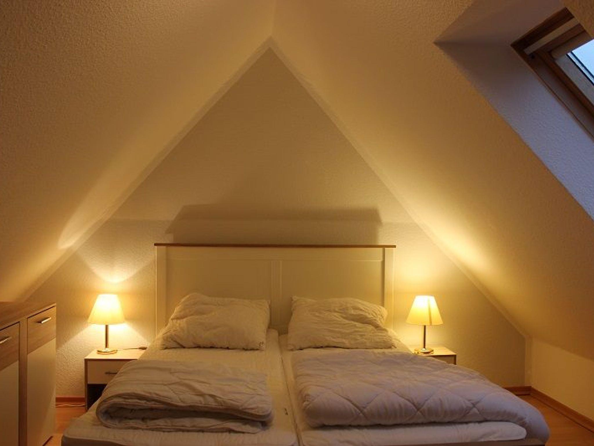 Das dritte Schlafzimmer im Spitzboden ist offen zum Treppenhaus.