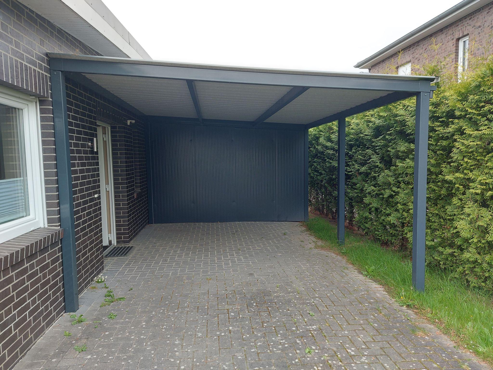 Zur Ferienwohnung gehört ein Carport und eine Holzhütte für Fahrräder.