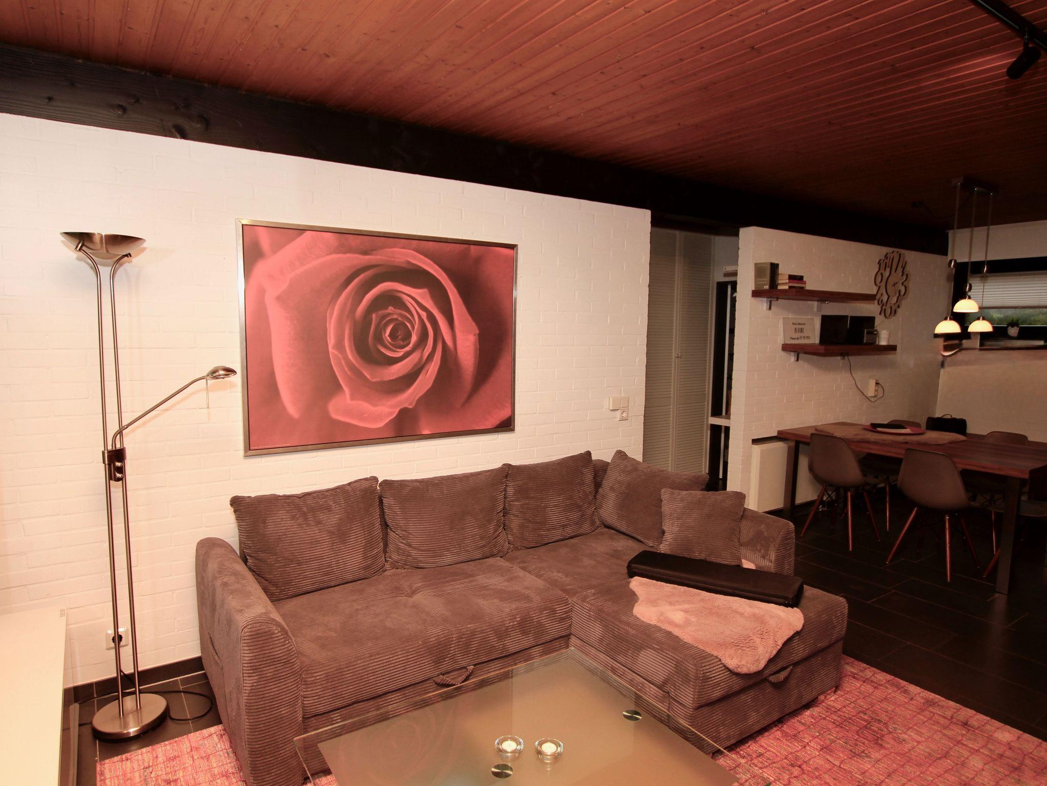 Das geschmackvoll und gemütlich eingerichtete Wohnzimmer sorgt im Ferienbungalow Nordseeliebe für eine Wohlfühlatmosphäre, zu der auch der für die Gäste zugängliche Kamin beiträgt. Es schließt sich eine Terrasse an, auf dem sich der Sonnenschein fast den ganzen Tag über genießen lässt.