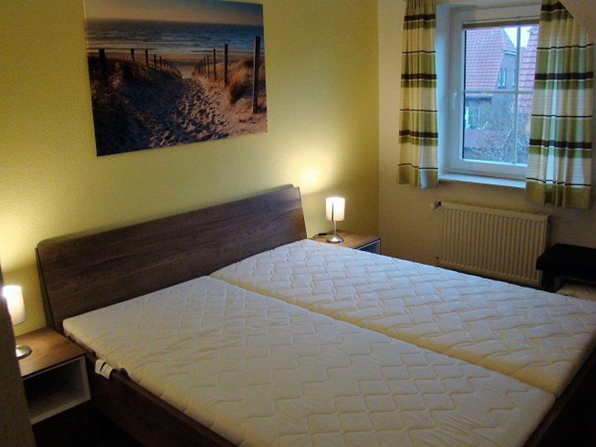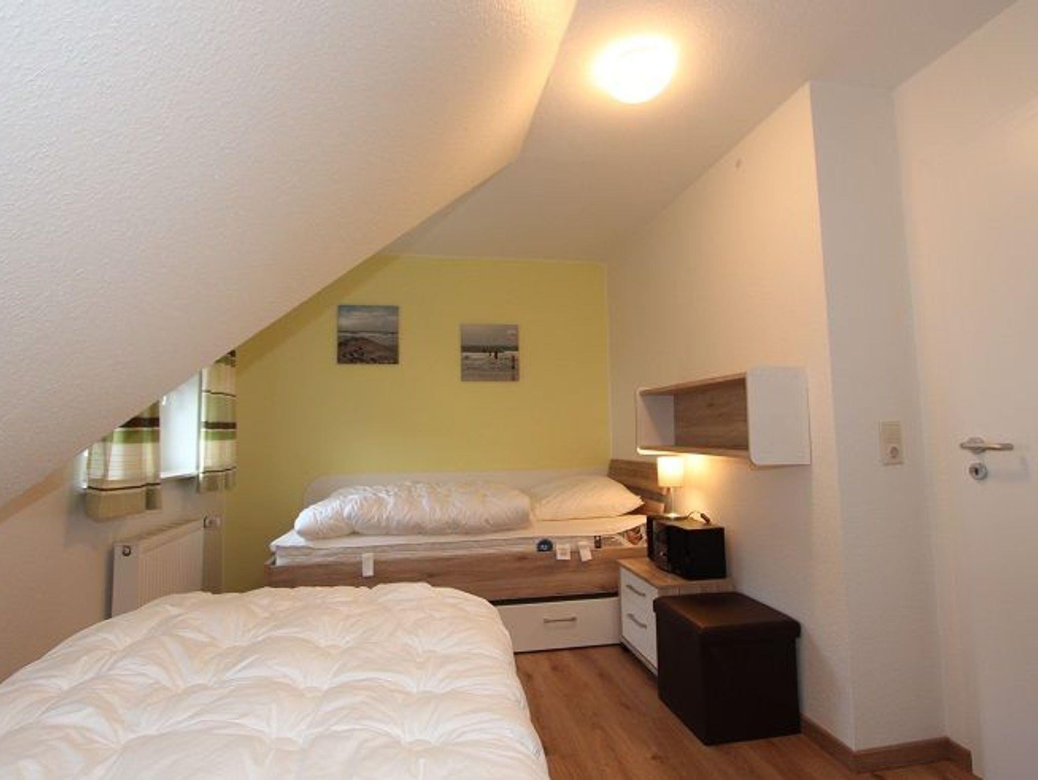 Im OG des Hauses befinden sich zwei Schlafzimmer, eines mit zwei Betten (Doppelbett) und eines mit drei Betten (davon ein Unterschubbett). Außerdem gibt es im OG ein Duschbad mit WC.