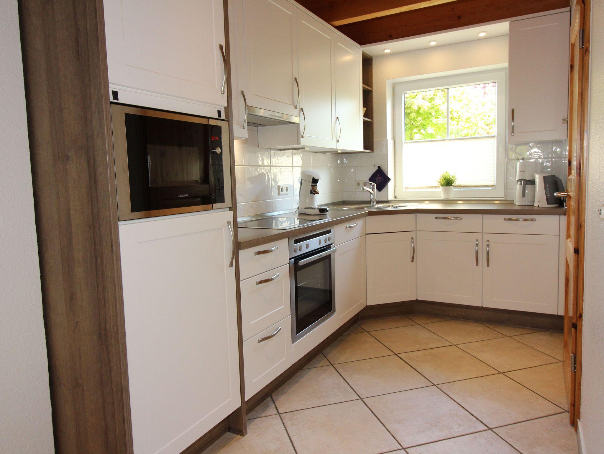 Im EG befindet sich die gut ausgestattete Einbauküche mit sich anschließendem Wohn-/Esszimmer mit Esstisch für bis zu 6 Personen. Die Küche bietet: Spülmaschine, Mikrowelle, Backofen, Ceranfeld, Kühlschrank mit Gefrierfach, Kaffeemaschine + Senseo Maschine, Backutensilien u.v.m.