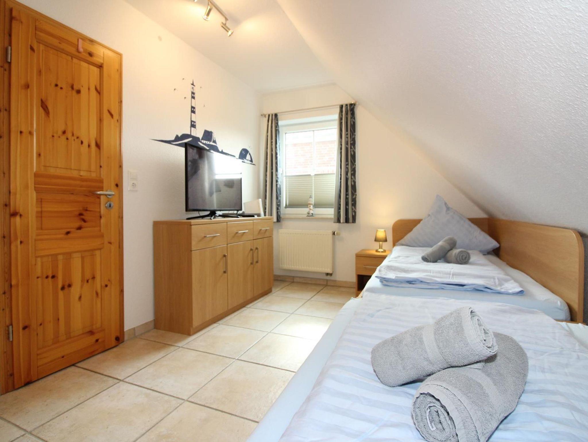 Im Kinderzimmer sind zwei Einzelbetten mit Nachtkonsolen, Schrank sowie einem Sideboard mit Flachbild-TV.