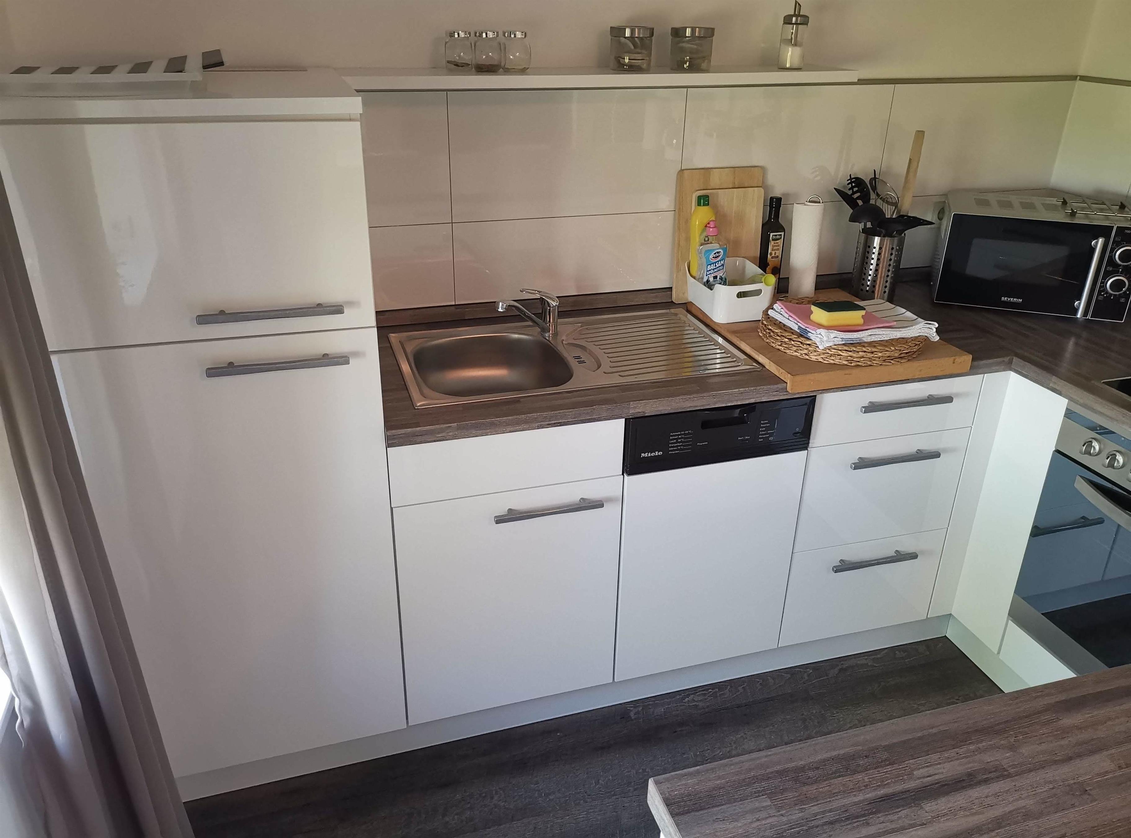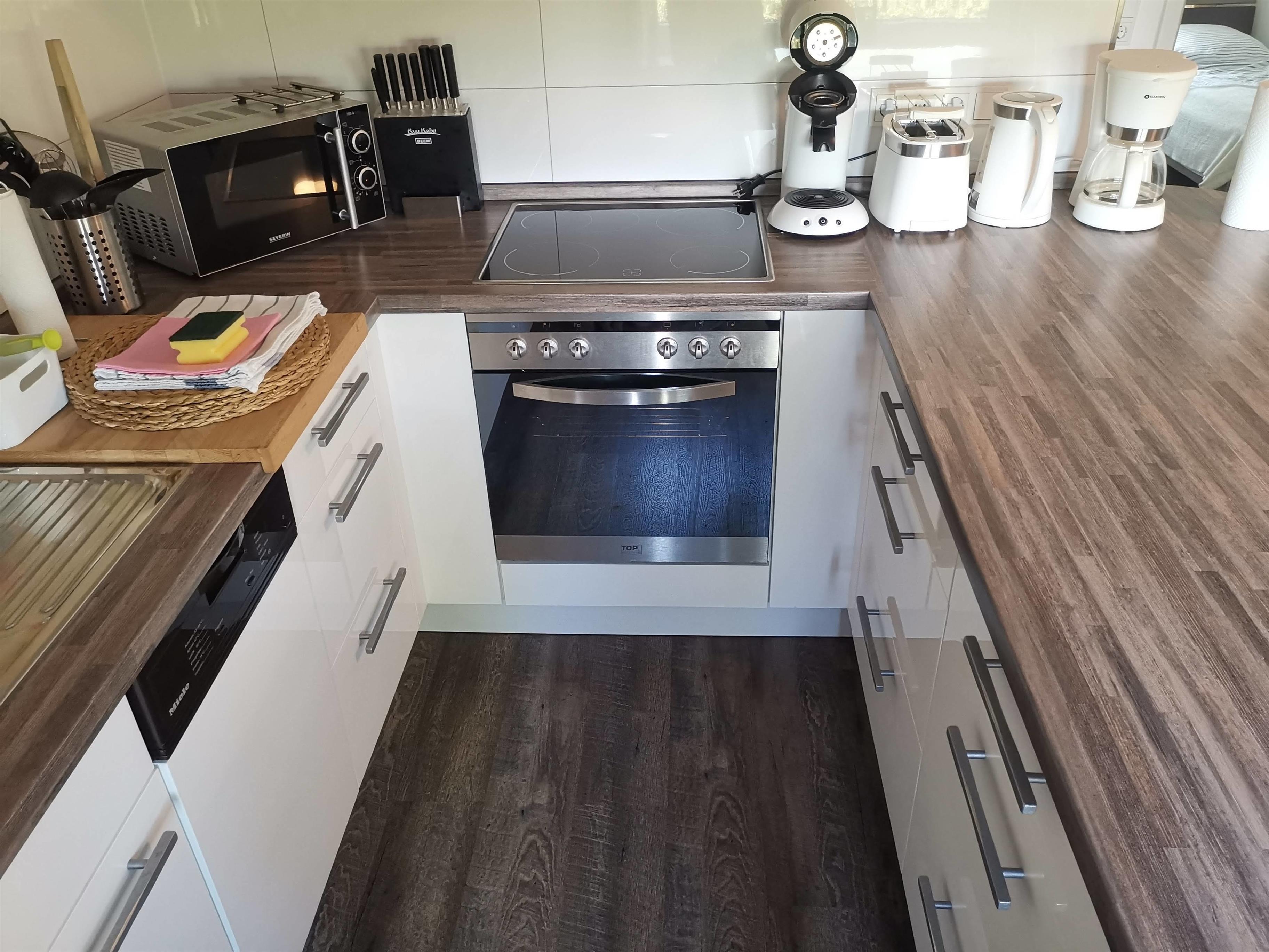 Kühlschrank mit kleinen Gefrierfach, Spülmaschine, Kaffeemaschine, Wasserkocher, Toaster und Mikrowelle