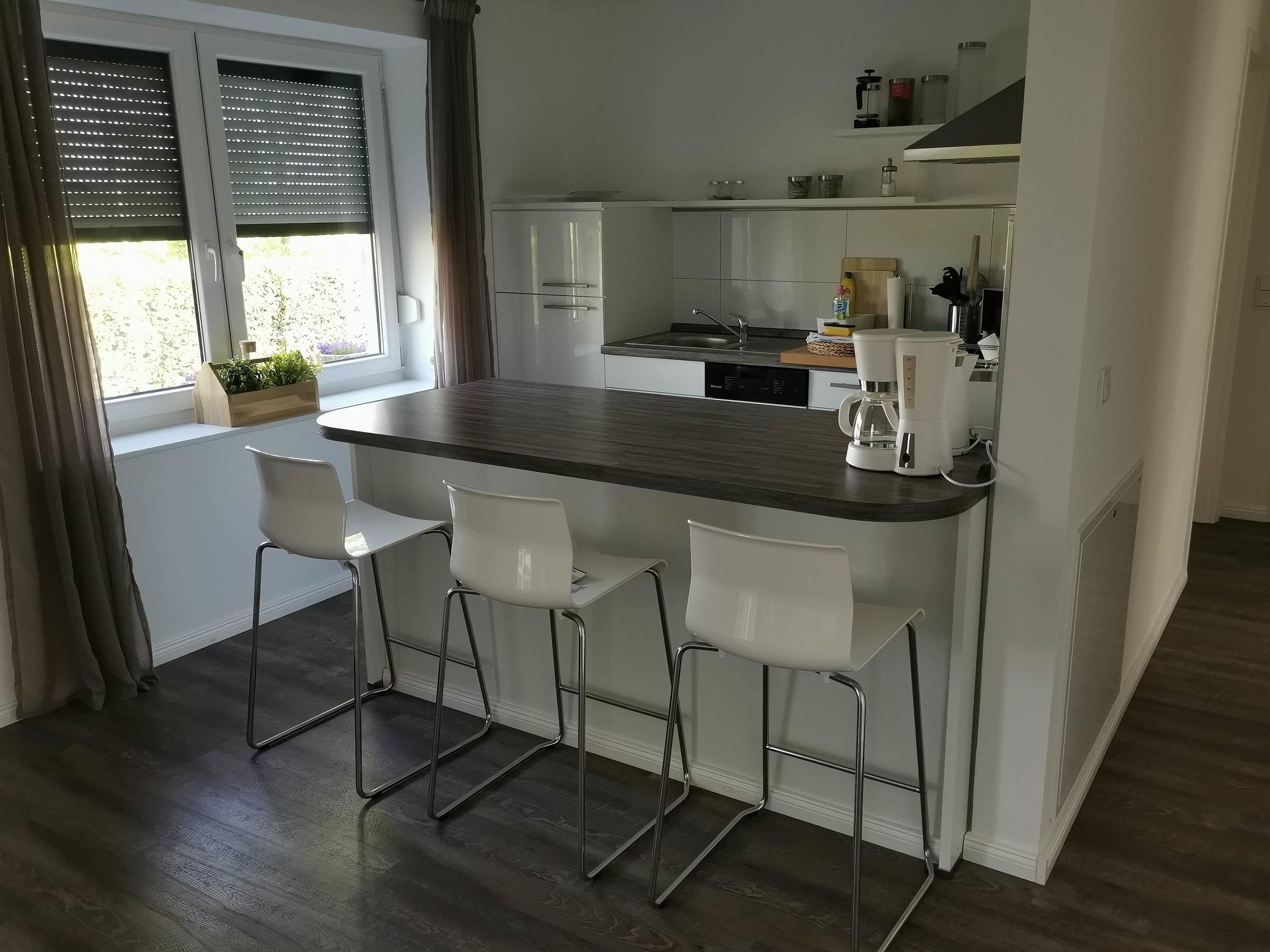 Die moderne Küche verfügt über einen Tresen als Essbereich mit drei Stühlen und ist mit Backofen, Ceranfeld,