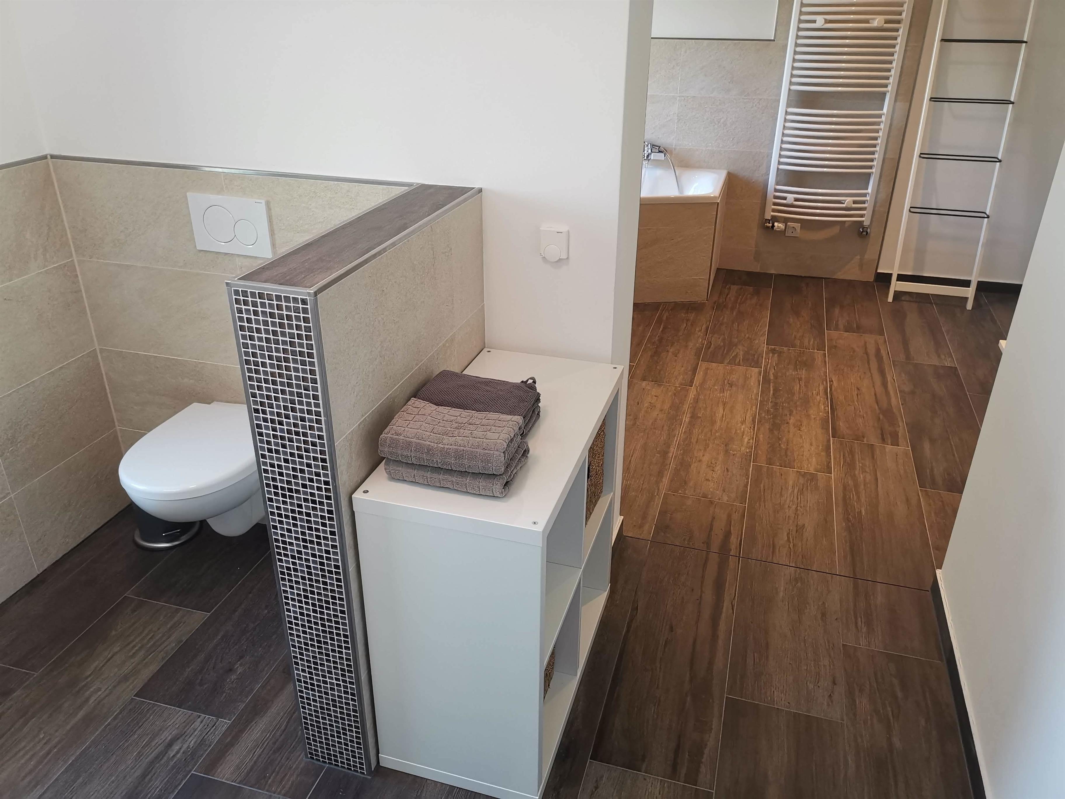Die begehbare barrierefreie Dusche und die Eckbadewanne sind im zweiten Raum.