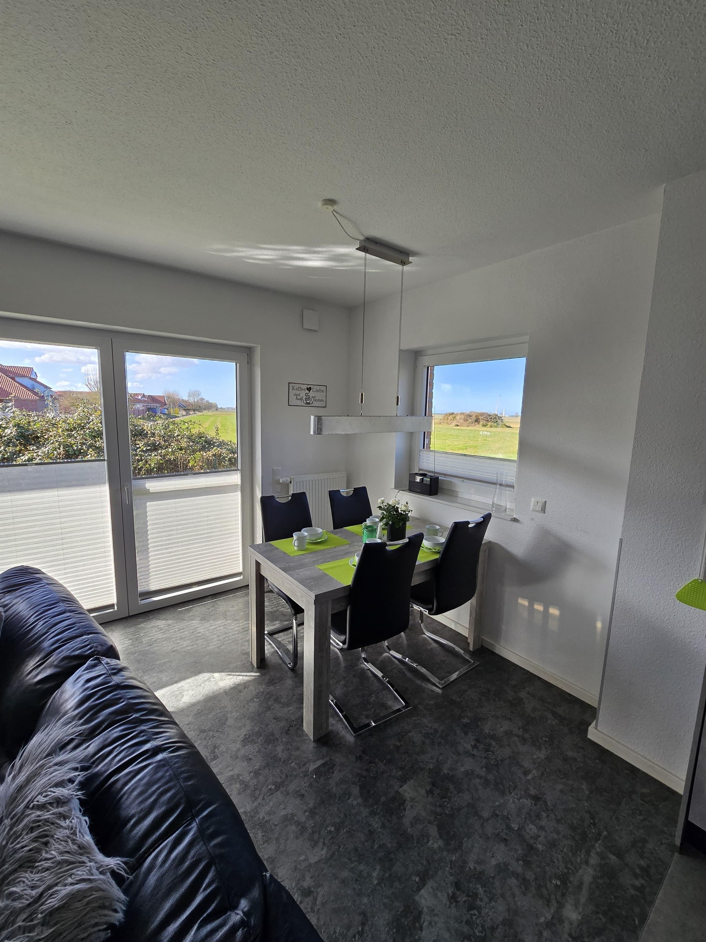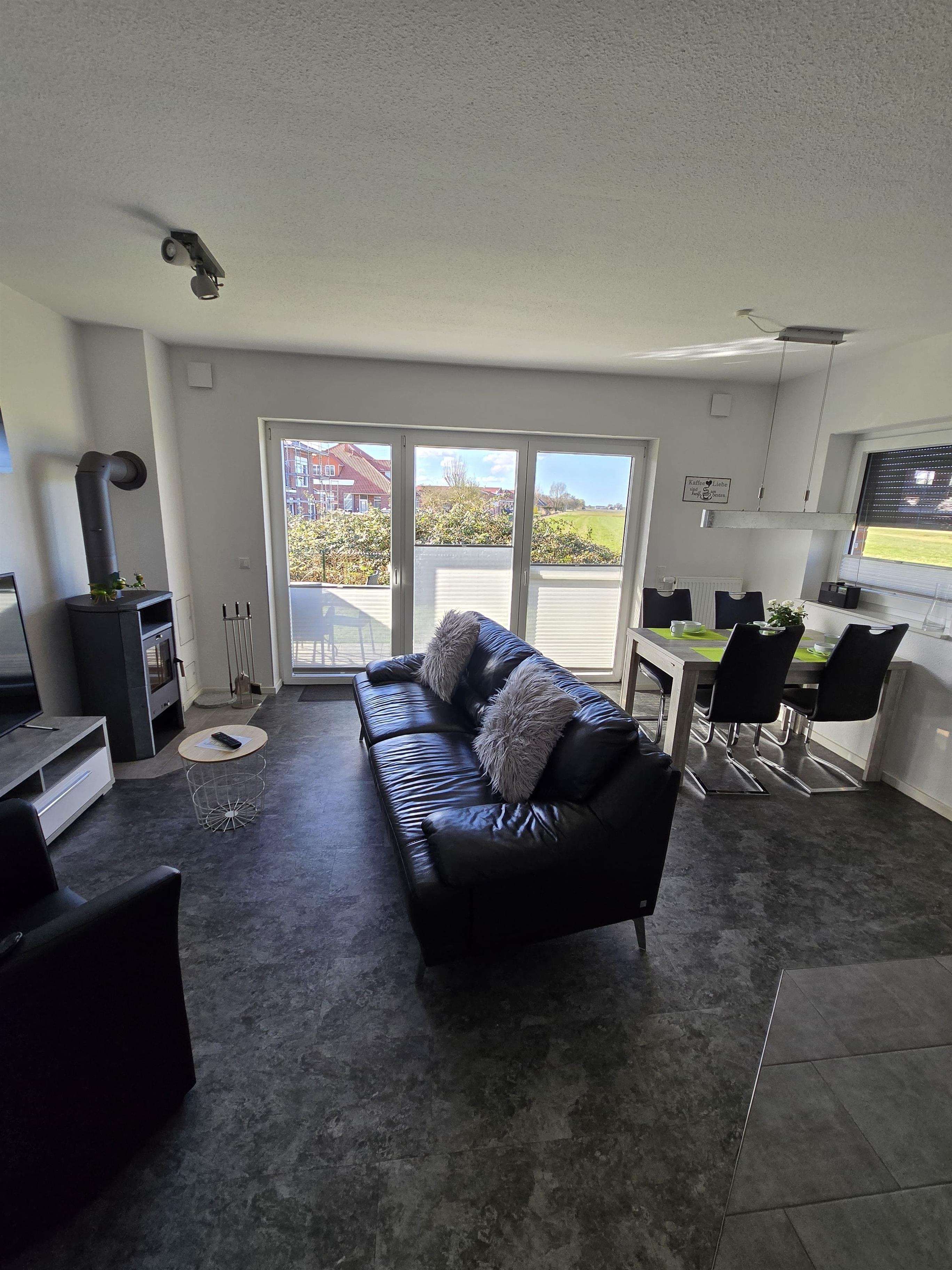 In der unteren Etage mit einem offenen Wohn/Essbereich mit Sofa und einem Sessel zum relaxen, einem gr. Flachbildschirm, einem Kaminofen für behagliche Wärme, einer vollausgestatteten Küche (Kaffeemaschine, Wasserkocher, Toaster, Geschirrspüler, Backofen etc), einem Gäste-WC, kl. Abstellraum und in der oberen Etage befinden sich ein Schlafzimmer (Boxspringbett 180 x 200) mit wunderbarem Balkon und Blick auf den Deich und einem Kinderzimmer (Boxspringbett 160 x 200), im SZ und Gästezimmer gibt es jeweils einen Flachbildschirm), ein Bad mit eigener Sauna. Geniessen Sie nach einem Saunagang die Ruhe und den Ausblick über Felder und Wiesen bis hin zum Deich.