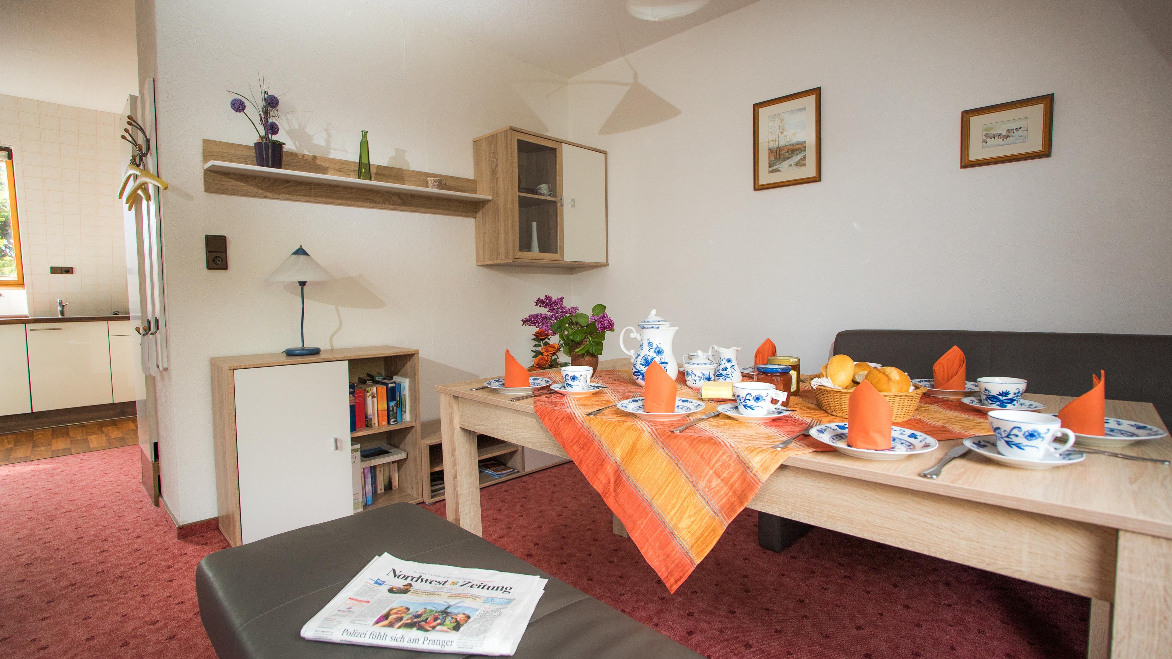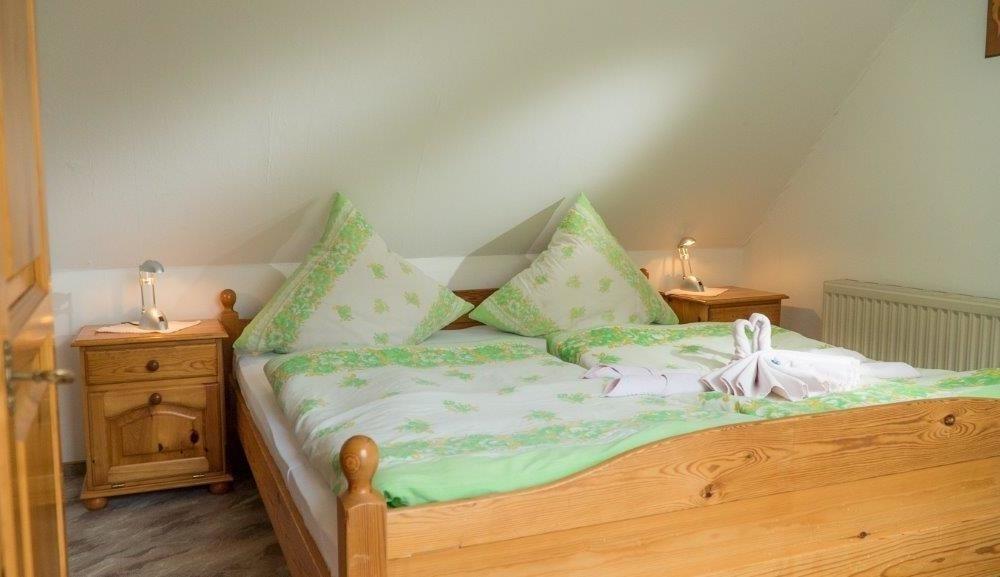Die Ferienwohnung liegt im Obergeschoss und verfügt über ein komfortables Wohnzimmer mit Essecke, gemütlicher Sitzecke, Schwedenofen und Küchenzeile, drei Doppelzimmer und einem Dusch-Bad.