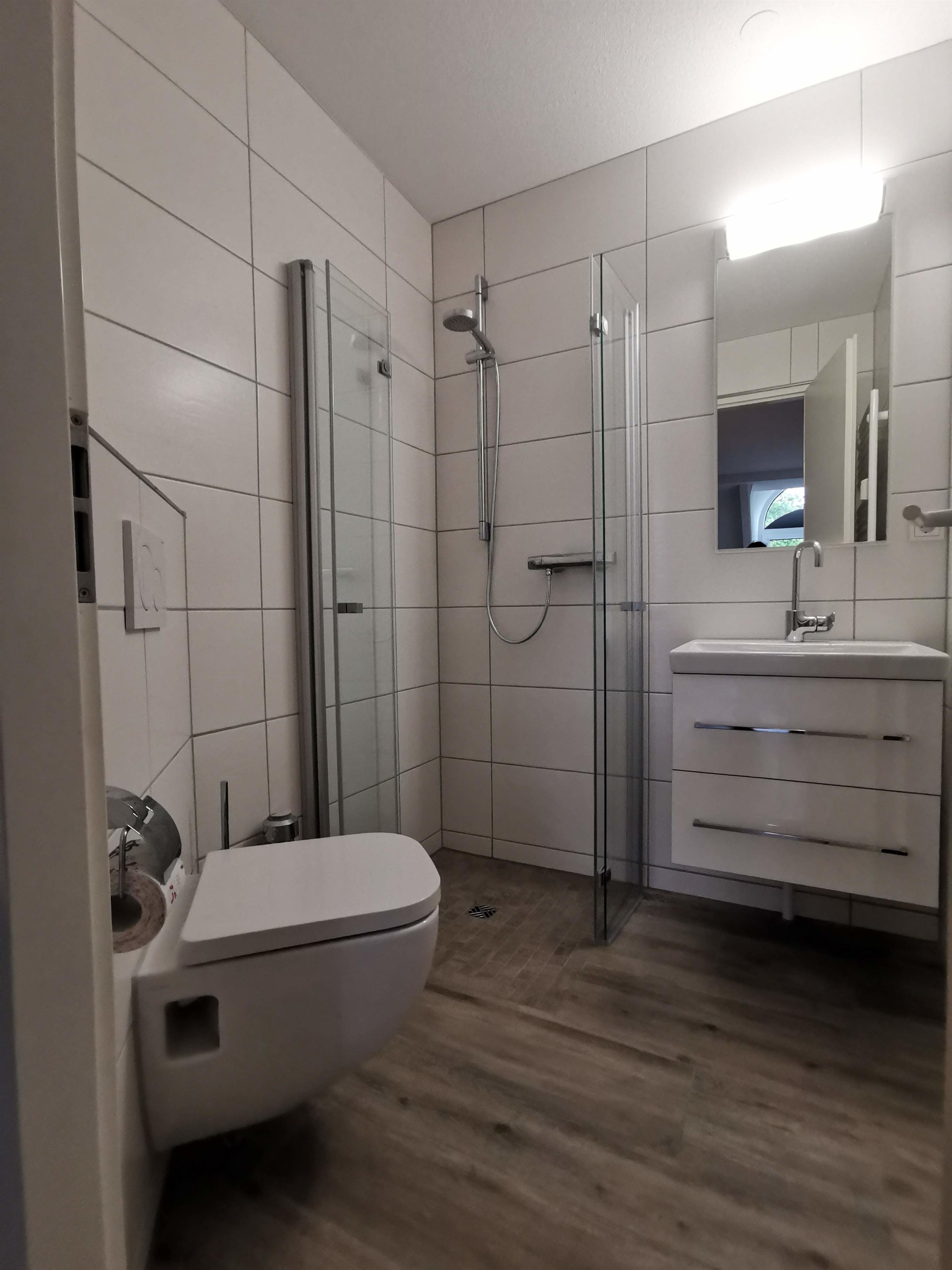 Das Bad verfügt über WC, Dusche und Waschtisch mit Spiegel