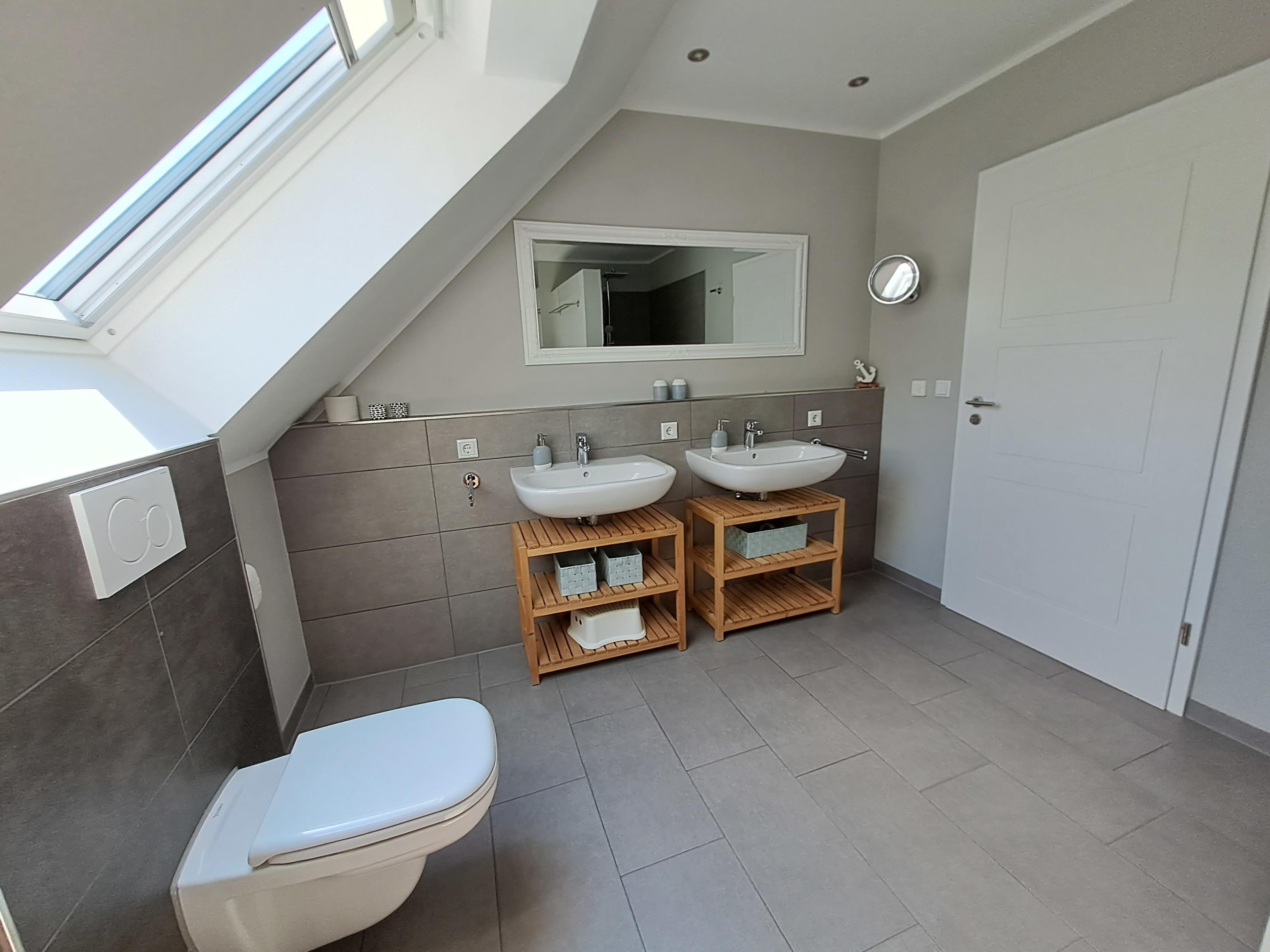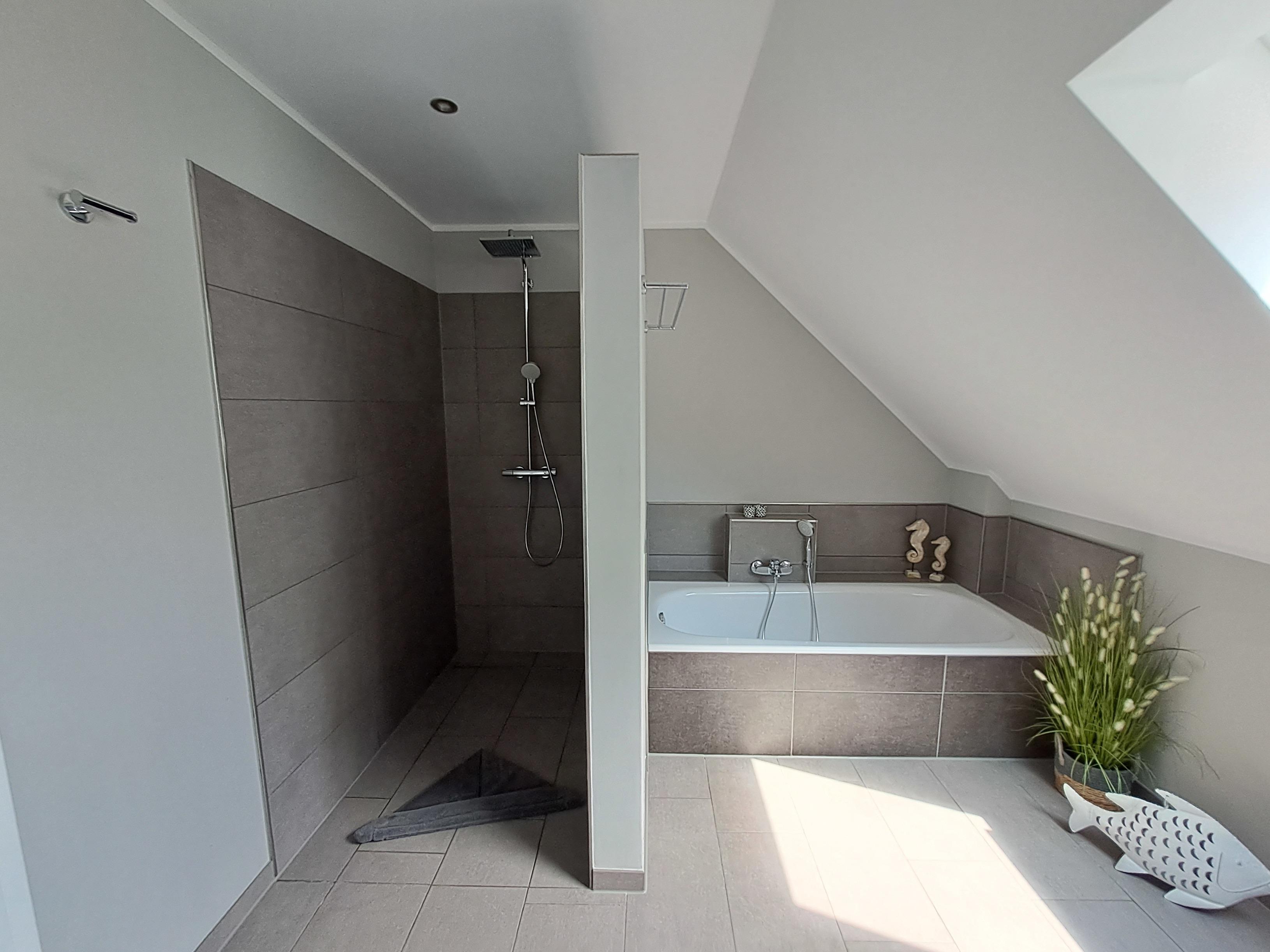 Im OG befinden sich 2 Schlafzimmer mit Doppelbetten(180x200), Smart TV und viel Stauraum. Ein weiteres Schlafzimmer verfügt über zwei Einzelbetten (100x200). In allen Schlafzimmern befindet sich ein Insektenschutz. Das moderne Tageslichtbad besticht durch eine große begehbare Rainshowerdusche, Badewanne und einen Doppelwaschtisch. Zusätzlich befindet sich im EG ein zweites Bad mit WC und begehbarer Rainshowerdusche.