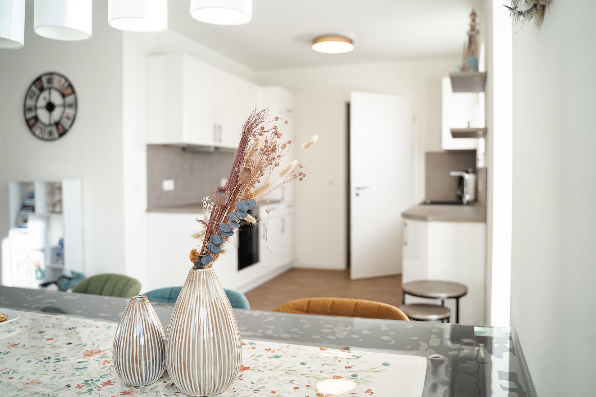 Neben einem Smart TV (Disney Plus und RTL Premium Plus inkl) findet man im Wohn- und Essbereich eine komplett ausgestattete Küche, einen Hochstuhl, Bücher, Spiele für groß und klein, einen Tisch mit zwei Stühlen für die kleinen Gäste, sowie Flyer mit diversen Ausflugsmöglichkeiten.