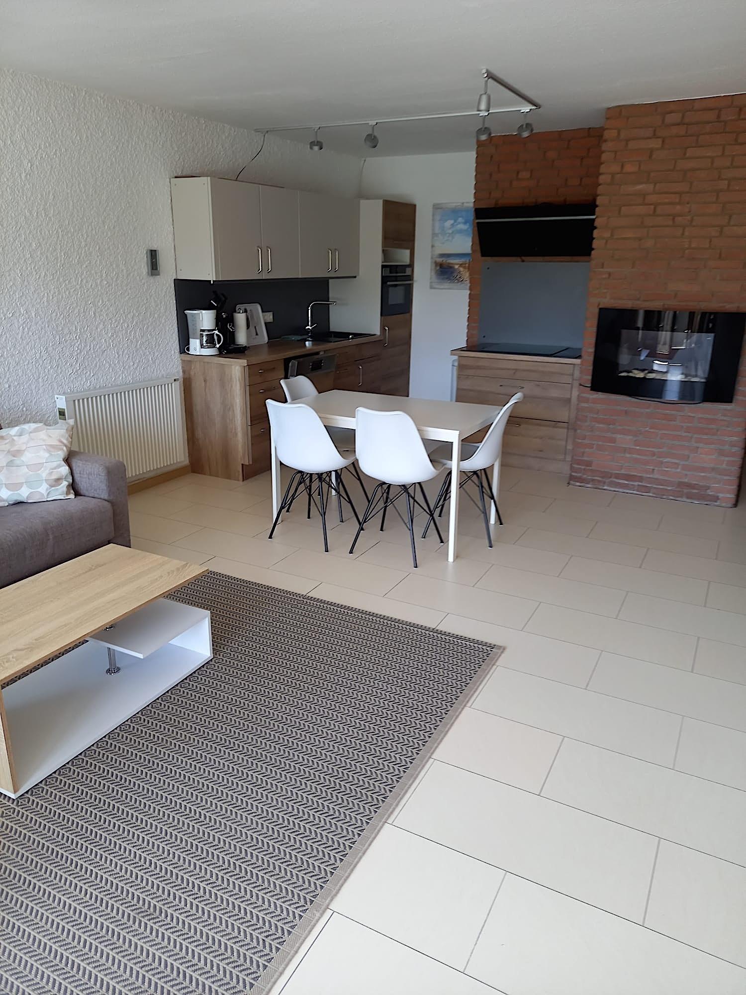 Das Apartment (52qm) bietet einen großzügigen Wohnbereich mit Laminatfußboden in Fliesenoptik, eine offene Küche und eine Essecke. Auf einem Schlafsofa zum Aufklappen mit Lattenrost (140 x 200) im Wohnbereich finden bis 2 Personen gemütliche Nachtruhe. Bei schlechtem Wetter gibt es Fernsehen in HD, Bücher und Gesellschaftsspiele. Ein Notfall- u. Verbandskasten ist vorhanden.
