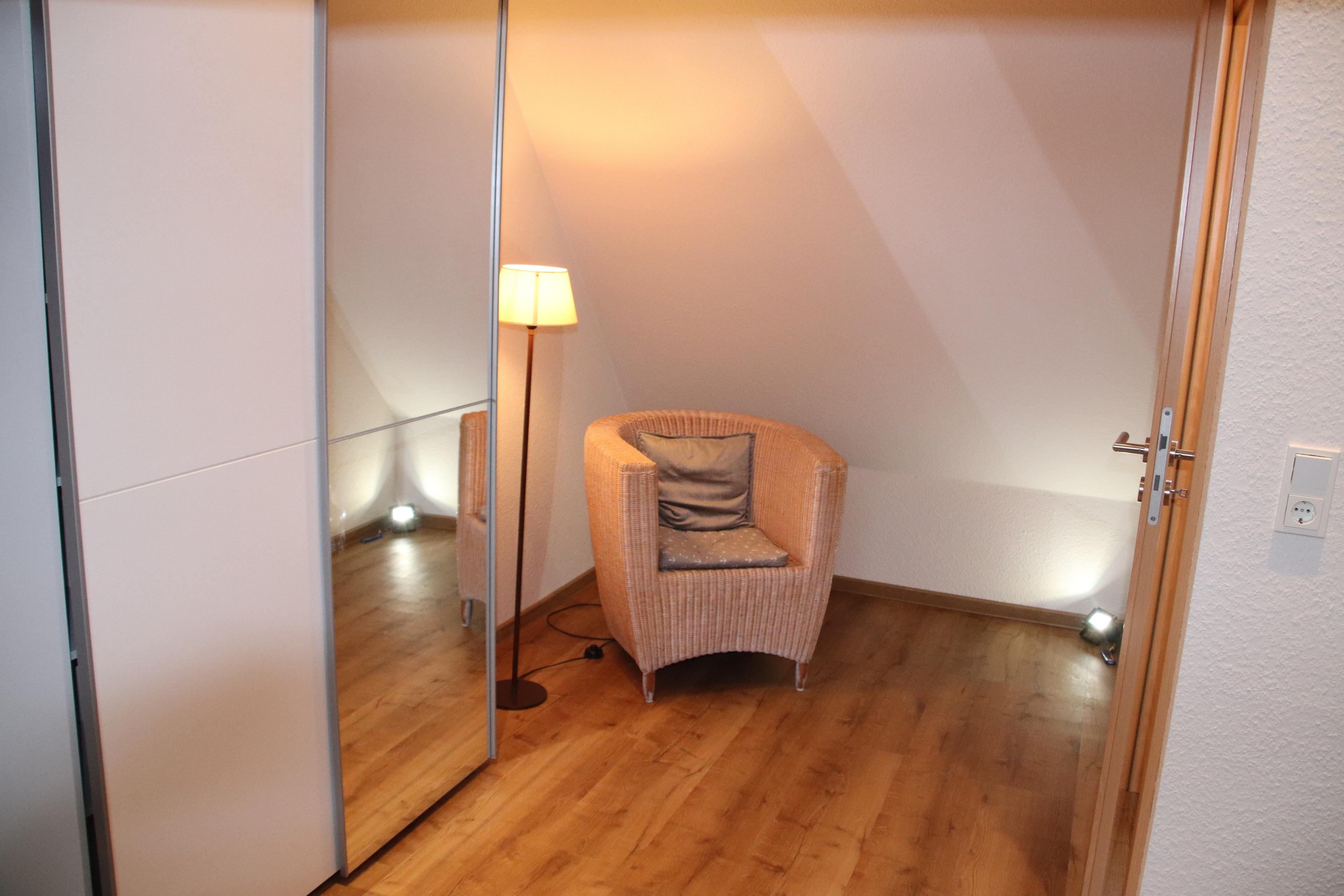 Dachgeschoss: Sehr großes, modernes Schlafzimmer mit Doppelbett, Fernseher, Schrank, und einer gemütlichen Leseecke.