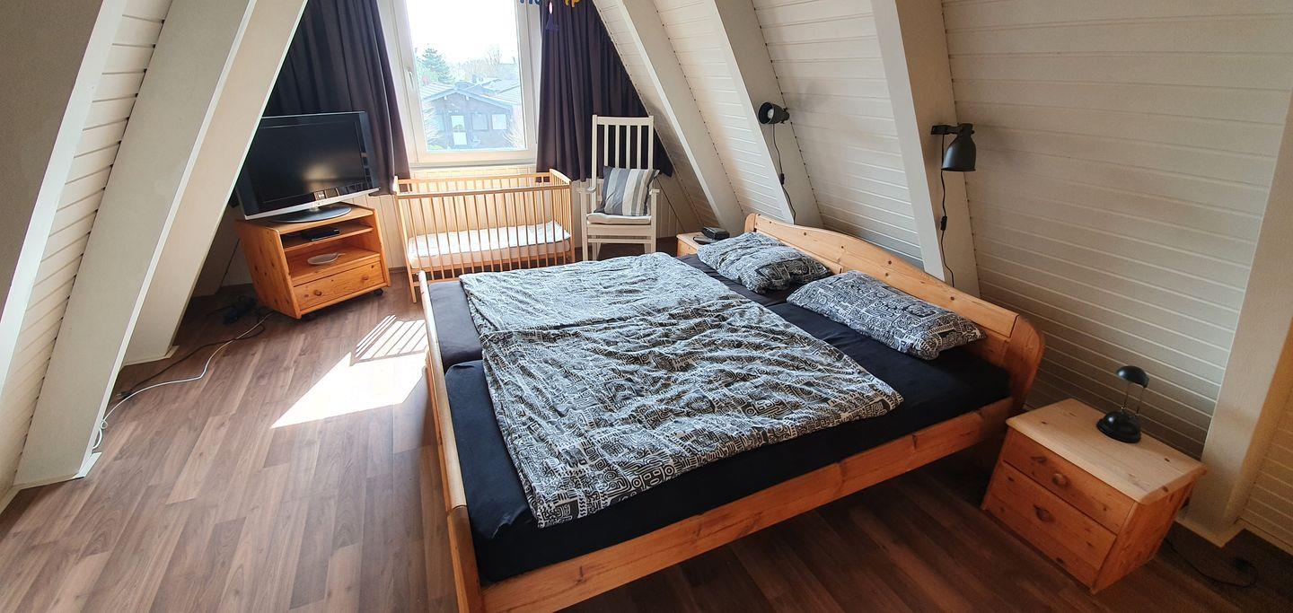 Ein Zimmer ist mit einem Babybett und einem Kinderhochstuhl ausgestattet, sodass auch die kleinen Gäste nicht zu kurz kommen.