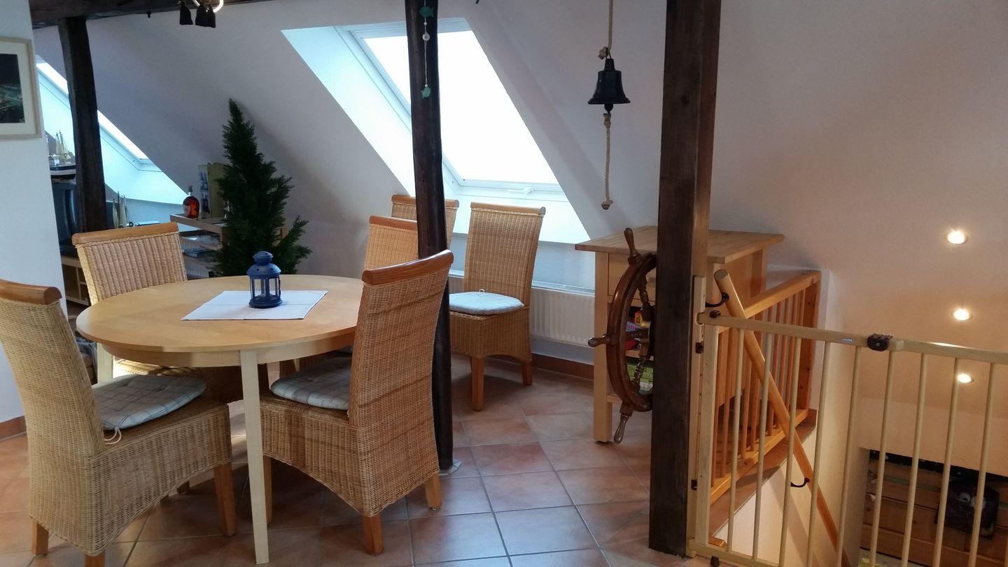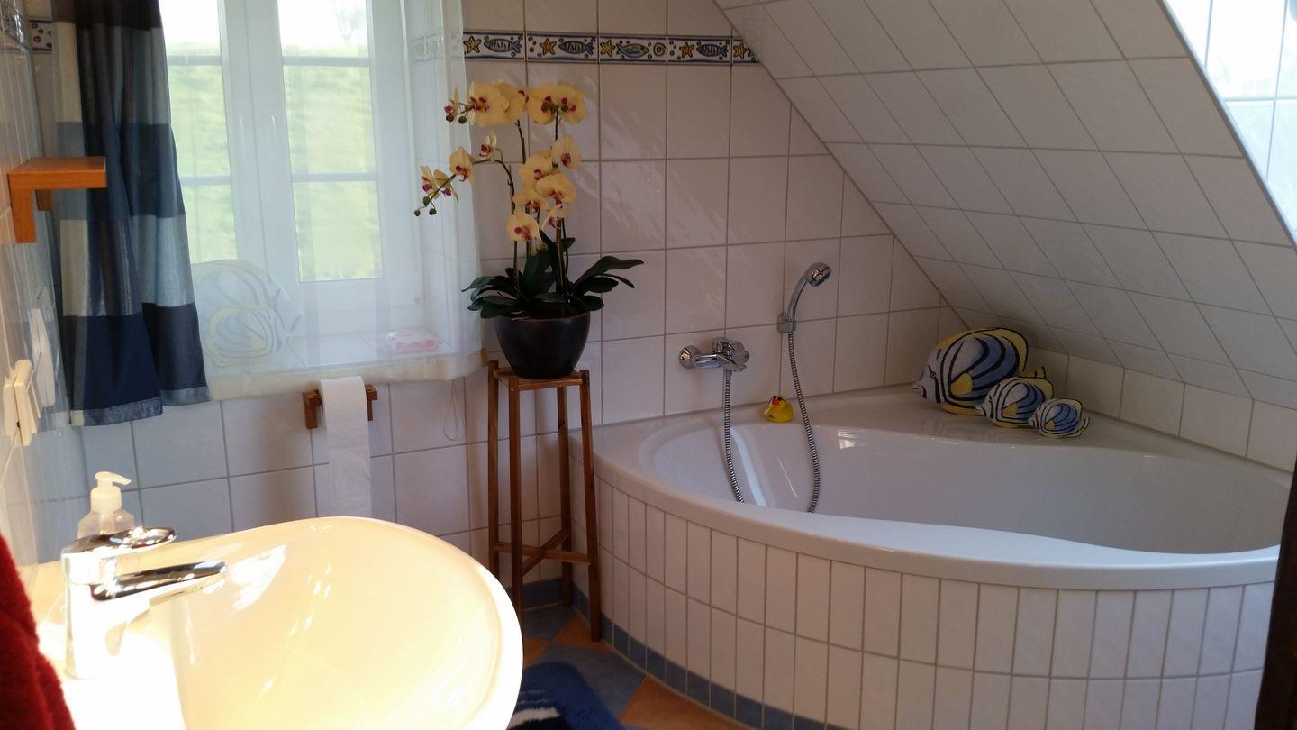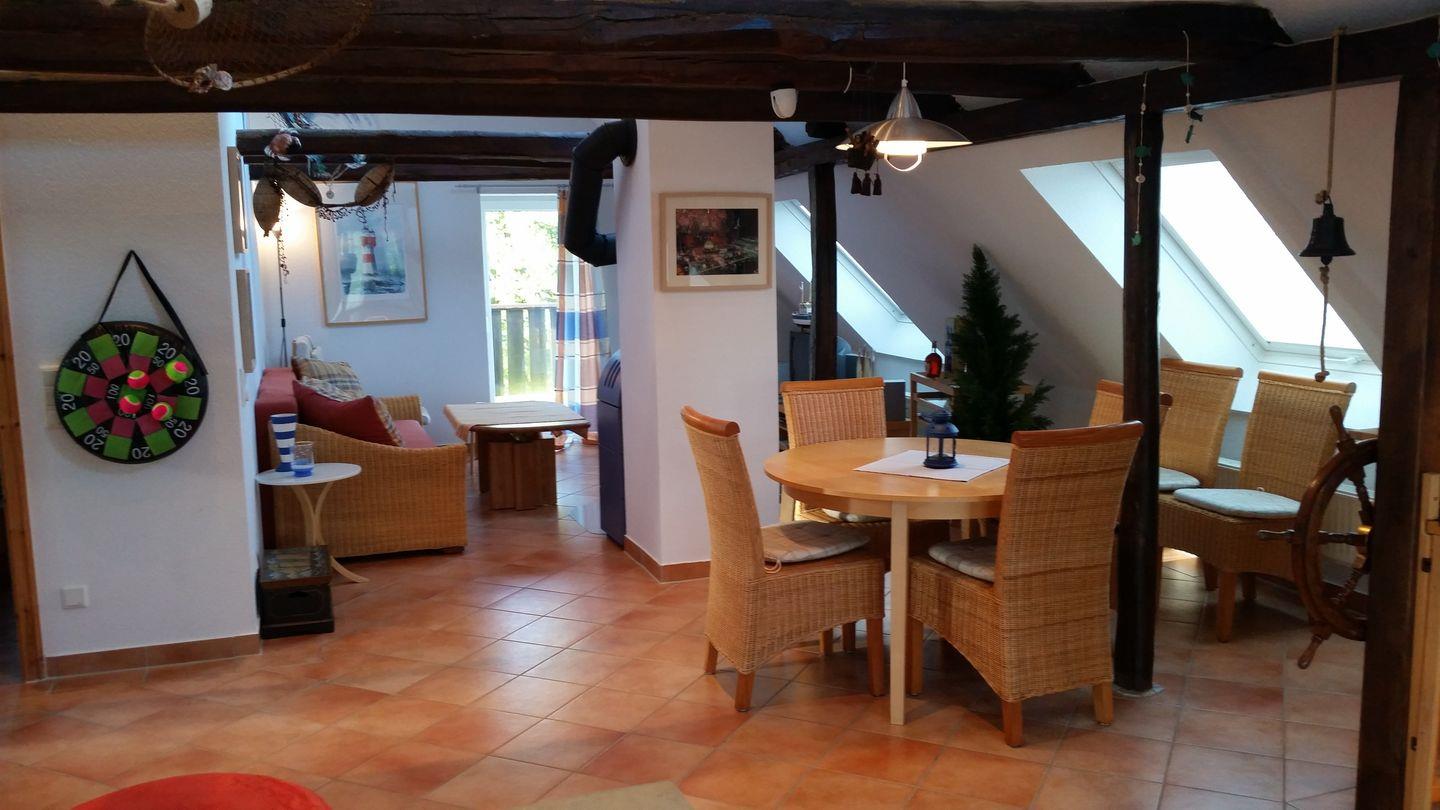 Diese gemütliche Ferienwohnung befindet sich im 1. Obergeschoß eines 2-Parteien-Hauses. Das Erdgeschoss wird ebenfalls als Ferienwohnung vermietet. Die Wohnung hat einen großen und offen gestalteten Wohn- Eß- und Kochbereich, einen Schlafraum mit einem Doppelbett und ein modernes Tageslichtbad mit einer großzügigen Eck-Badewanne, eine separate Dusche, ein großzügiges Waschbecken und ein wandhängendes WC. (Bitte Bettwäsche und Handtücher mitbringen. Optional können Sie diese kostenpflichtig dazubuchen).